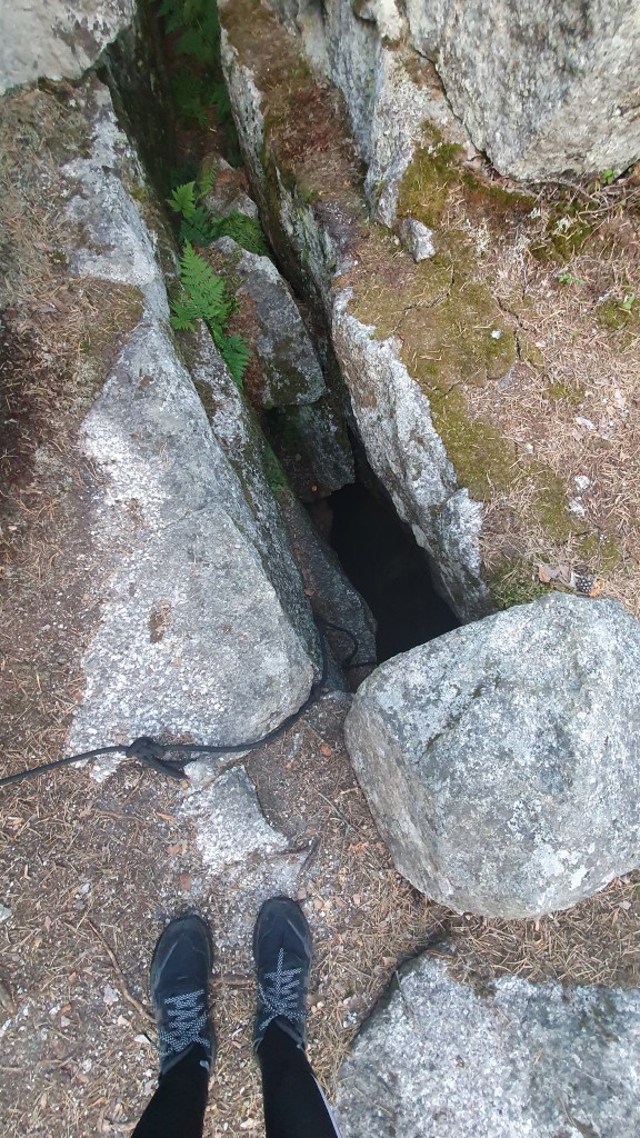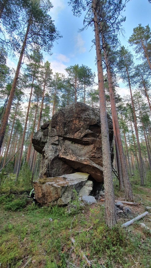 Siirtolohkare oli helppo spotata ja sen päälle veivät kätevät tikkaat. Luola sen sijaan vei hetken löytää, mutta sekin löytyi lopulta helposti, kun etsi maastosta köyttä. Luolan molempiin suihin vei köysi. Luola oli sellainen malliltaan, että ilman kapuamista sinne ei päässyt pois eikä sisään.