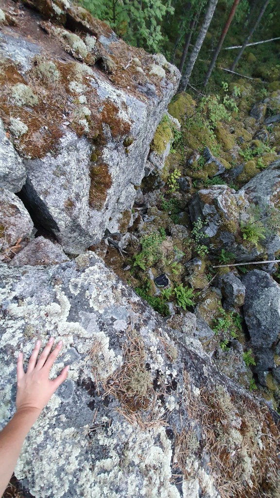 Luolan jälkeen kävimme vielä tutkimassa kallioseinämän ja päätimme ottaa viimeiset adrenaliinipiikit ja boulderoimme sen ylös. Kuvassa referenssinä meidän musta reppu alhaalla. Lähdettyämme mestoilta huomasimme vielä Maastokartoista, että lähellä olevalla rannalla olisi ollut laavu. Harmitti, ettei tajuttu käydä tsekkaamassa sitä, mutta ehkä ensi kerralla! Paikka oli niin mukava fiilikseltään, että ryhdyttiin suunnittelemaan sinne riippumattojen kanssa yöpymistä.