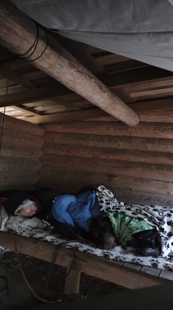 Teimme leirin kodan viereiselle laavulle. Mari-Anne laittoi pedin itselleen ja koirille laavun nurkkaan. Laavulla oli hyvin molemmin puolin tilaa, että nukkumaan olisi mahtunut vielä toinen lössi koirineen. Itse viritin riippumattoni laavun viereiseen puuhun ja laavun kattoparruun. Söimme iltapalat ja annoimme koirille iltaruuat. Koirille laitettiin haalarit ja manttelit päälle ja muutama peitto, kun ne olivat asettuneet petiin. Koirat rauhouttuivat heti, kun tajusivat että tähän jäädään yöksi. Yölämpötilaksi oltiin luvattu kahdeksan astetta plussaa, mutta keli tippuikin yhteen asteeseen. Kova tuuli kävi riippumattoon. Underquilt eli alushuopa olisi ollut kovaa huutoa, mutta sellaista en omistanut. Cimbi alkoi yöllä palella ja peittelin koirat kaikilla ylimääräisillä vaatteillani. Välillä palelin itse inhottavassa tuulessa ja välillä nukahdin. Tuuli onneksi laantui aamua kohden ja viimeistään aamuyöstä nukuin jo sikeästi ilman herättäviä vilunväristyksiä. Yö meni rauhallisesti koirien kanssa.