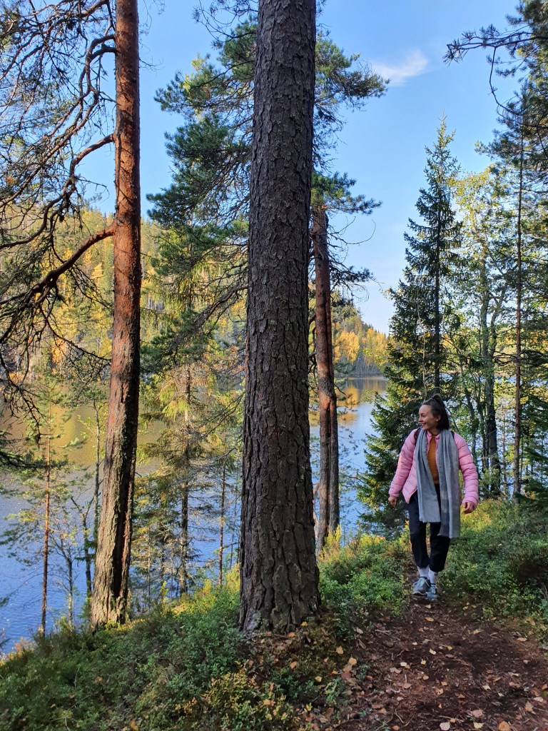 Heräsimme äitin luota sumuisena aamuna, joimme aamukahvit terassilla, pakkasimme ja lähdimme matkaan. Saavuimme aamupäivästä parkkipaikalle, joka oli aivan tupaten täynnä autoja. Autoja oli parkissa lähemmäs viitisenkymmentä autoa yhteensä, jos lasketaan tien varrelle jätetyt autot mukaan. Kyllä hirvitti, että miten sinne metsikköön mahtuu ohjatuille poluille tallustelemaan, kun on sakkia niin paljon. Tuntui myös hassulta ajaa puolitoista tuntia korpeen, mikä onkin ihan täynnä ihmisiä. Mutta ihan oikeasti, Etelä-Konneveden kansallispuisto oli niin äärettömän kaunis, että ei ihmekkään, kun koko paikka kuhisee sakkia.
