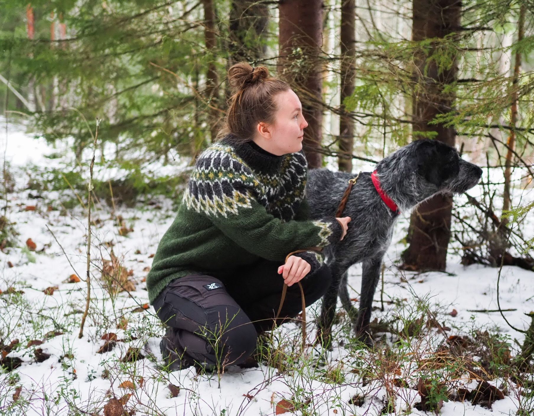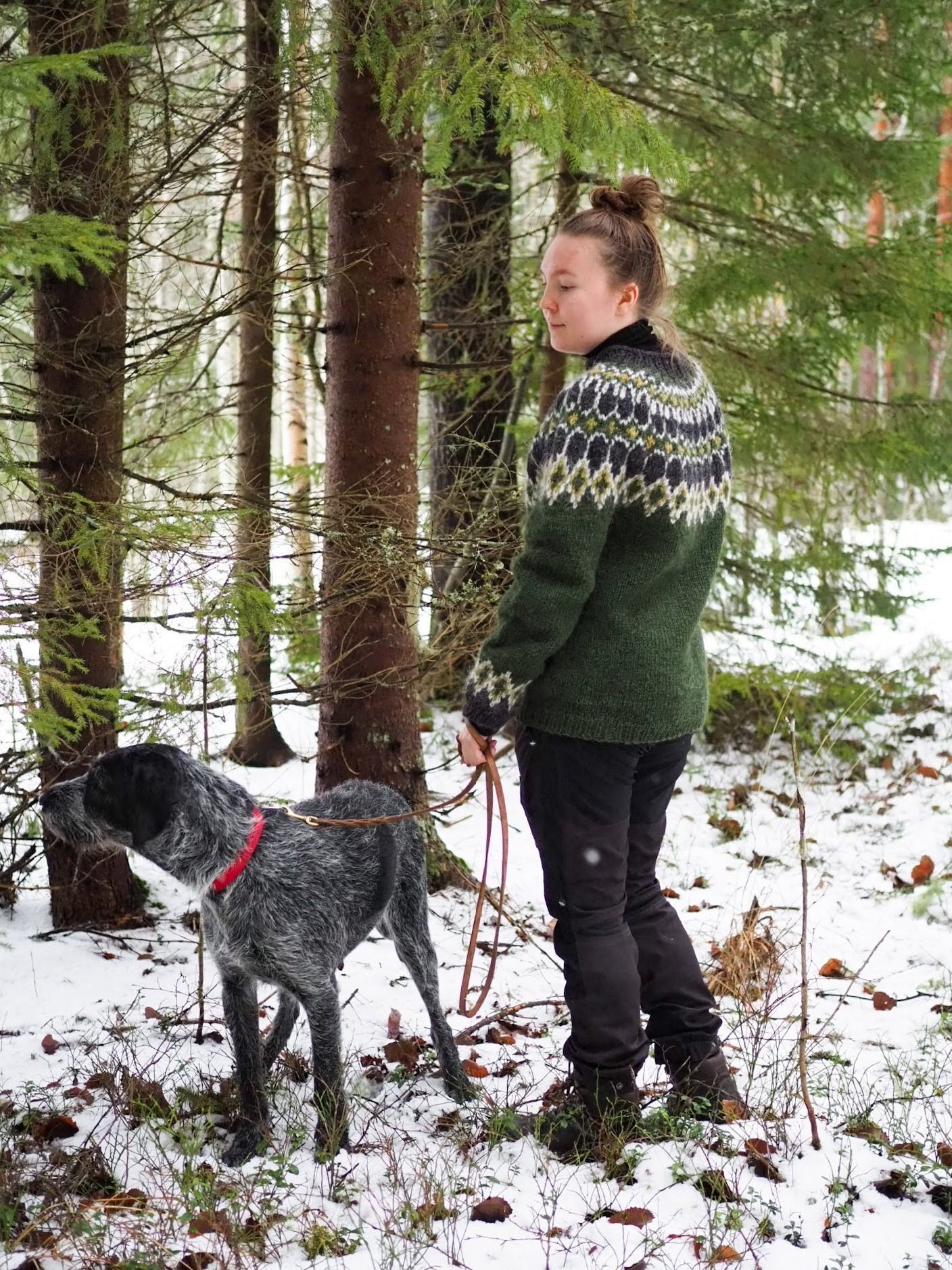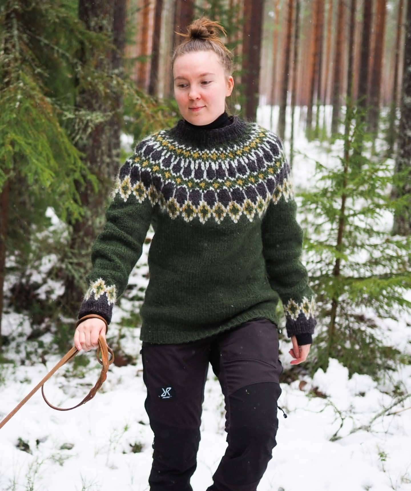 Neuleen valmistuttua se oli vietävä heti mummopuolelle näyteltäväksi, samoin isälle ja äitille. Someen oli laitettava kuvat ja kaikille piti hehkuttaa, Elli painotti. Sen tein. Sitten seuraavana päivänä se pääsikin siihen tarkoitukseen, mihin se oli tehty, eli eräilyhommiin, kun lähdin uudeksi vuodeksi sen kanssa alkeelliselle mummonmökille. Oli muuten lämmin villapaita ja ilman sitä en olisi edes mestoilla selvinnyt, kun hemmetin kamina lämpesi niin hitaasti. Siitä lisää seuraavassa postauksessa, mutta tämä uusi luomus toimi täydellisesti, oli lämmin, mukava ja kaunis. Sellaista pientä lämmintä luksusta tuonne metsikköön.