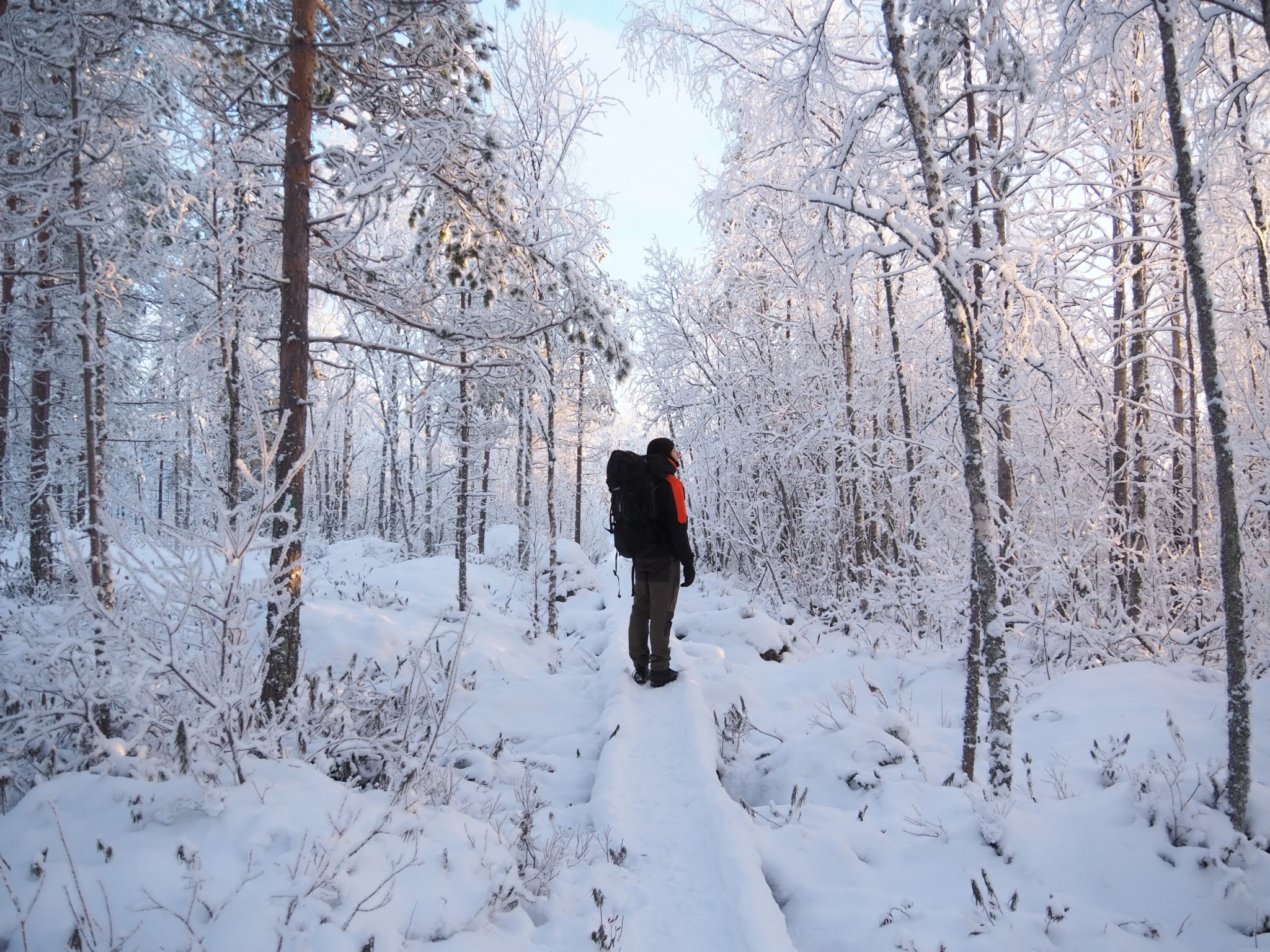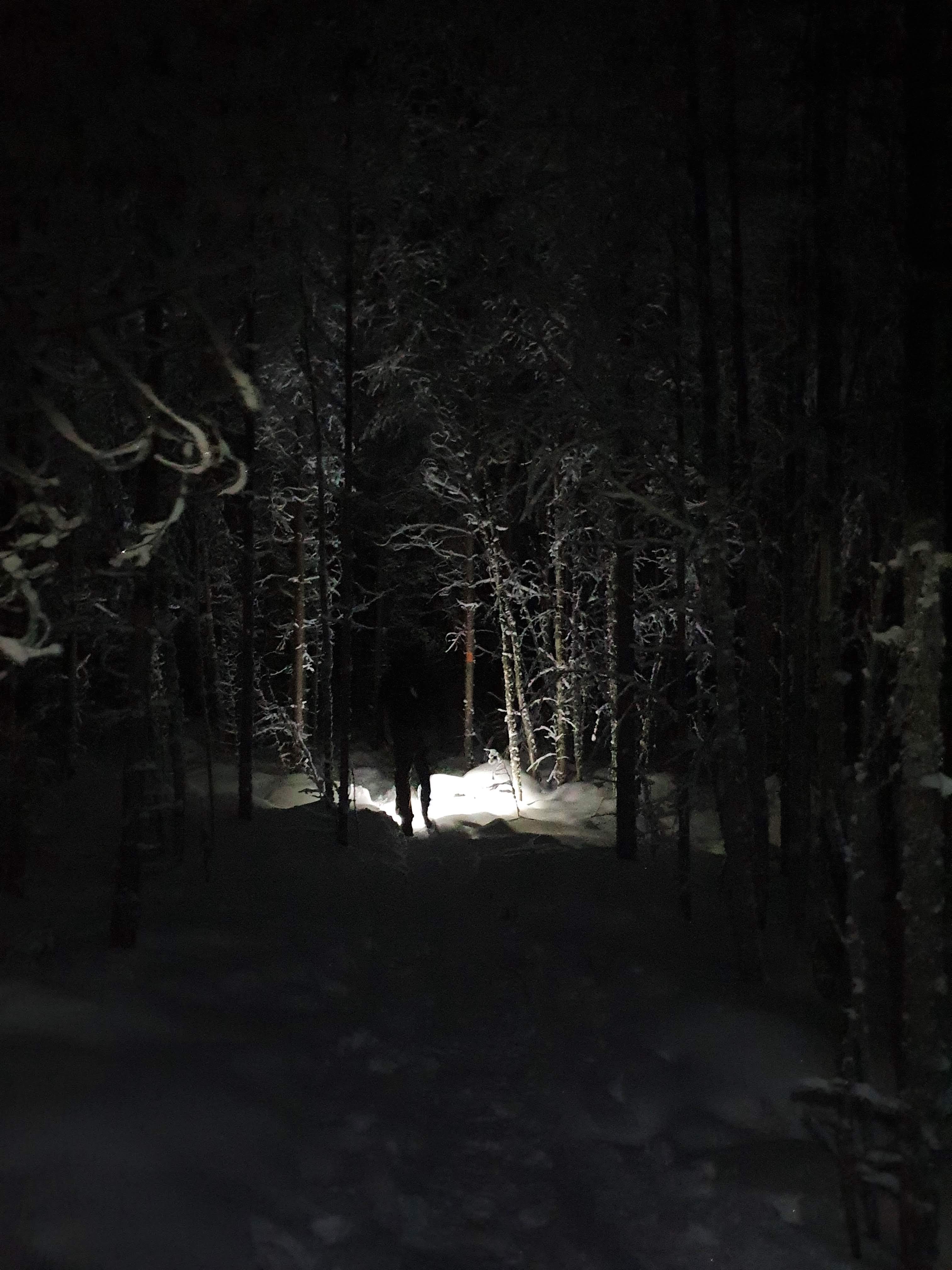 Kaikeksi onneksi tiellä oli kulkenut paljon autoja ja lumisateesta huolimatta tietä pystyi ajamaan perille asti niin, että kävelyä tuli vain 1,5km Peuran polkua pitkin. Pakkanen oli ehtinyt jo kiriä melkeimpä 18 asteeseen ja kylmältähän se tuntui kun kapusi itsensä ulos lämpimästä autosta. Lumi natisi kenkien alla kun käppäilimme rinkat selässä polkua pitkin. Oli jo ihan pimeää ja rauhallista.