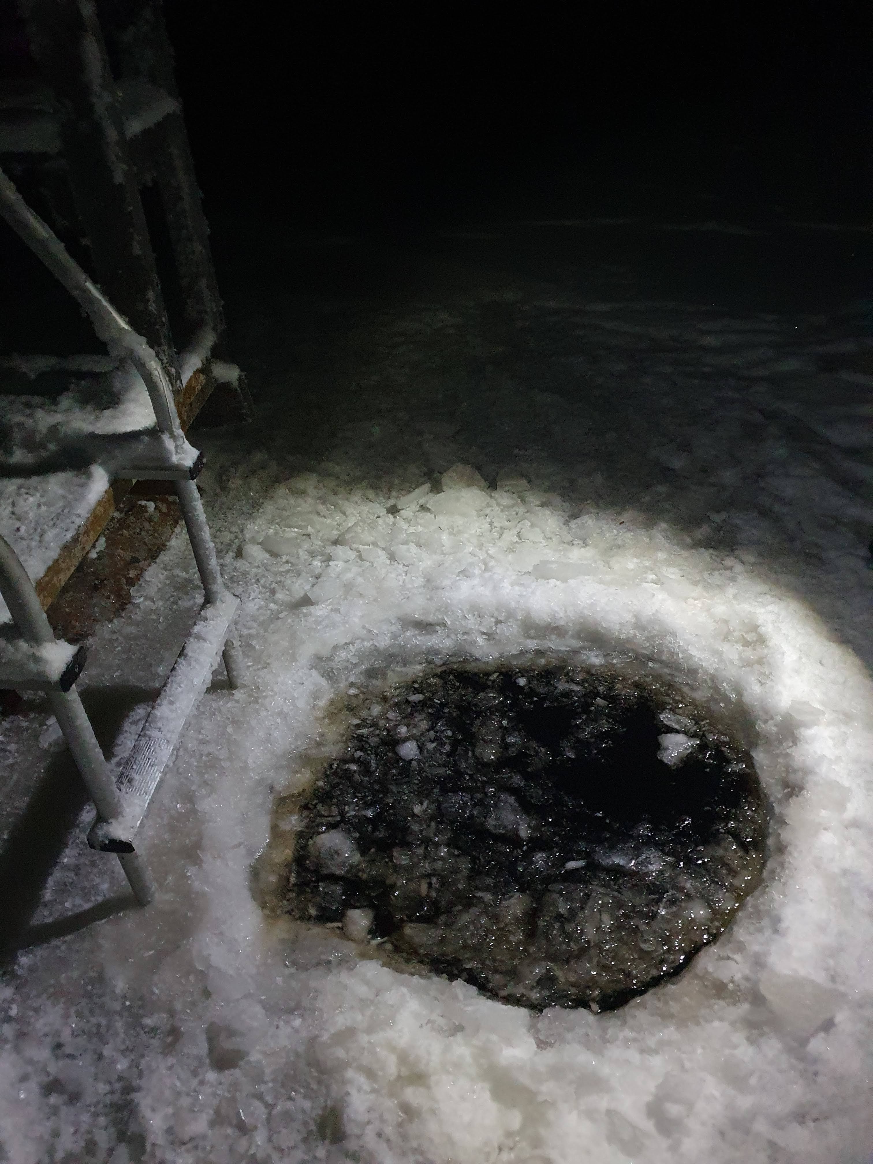 Paikan päällä puut oli pilkottava rangasta ja avanto hakattava auki kirveellä. Kaira löytyi, mutta edellispäivien vieraskirjamerkintöjen mukaan sen terä on tylsempi kuin testamentti. Kyllähän siinä sai muutaman tunnin hikoilla, vuoron perään sahattiin ja raivolla hakattiin kirveellä. Varsinkin avantoa auki hakatessa hetkittäin huusin ihan kunnolla, että sai puhtia touhuun 😀