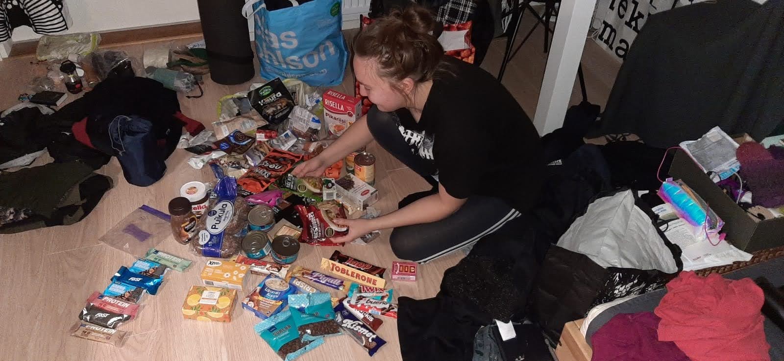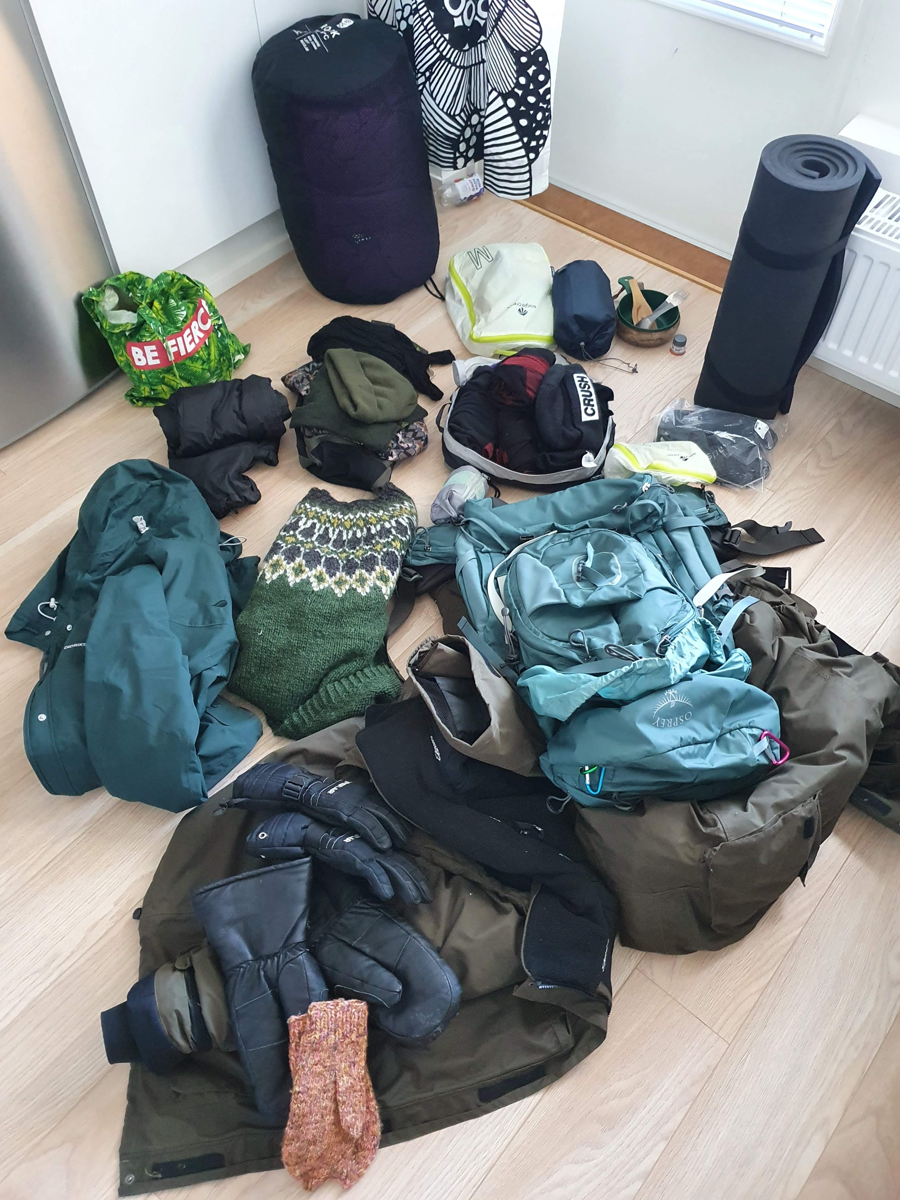 Alotin muutama päivä pakkaamaan ja niinpä pieni yksiöni on ollut kuin pommin jäljiltä. Kävimme eilen kaupassa ostamassa retkieväät. Päätimme siis tällä kertaa ostaa valmiit snäksit eli protskupatukat, suklaapatukat, rusinat etc. ja muuten valmistaa itse ja kuivattaa lämpimät ruokamme. Neljän yön eväisiin meni yhteensä 90€. Alla olevassa kuvassa on muutama etukäteen ostettu tuote eli realistinen hinta tälle setille olisi 100€. Se olisi noin kympin per päivä per henkilö. Säästää olisi voinut valmistamalla itse suklaa- ja protskupatukat mutta tehdään se sitten ensi kerralla. Otettiin mahdollisimman paljon kaikkea erilaista. Vaihtelu voi tuoda yllättävää ilostusta kylmiin retkipäiviin.