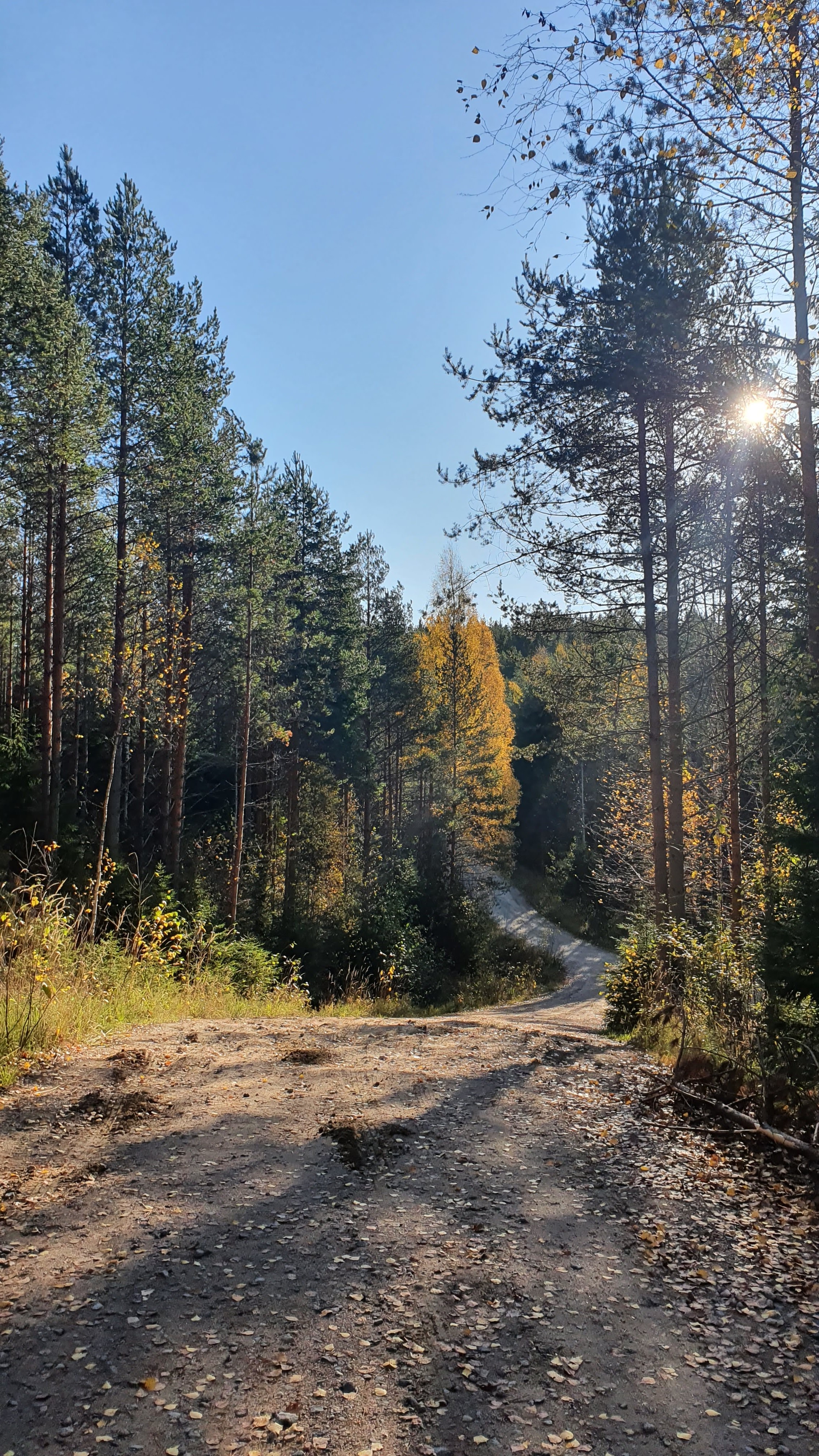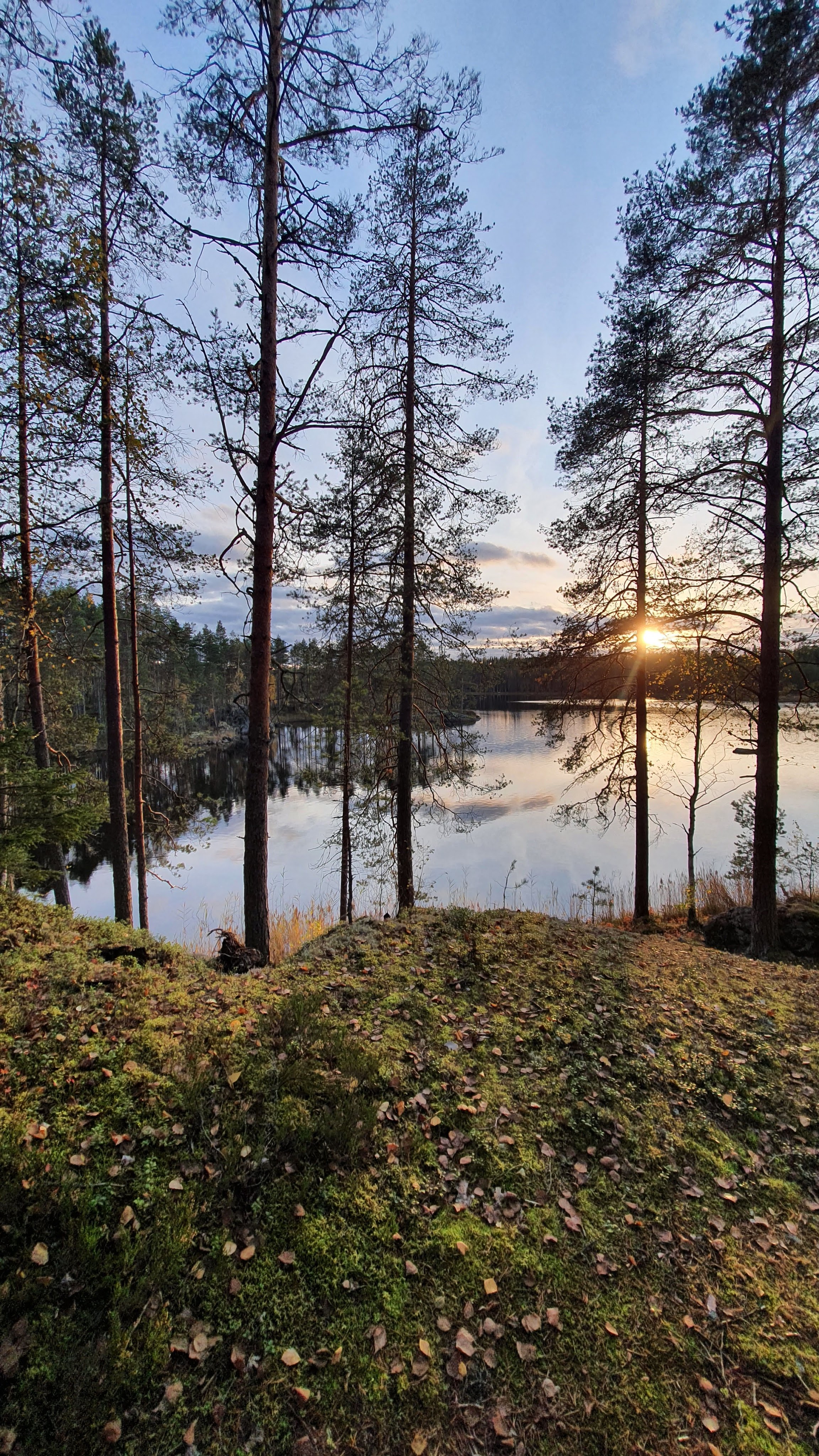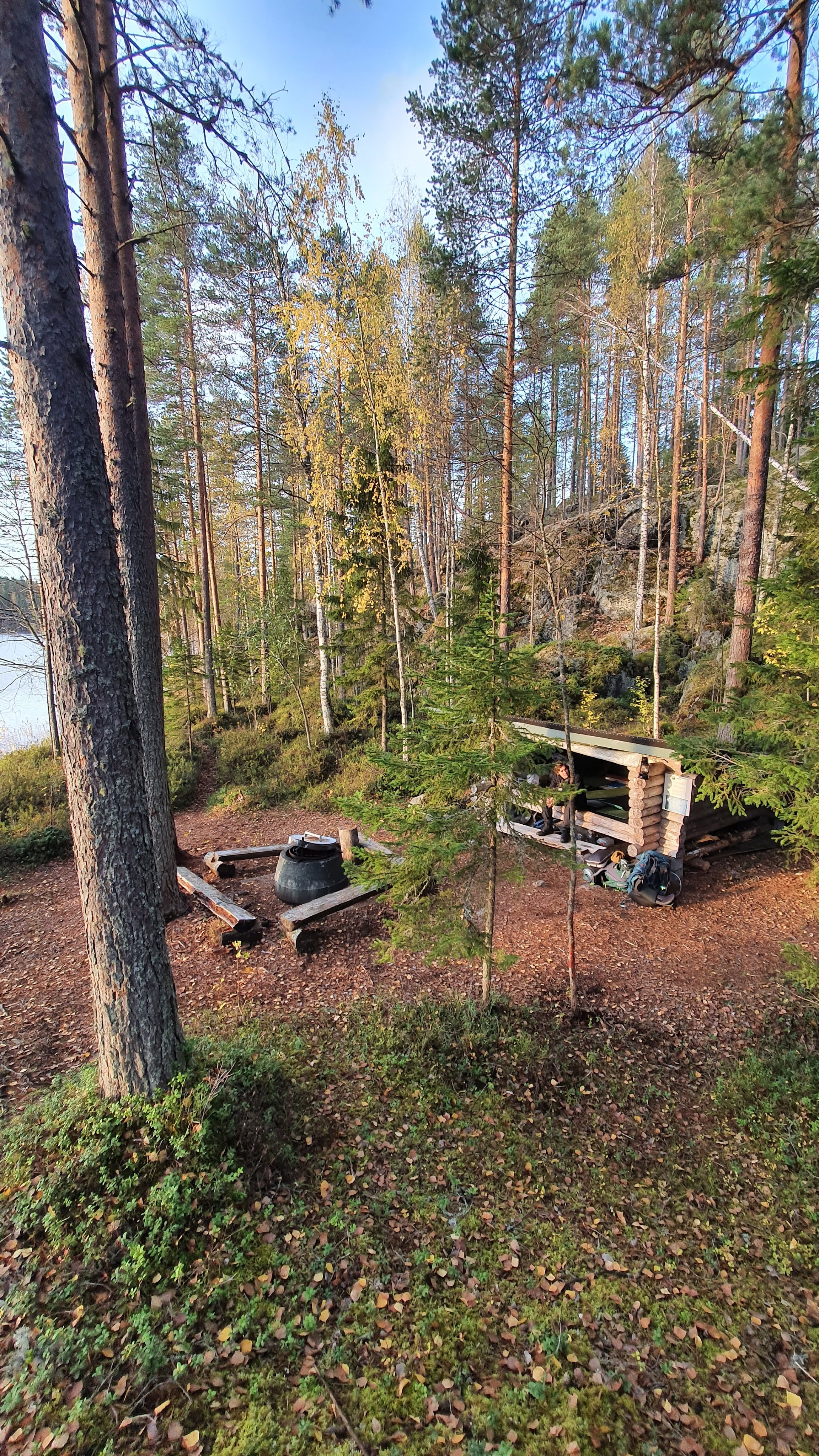 Sieltä se aaamu valkeni kuitenkin, kauniina ja aurinkoisena. Edellisiltaiset kuumottelut tuntuivat ihan uskomattoman typeriltä. Tientpäkää ympäröivä maasto oli aamuauringossa kutsuvan näköinen. Riippumatoille olisi ollut hienot ripustuspaikat. Tienpätkän lopulta näkyi vähän järvelle. Paikka vaikutti todella viihtyisältä. Söimme aamupalat auton takakontissa istuen. Muutamat eväsleivät vielä mukaan ja kamat pakettiin. Lähdimme kävelemään Kummakiveä kohti. Syksyinen aamuaurinko paistoi jo korkealta.