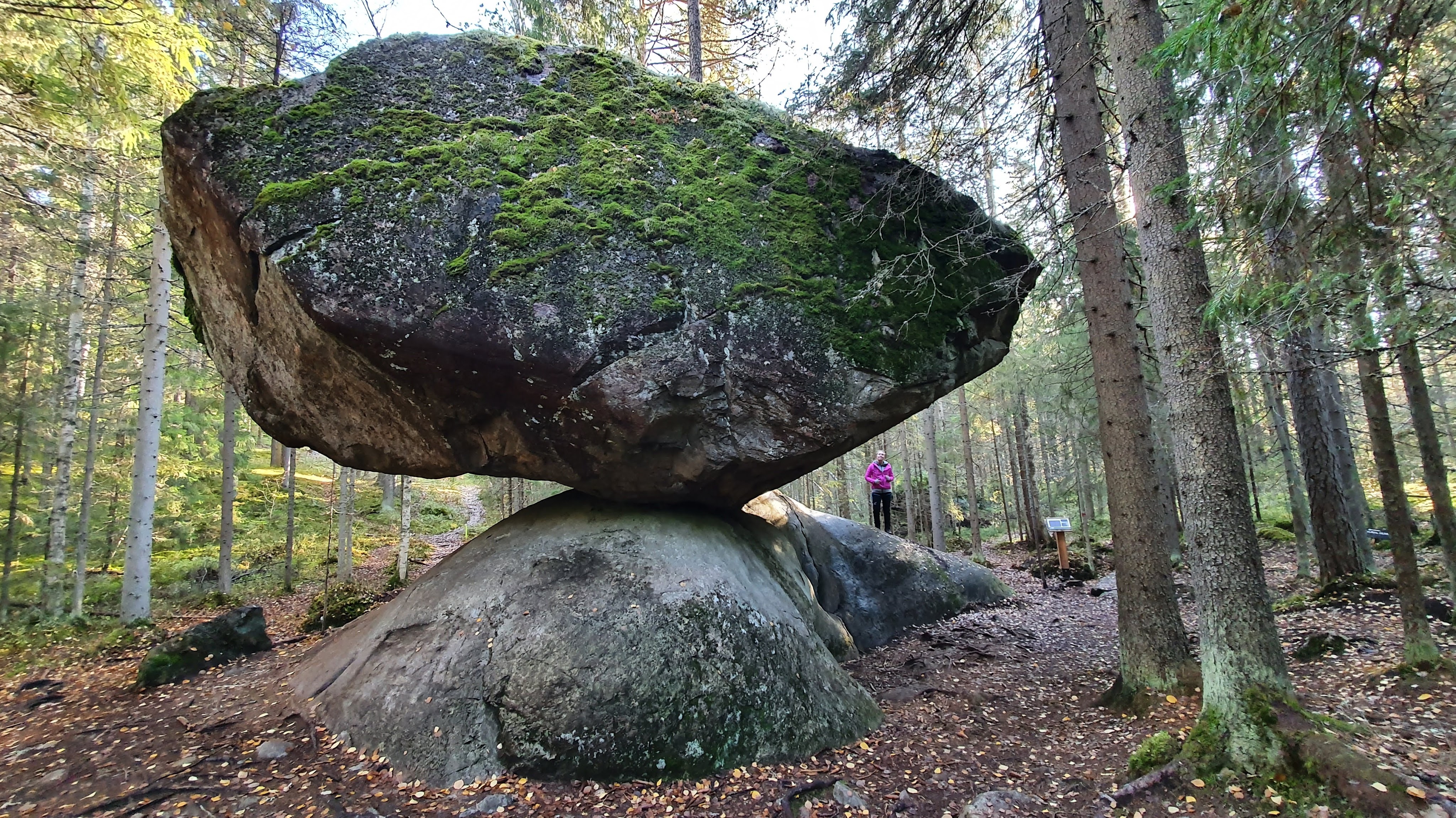 Kummakivelle johtaa lyhyt luontopolku. Kuljimme polkua hetken ja ihmettelimme kun kiveä ei näy missään. Maasto oli tiheää, paljon puita ja kasvillisuutta. Yhtäkkiä tajusimme, että olimme ihan Kummakiven vieresssä. Sieltä se vaan tupsahti eteen, ihan äkkiarvaamatta.