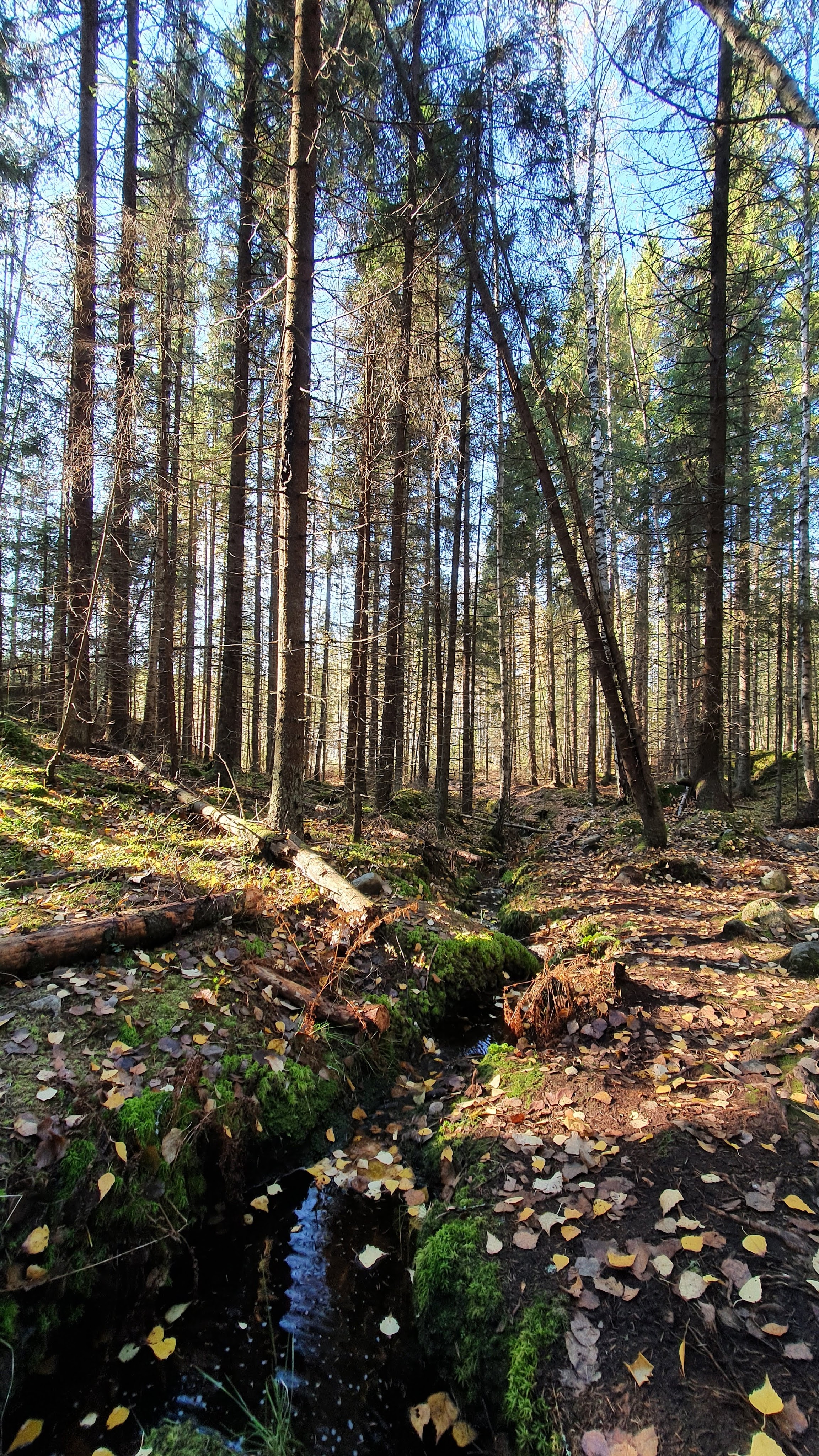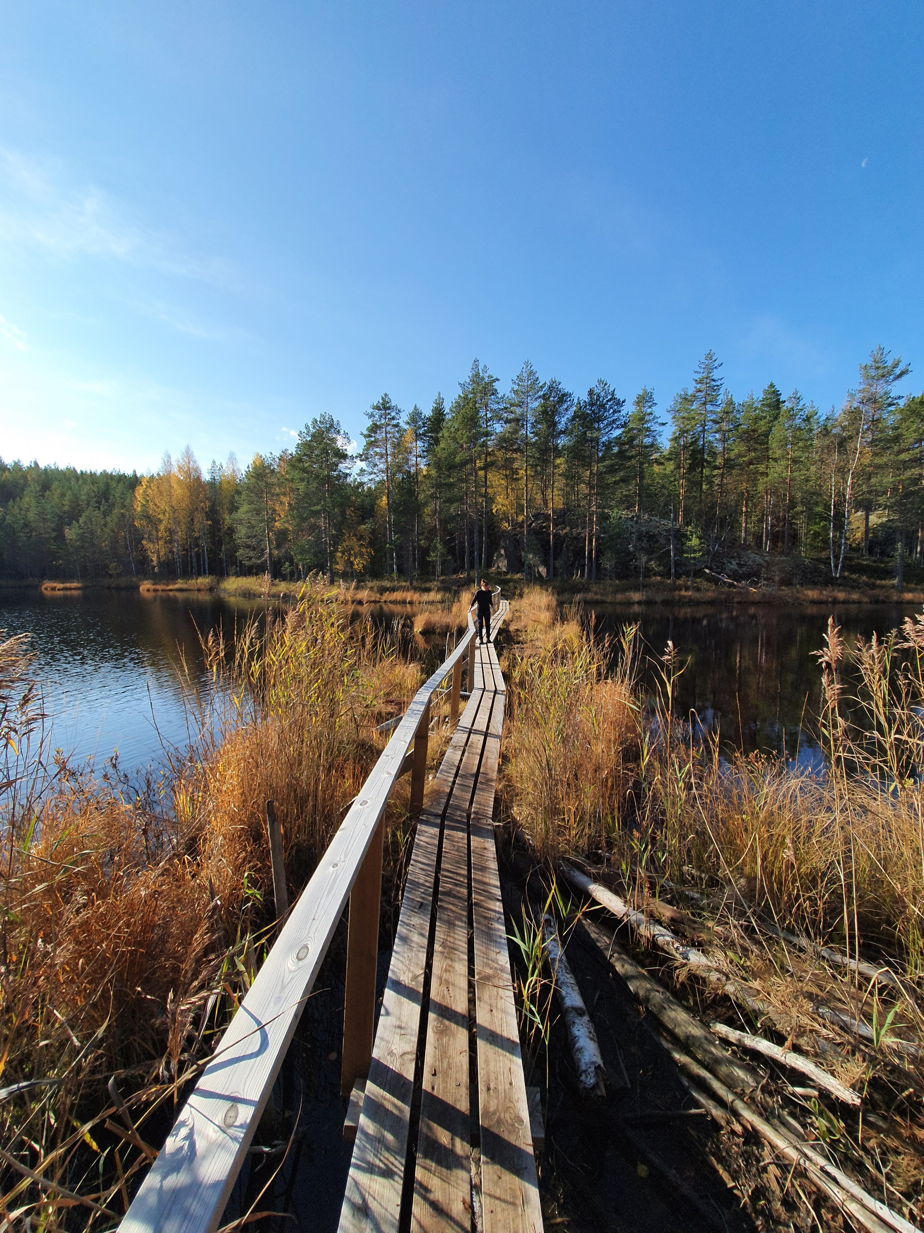 Lyhyt Kummakiven luontopolku oli tällaisena aurinkoisena syksyisenä päivänä ihan todella kaunis! Meidän lemppari oli hieno sammalsilta, joka kulki järven yli. Vähän testattiin kengällä, että kantaisiko sammal ilman siltaa. Ei kantanut.