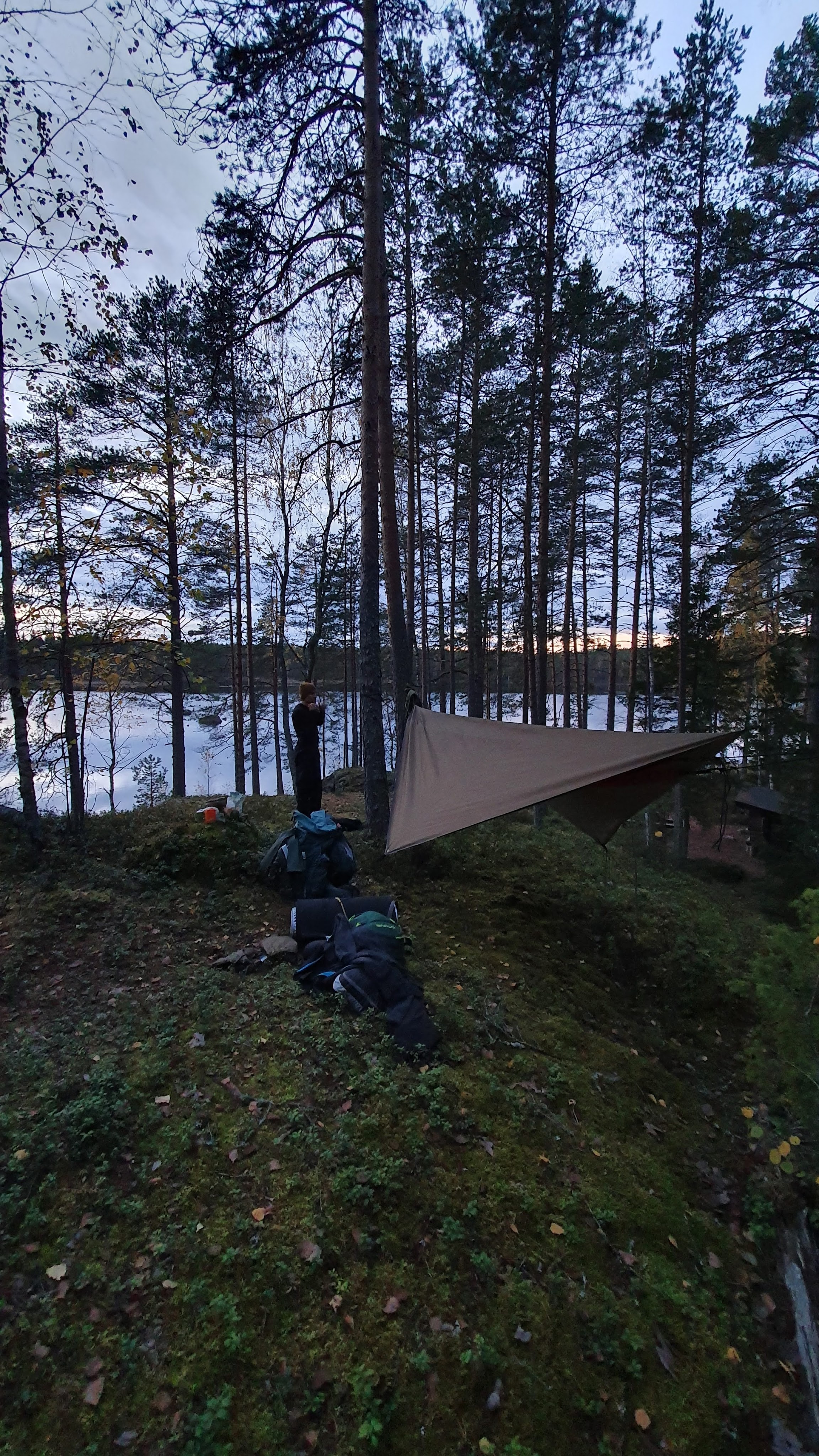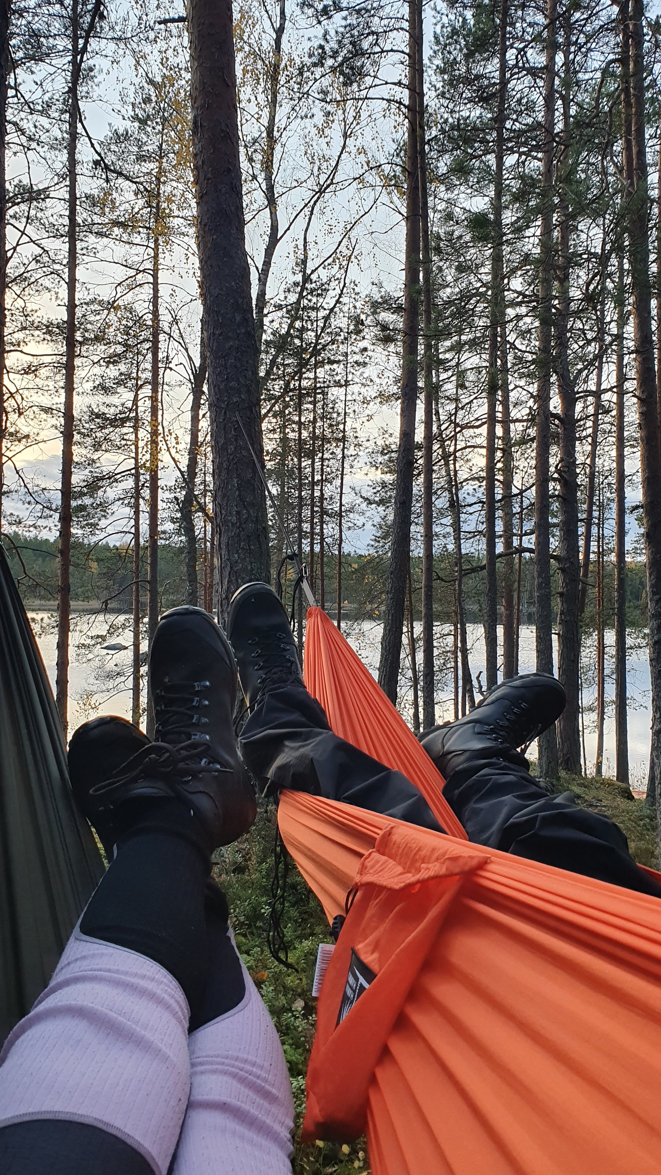 Hämäryys saapui ja niin alkoi saapua uneliaisuuskin. Meidän tämän yön leiripaikka tuntui niin rauhalliselta ja mukavalta. Tosi turvalliselta ja kodikkaalta. Kollaa laavulla oli ehdottomasti hyvä fiilis. Söimme reilun iltapalan ja käperryimme riippareihin nukkumaan. Metsästä kuului rapinaa, mutta tänä yönä se kuulosti vain tuttavalliselta. Aivot eivät jaksaneet lähteä enää kuumotuskierroksille edellisyön takia. Vaivuin mustaan tyhjyyteen ja nukahdin.