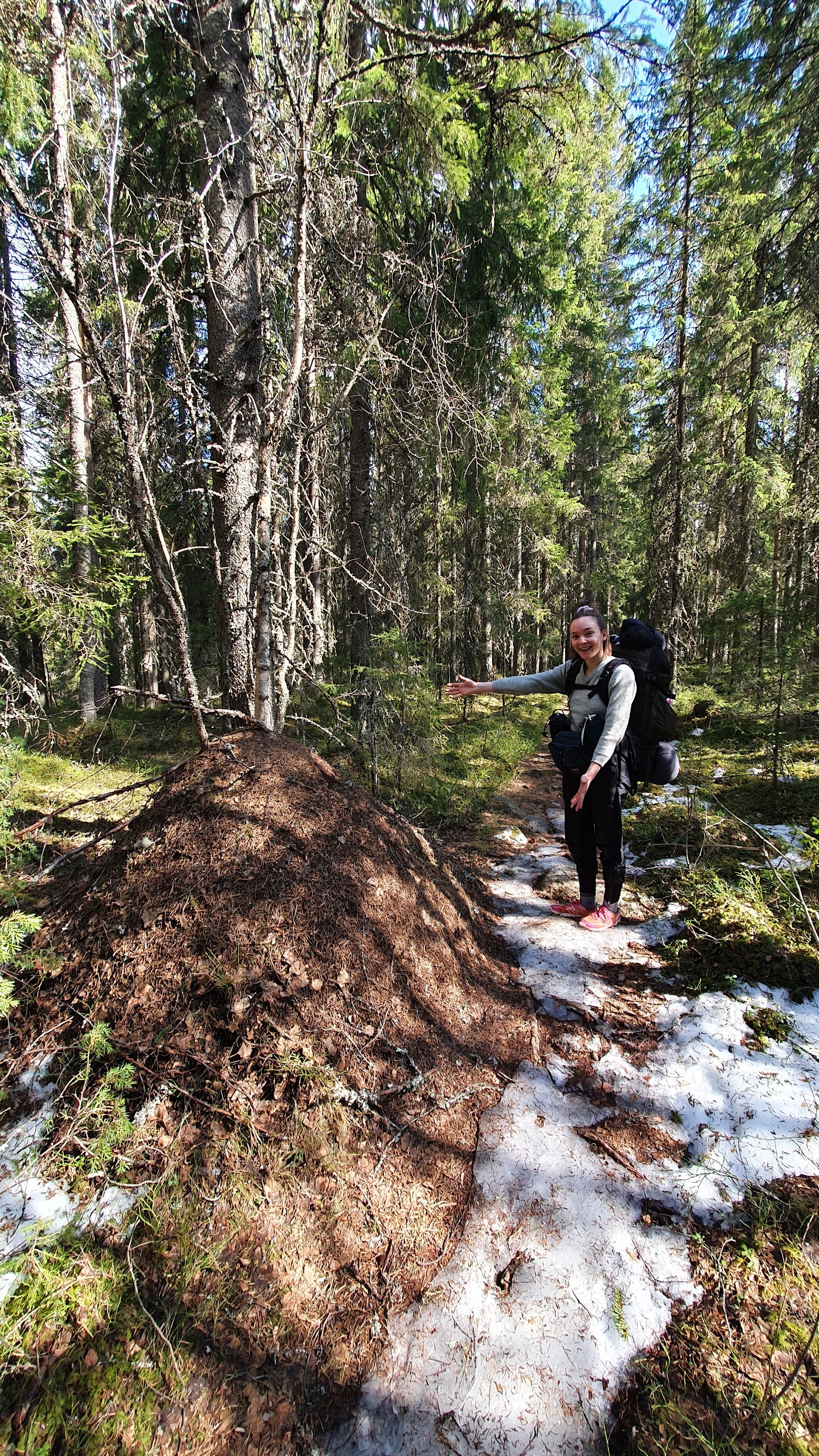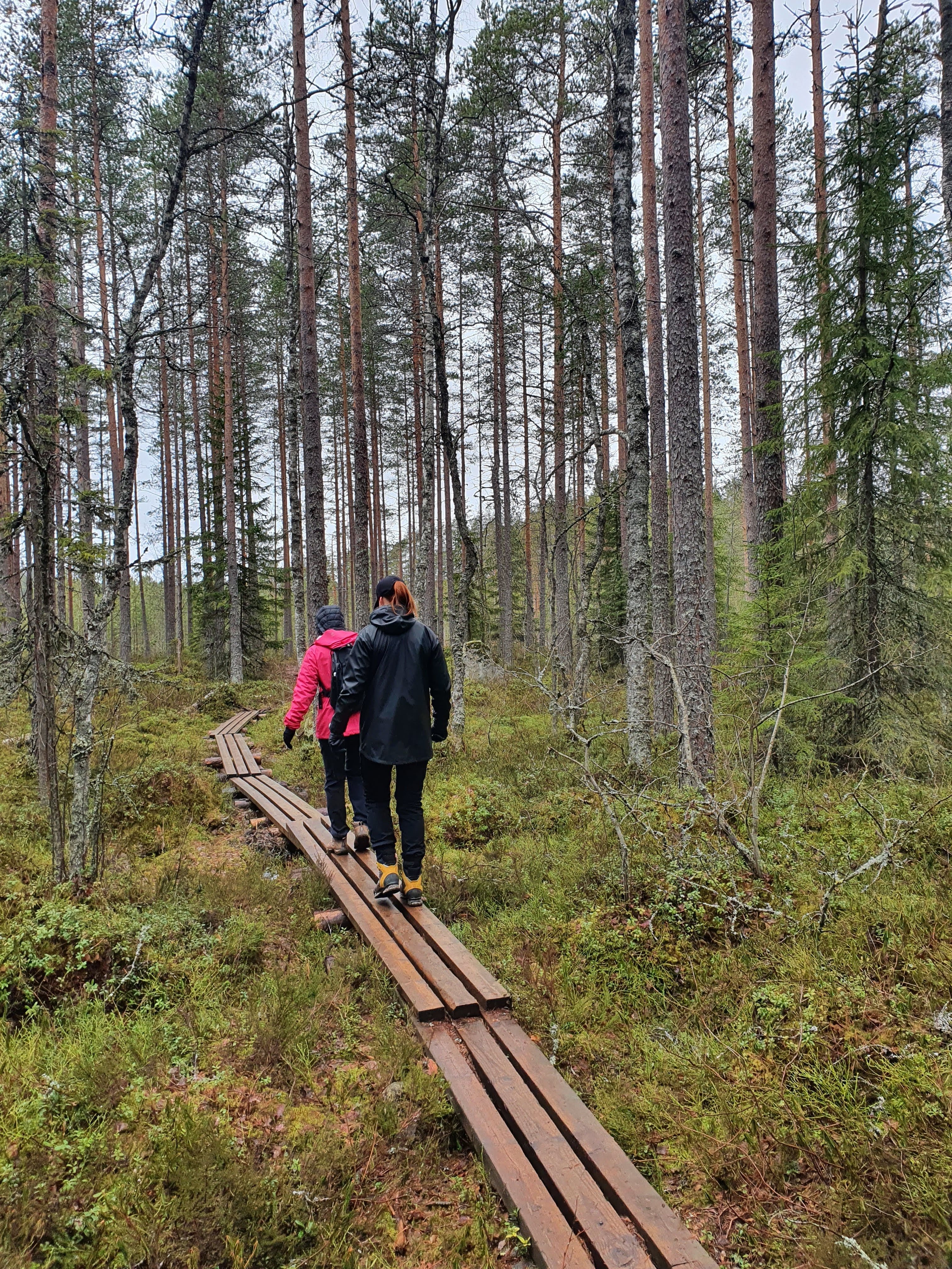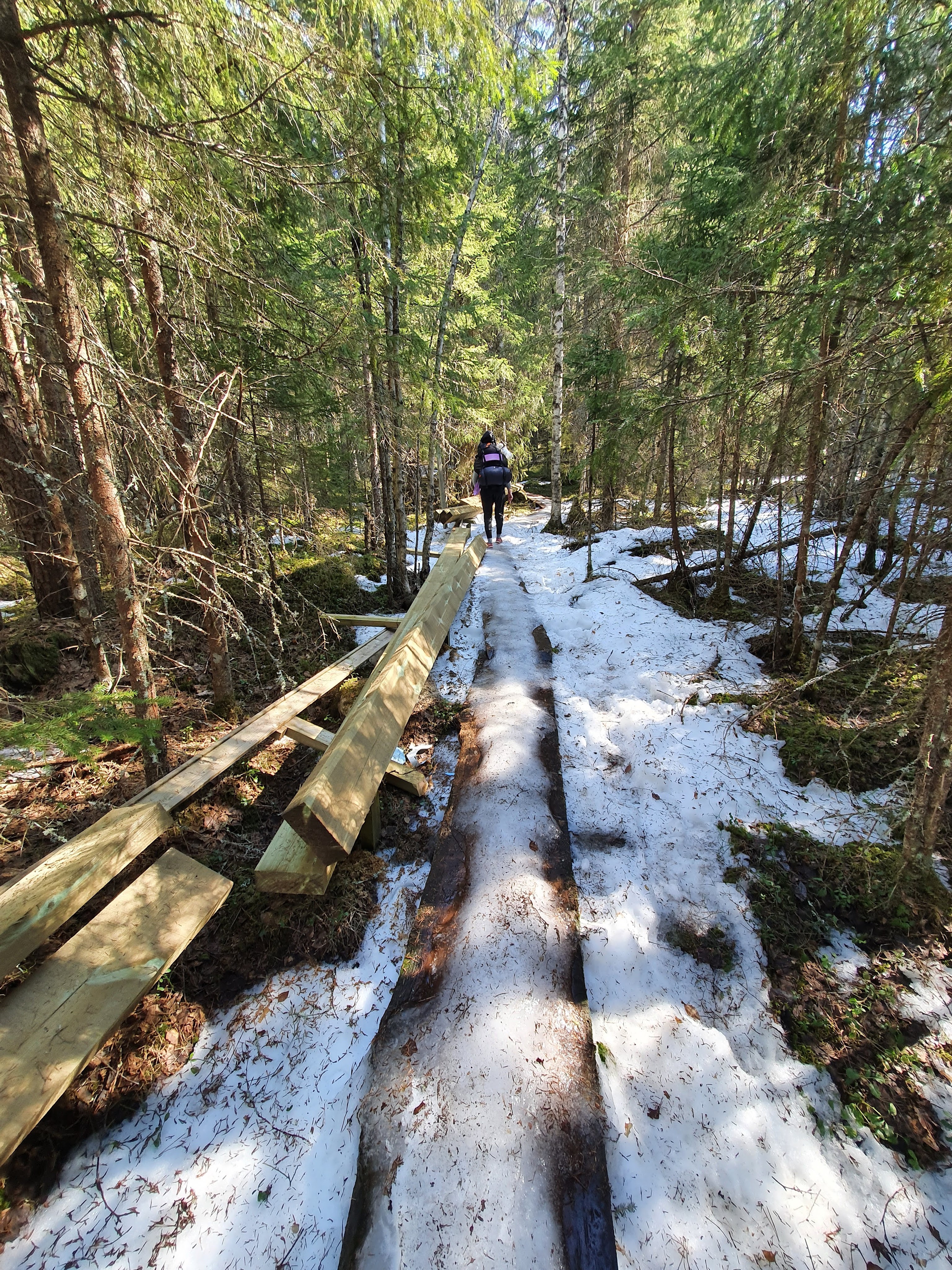 Kävelimme pehmeitä aarniometsän polkuja pitkin. Ympärillä puut seisoivat ylhäässä hiljaisuudessaan. Tuuli humisi hiljaa ja linnut visersivät. Ympäristö imi kaikki ylimääräiset äänet, edes kengistämme ei kuulunut mitään. Siinäpä oli mukavat pari kilometriä Koverolta Aarnipolun loppuun. Näiden kilometrien jälkeen lähdettiin tarpomaan Virkatietä. Virkatie oli tähän aikaan vuodesta aika karseassa kunnossa. Jäätä, vettä ja sohjoa oli kaikkialla. Inhottavin kaikista oli ehkä kuitenkin jäiset pitkospuut ja kohdat, missä pitkospuut olivat remontissa. Elli pähkäili, että Virkatie saa varmasti nimensä koiran virasta.