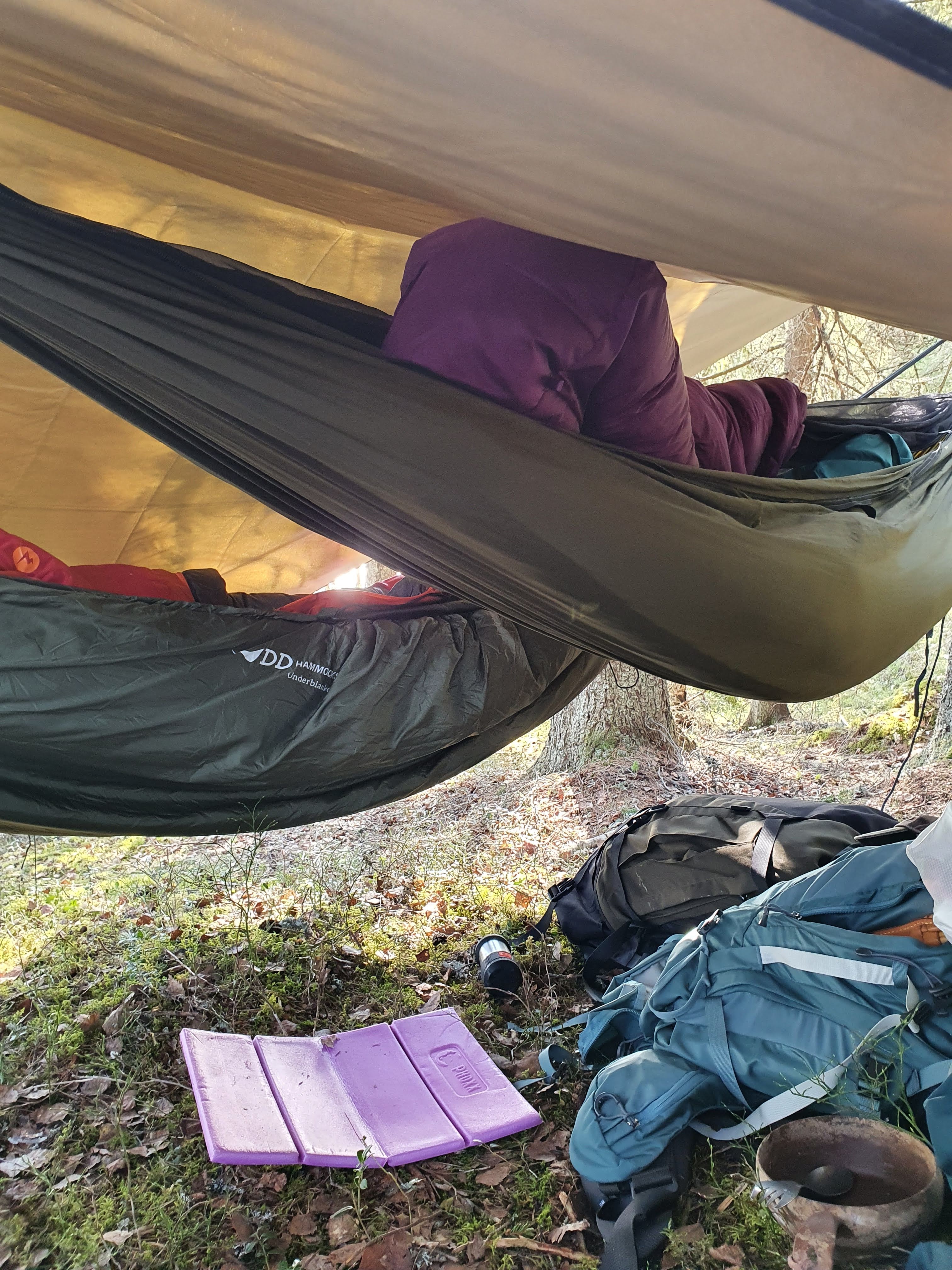 Aamu alkoi erittäin mukavasti lämpimistä makuupusseissa ja riippumatoissa keikkuen. Sadetta ei näin aamusta ollut. Kahvi ja Snickers-pelti maistuivat täydellisiltä. Voiko aamu enää paremmin alkaa?