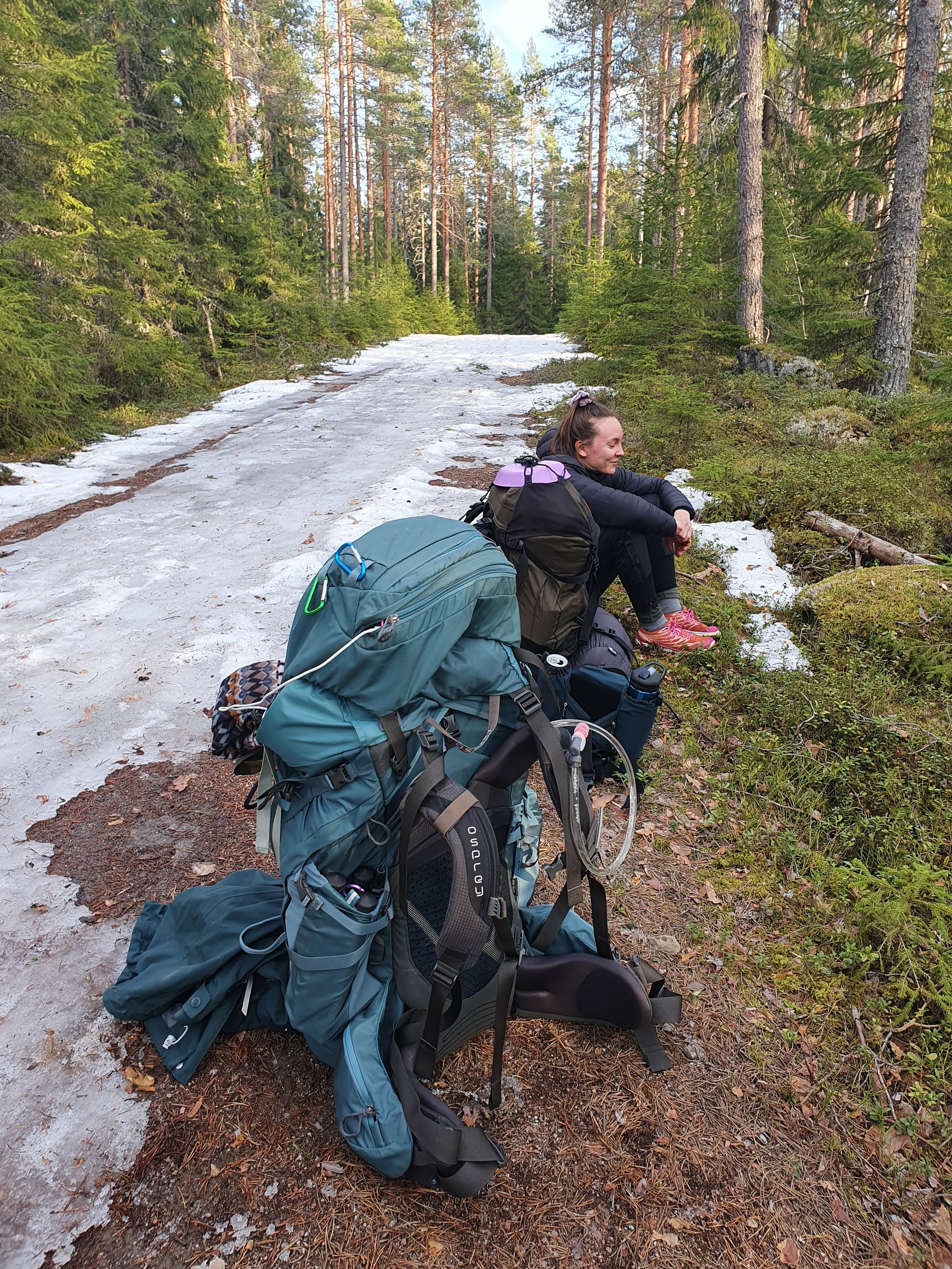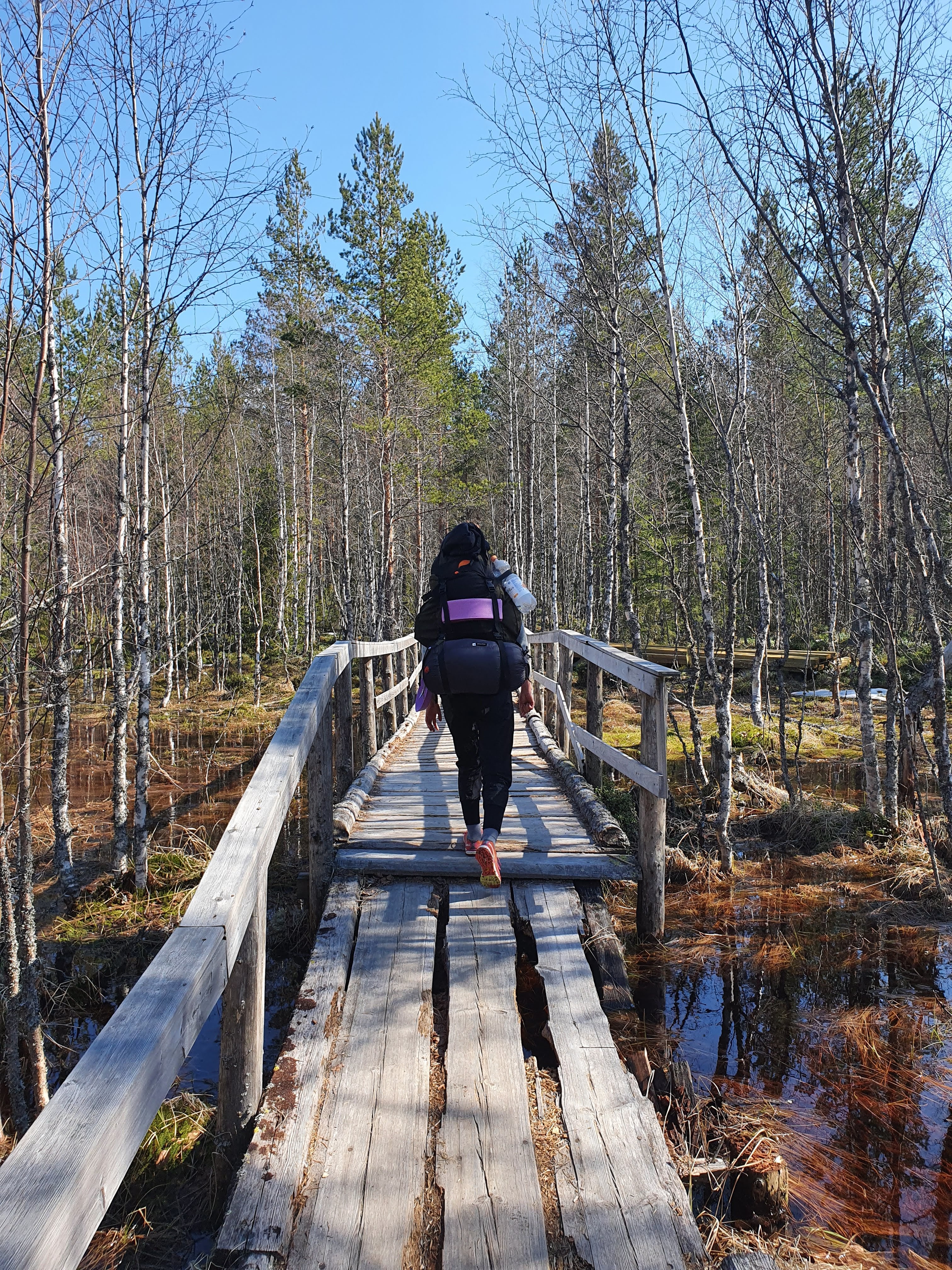 Oli aika lähteä taas liikkeelle. Virkatietä kulkiessamme luulimme, että pahin pätkä tietä oli takanapäin. Olimme kuitenkin väärässä. Pahin oli tässä, suoraan edessämme. Olimme tulleet jo Multiharjun ohi. Välillä lunta oli yli polven, välillä vähemmän. Polulle oli pakkaantunut reilusti lunta ja polun vierustat olivat kasvaneet tiiviisti kiinni. Välillä lumihanget vaihtuivat suuriin lätäköihin. Tilannetta ei auttanut yhtään se, että pitkospuut oli korjattu pois ja uudet olivat polun vieressä sikin sokin odottamassa asennusta.