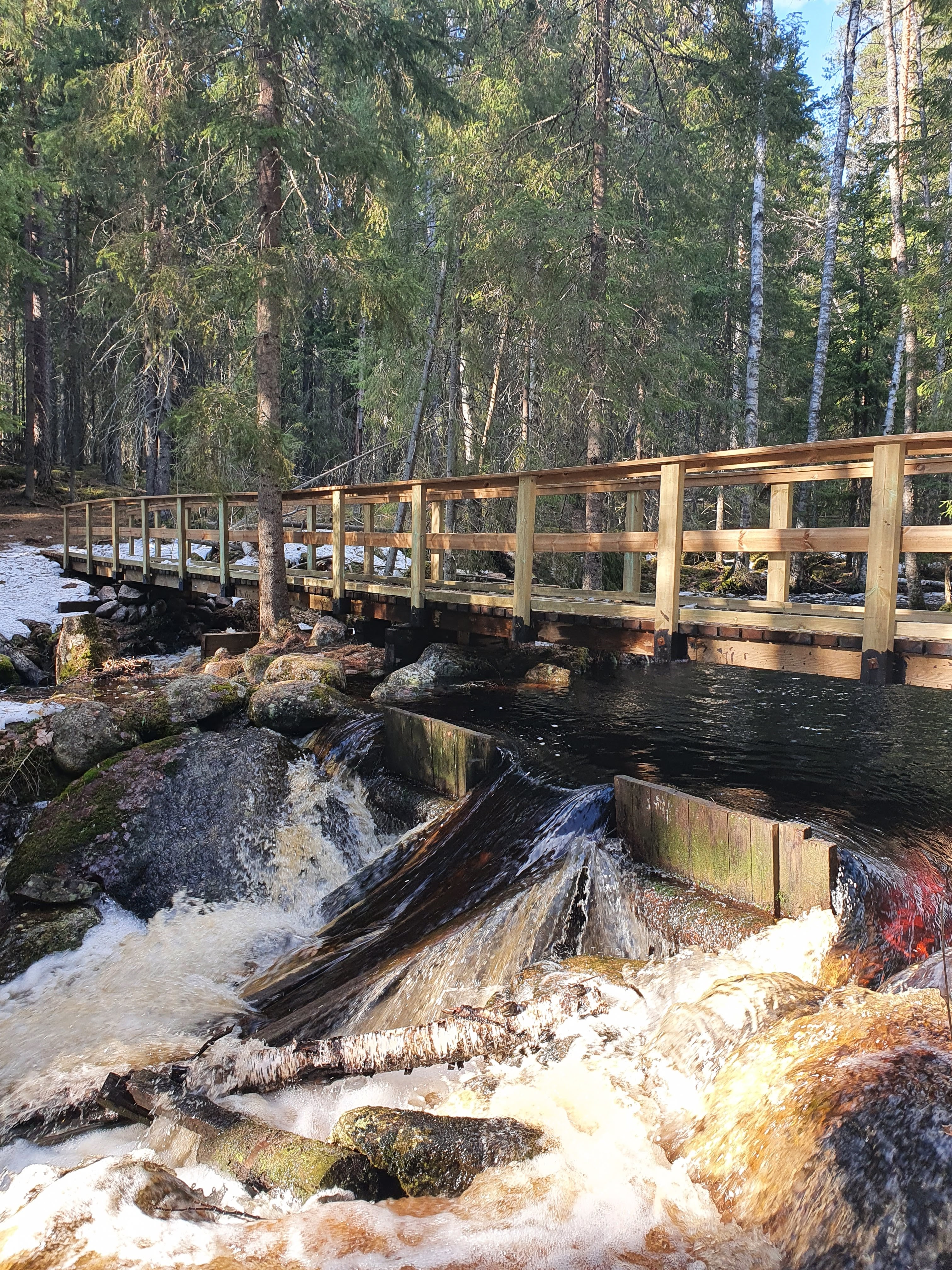 Myllylle pääsy oli mahtava välietappi! Oli mukava kuunnella kosken kohinaa korvissa ja pitää riemastunut ihastelutauko kamalan kostean rämpimisen jälkeen. Elli piti myös muurahaispesien ihastelutauon, jonka jälkeen jatkettiin matkaa kummastellen. Virkatielle oli laitettu kylttejä, että tie menee eri kohdasta, mitä se on esitteessä ja Maastokartoissa. Vanha Virkatie näytti aika karsean kuntoiselta, joten seurasimme näitä printattuja merkkejä, niitä oli kuitenkin aika paljon. Mietimme hetken, että onko sittenkin kyseessä joku pränkki, mutta jos joku on käyttänyt näin paljon aikaa näiden lappujen tulostukseen ja puihin kiinnittämiseen, niin ihan vaivan palkkana voidaan tähän pränkkiin mennä.