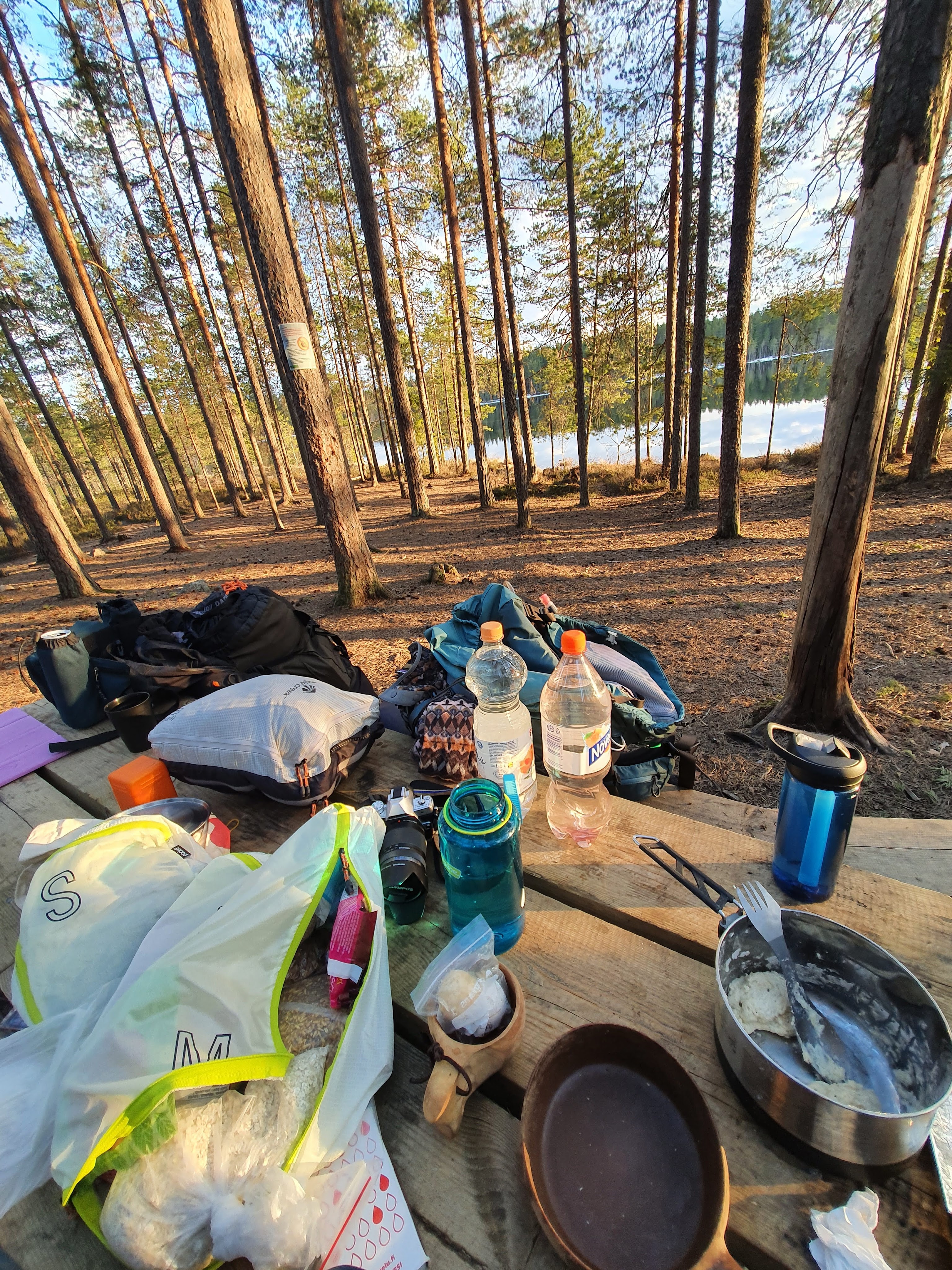 Keli oli todella kaunis ja leiriytymispaikka ihan tyhjä! Levitettiin kaikki kamat hetkeksi ihan pitkin poikin ja ihasteltiin paikkaa. Aurinko laski kauniisti, tikkupullat maistuivat herkullisilta ja leirikin oli jo kohta viritetty. Oltiin ihan malttamattomina odottamassa, että milloin pääsee käpertymään makuupussiin ja unten maille. Menimme noin yhdeksän jälkeen nukkumaan, tyytyväisinä ja mahat täynnä.