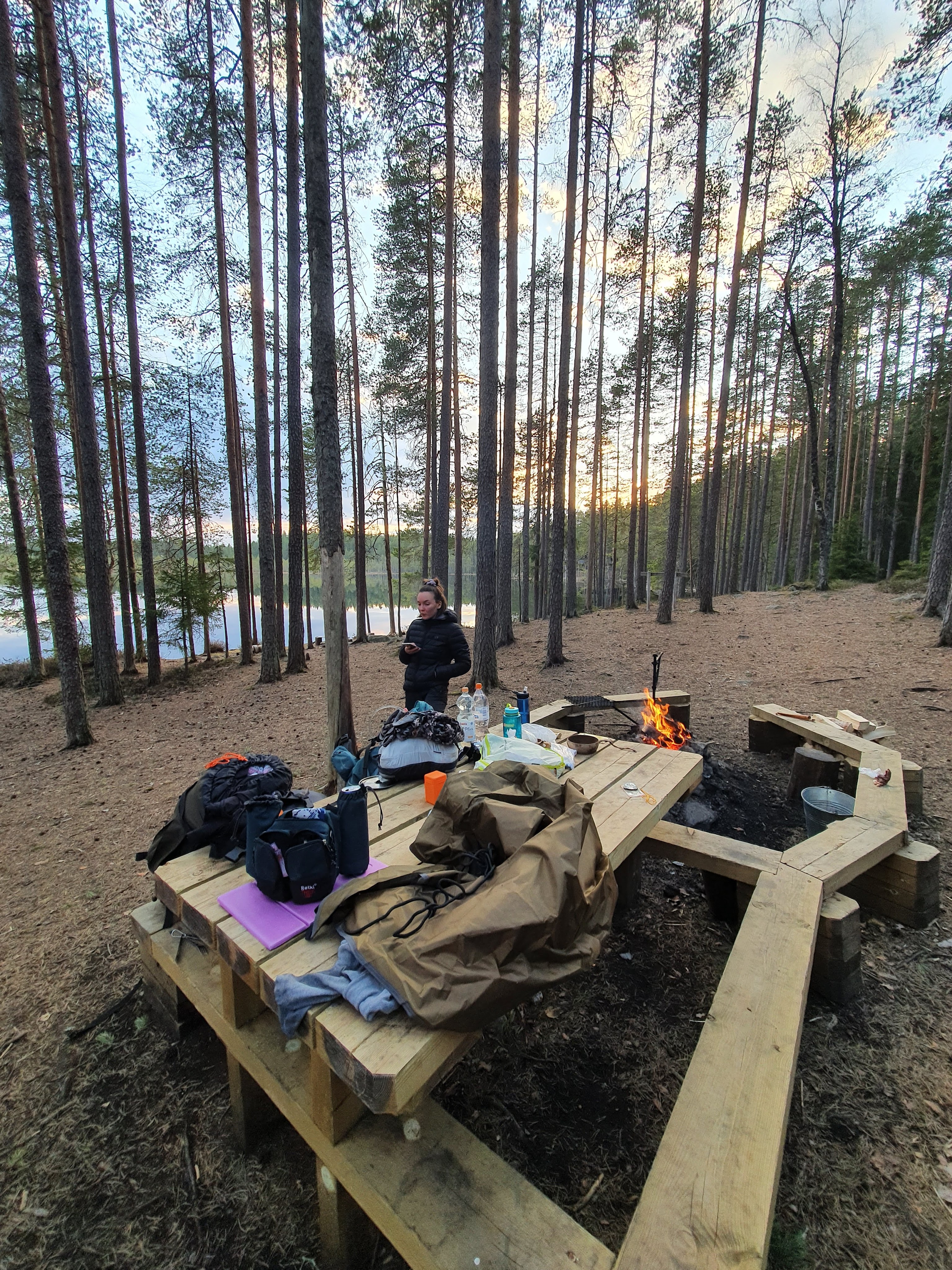 Pakkasimme hitaasti tavarat ja söimme aamupalaa. Naapurit olivat pitäneet koko yön nuotiota. Me istuimme mukavasti untuvatakit päällä aamupalalla. Ei palellut ja yölläkin oli ollut todella mukavat oltavat, vaikka lämpötila tipahti yöksi nollan paikkeille.