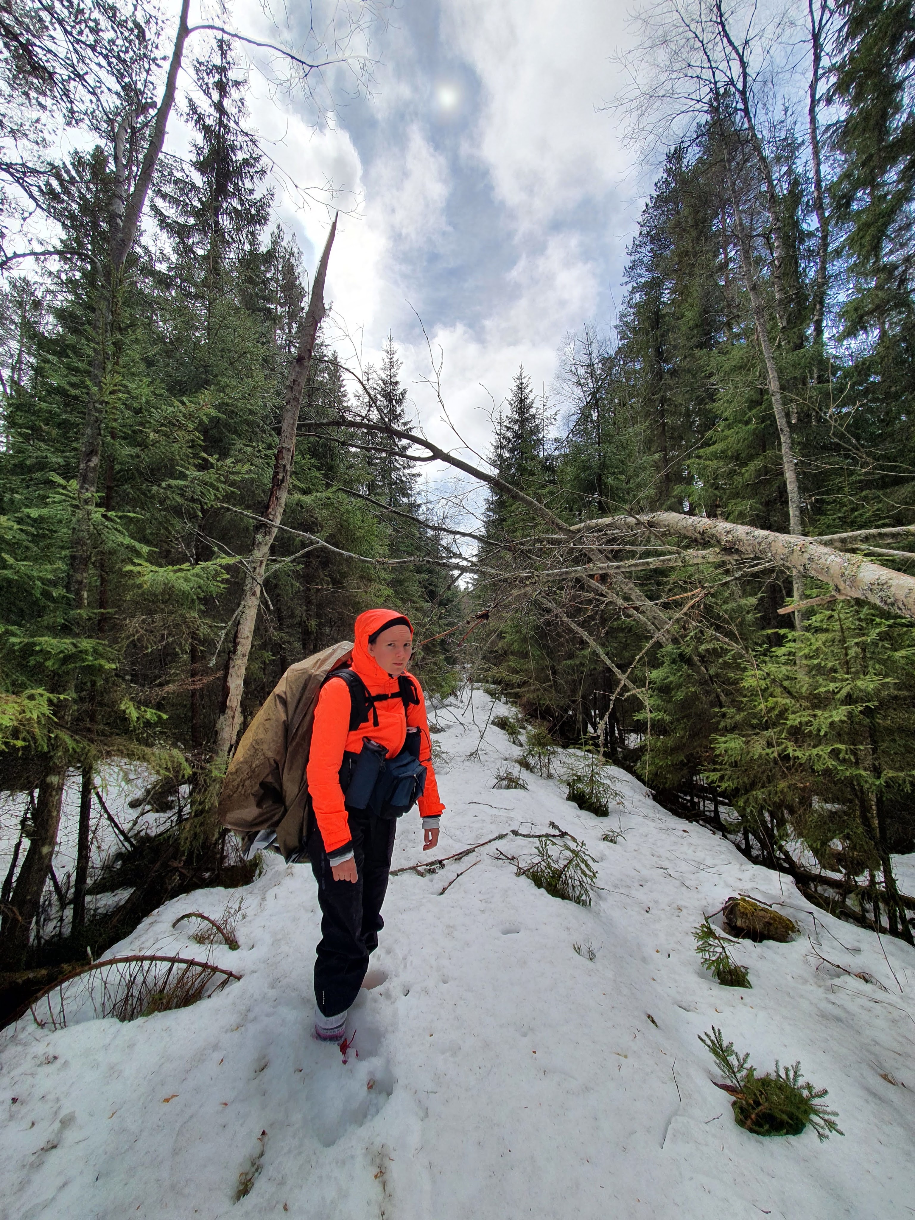Päiväksi oli luvattu tihkusadetta ja sitä se olikin. Välillä yltämme pyyhkäisi sadekuurot. Olimme onneksi keksineet virittää Ellin rinkkaan sadesuojaksi riippumattoja suojanneen tarpin. Matkamme jatkui metsän suojissa vähän nopeammin mitä lumisella polulla.