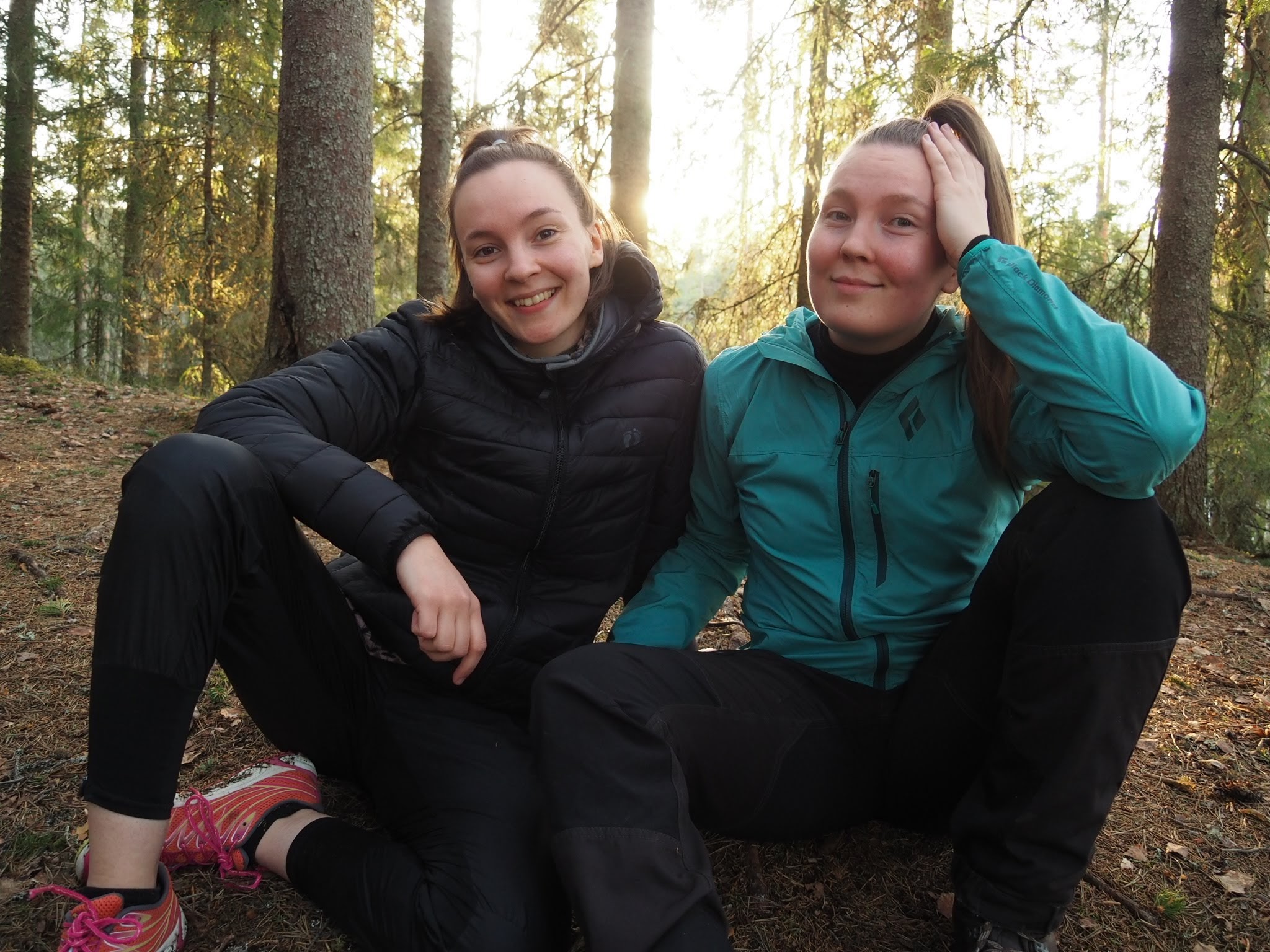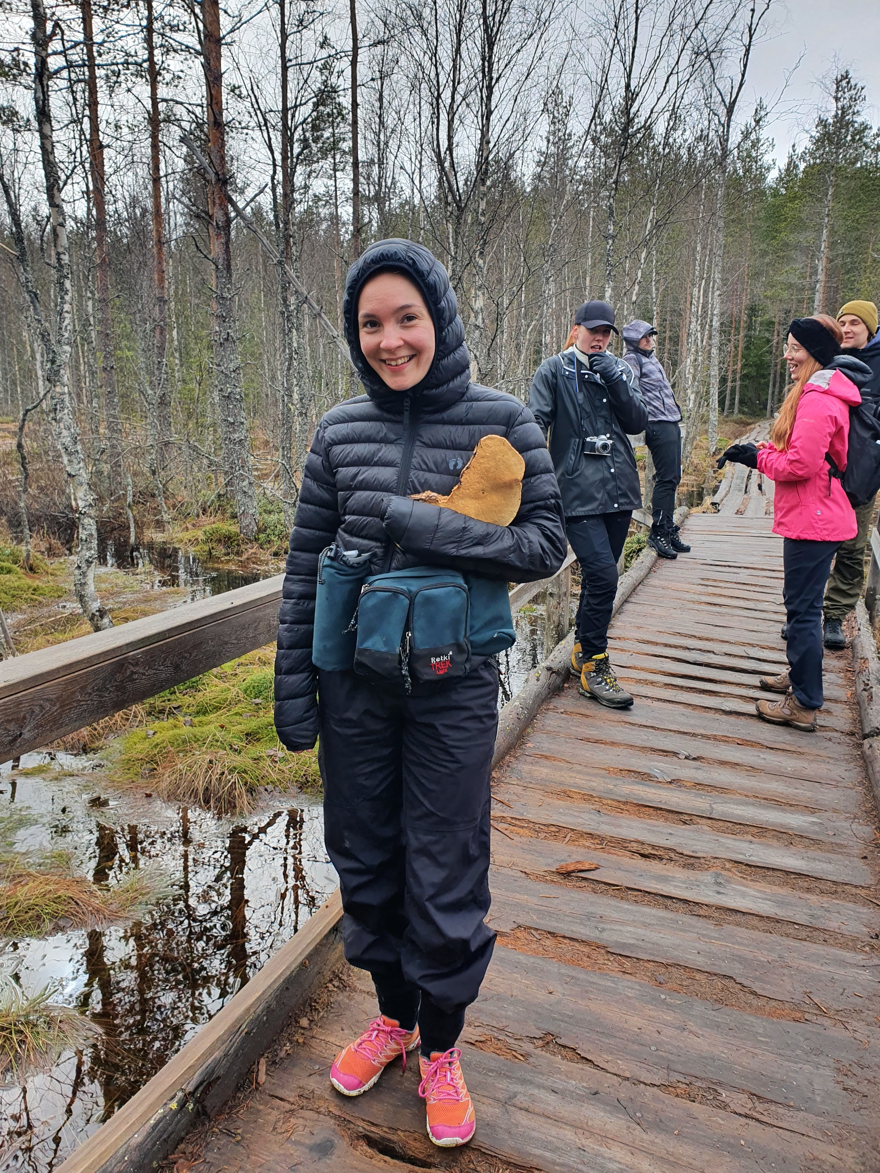 Ruuan jälkeen ihana rentous ja lämpö valtasi kehon. Väsymys myös. Ennen ruokailua olimme laittaneet lämpimämpää vaatetta päälle. Meillä molemmilla oli paksut untuvatakit. Lähdimme hakemaan Koverolammen läheiseltä vesipisteeltä vettä. Näimme miten naapurileiriläiset palelivat ja lämmittelivät nuotion ympärillä kulkiessamme siitä ohi. Tuntui todella helpolta kävellä, kun selässä ei ollut mitään kannettavaa. Olo oli kevyt ja euforinen. Nauratti ja läppä lensi.