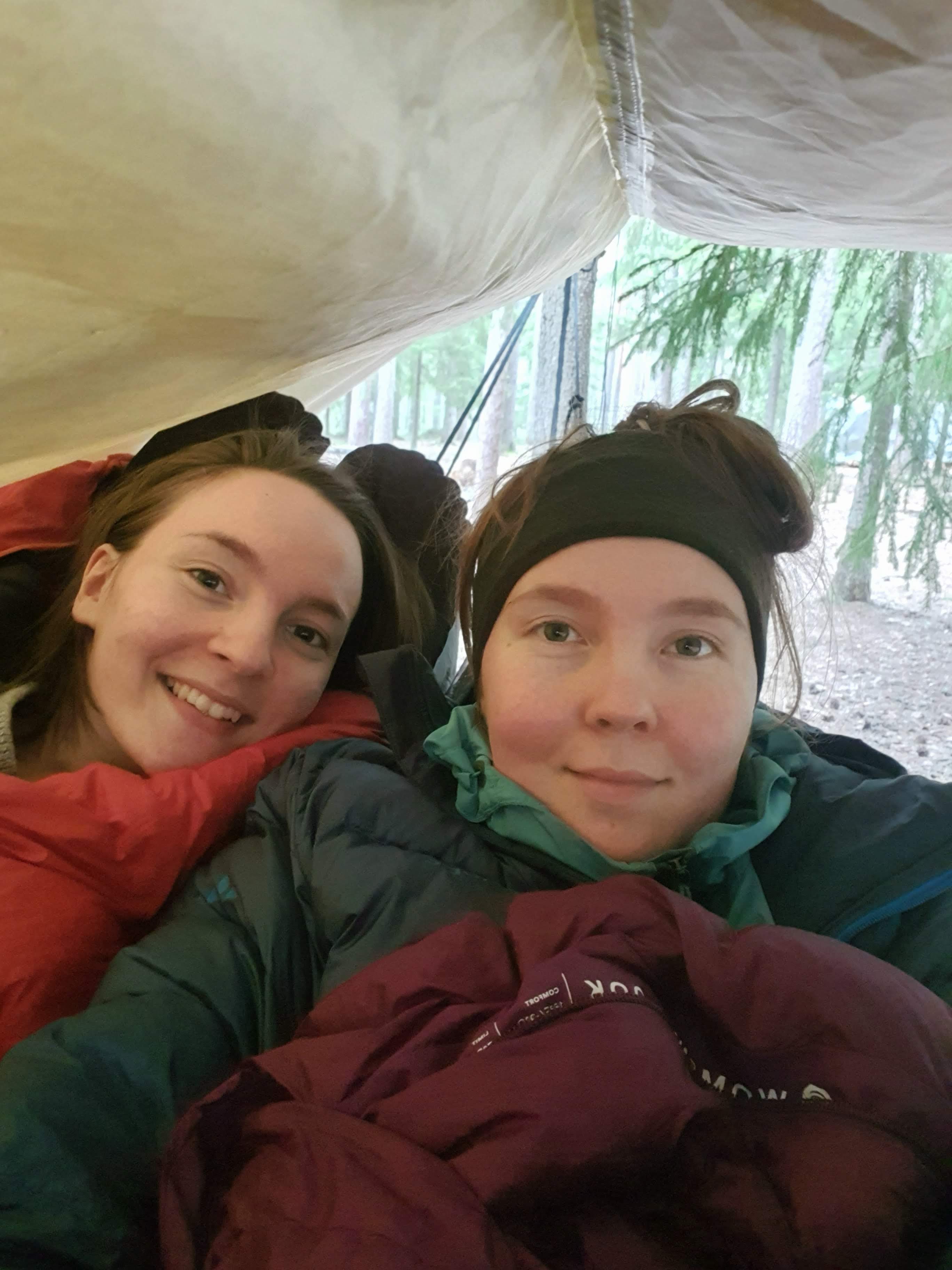 Nukuimme yöllä pitkästi ja sikeästi. Heräsimme uuteen aamuun onnellisena naureskellen. Jotakin hupaisaa siinä on, kun rakas sisko pällistelee aamu-unisena viereisestä riippumatosta. Koko yönä ei satanut ja aamulla paistoi kaunis aurinko. Leiripaikkamme näytti suorastaan lumoavalta.