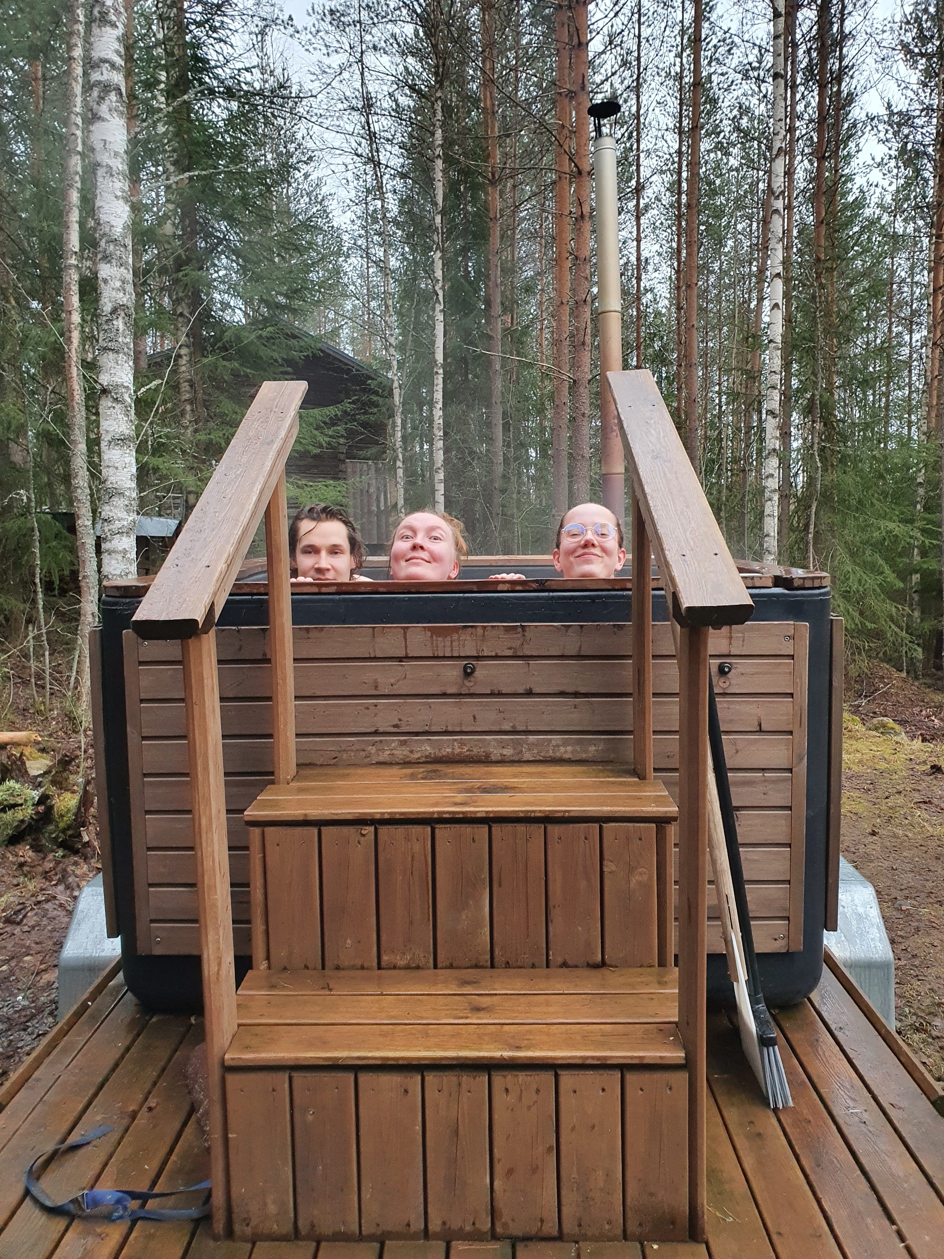 Ruokaa ei enää ollut jäljellä, niin joimme kupposet teetä suihkun jälkeen. Lämmin juoma tyynnytti edes jotenkin nälkää. Kyttäsimme jatkuvasti ikkunasta, että milloin kaverit saapuu. Tommia oli jo kamala ikävä. Kuuden aikoihin näimme auton kaartavan pihaan ja juoksimme paljan jaloin vastaan. Ihmisiä!! Kavereita!! Muut menivät sisälle purkamaan kamppeitaan ja lähdimme Lauran ja Ellin kanssa hakemaan Milaa Tampereen juna-asemalta. Haimme Milan lisäksi Hesburgerista vähän evästä ja ajoimme takaisin torpalle. Palju oli jo lämpenemässä ja sauna kuumana. Vietimme erittäin rentouttavan illan Seitsemisen torpassa sanoen ja paljuillen. Seuraavana päivänä kävimme porukalla kiertämässä Aarnipolun, otimme paljon kuvia, saunoimme ja paljuilimme lisää ja söimme erittäin hyvin. Pitkästä aikaa, tässä koronan keskellä, oli äärettömän mukava nähdä porukalla ystävien kesken. Tällaisista rennoista viikonlopuista ja vaelluskokemuksista saa uskomattoman paljon voimaa arjen haasteisiin.