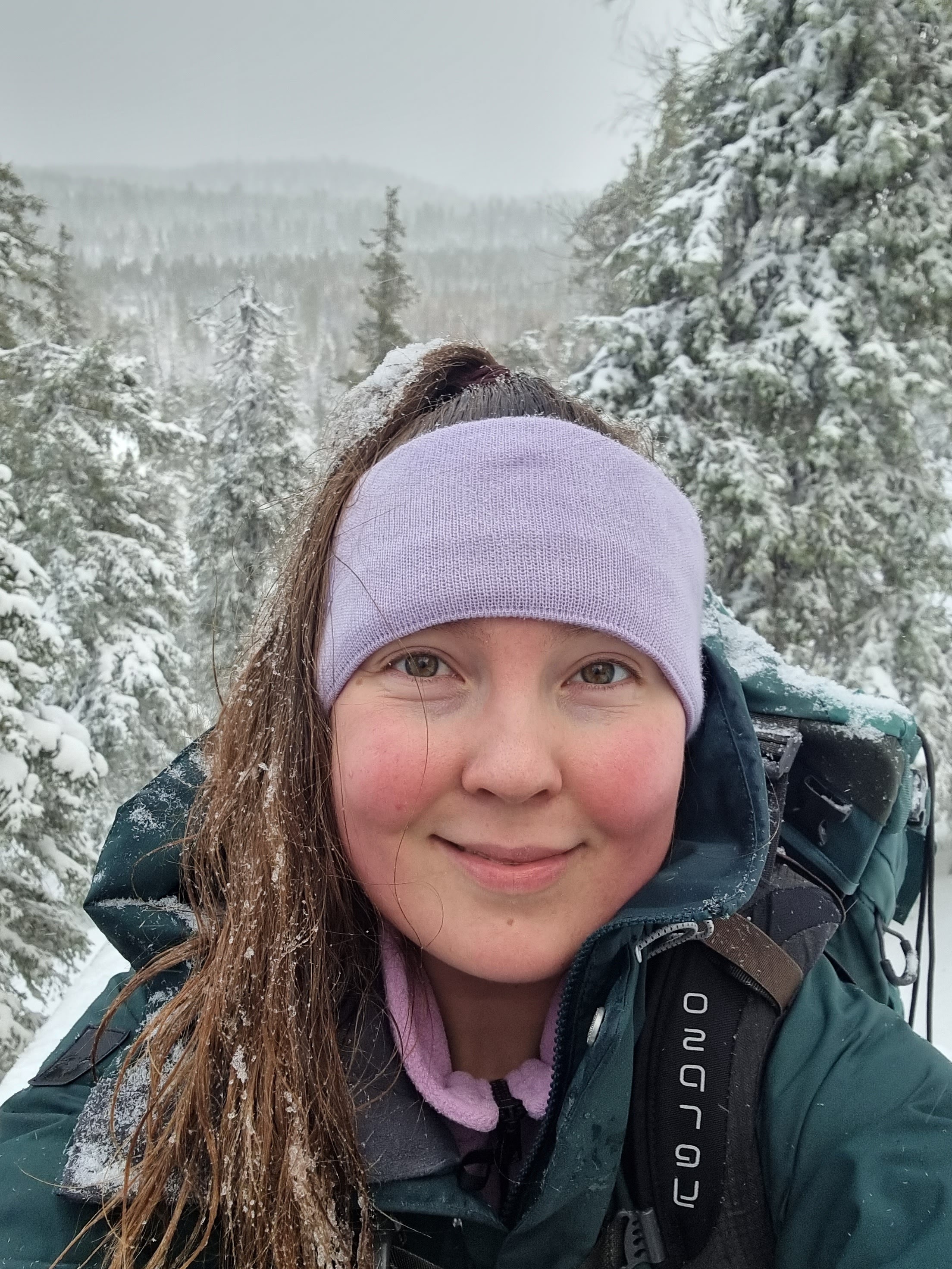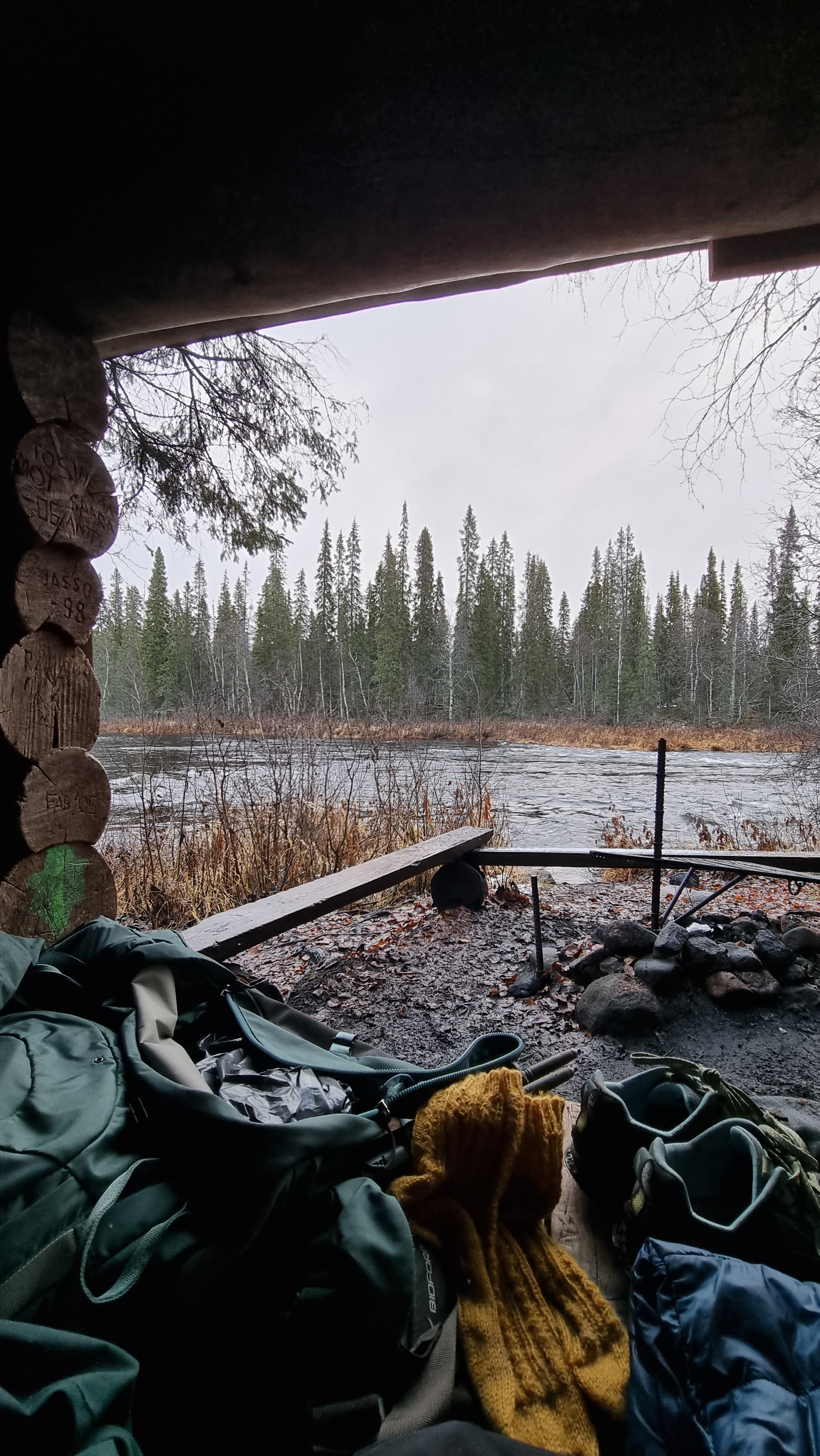 Oli aamu. Ja sehän tarkoitti sitä, että yöstä oli selvitty. Juhlan paikka! Olimme jääneet viimeisinä nukkumaan, kun yölliset vieruskaverimme olivat pikkuhiljaa heräilleet ja lähteneet aikaisin jatkamaan matkaa. Rupattelimme lähteville seurueille ja kuulimme, että osa retkeilijöistä oli päättänyt kävellä Karhunkierroksen puolikkaan yhtä kyytiä loppuun kun lumen tulo oli alkanut. Osa oli vaihtanut lennosta suunnitelmaa sään vuoksi ja sitten oli me, urheat lumessamarhaajat, joita kaikkia odotti viimeisen 15 kilometrin talvinen taivallus.