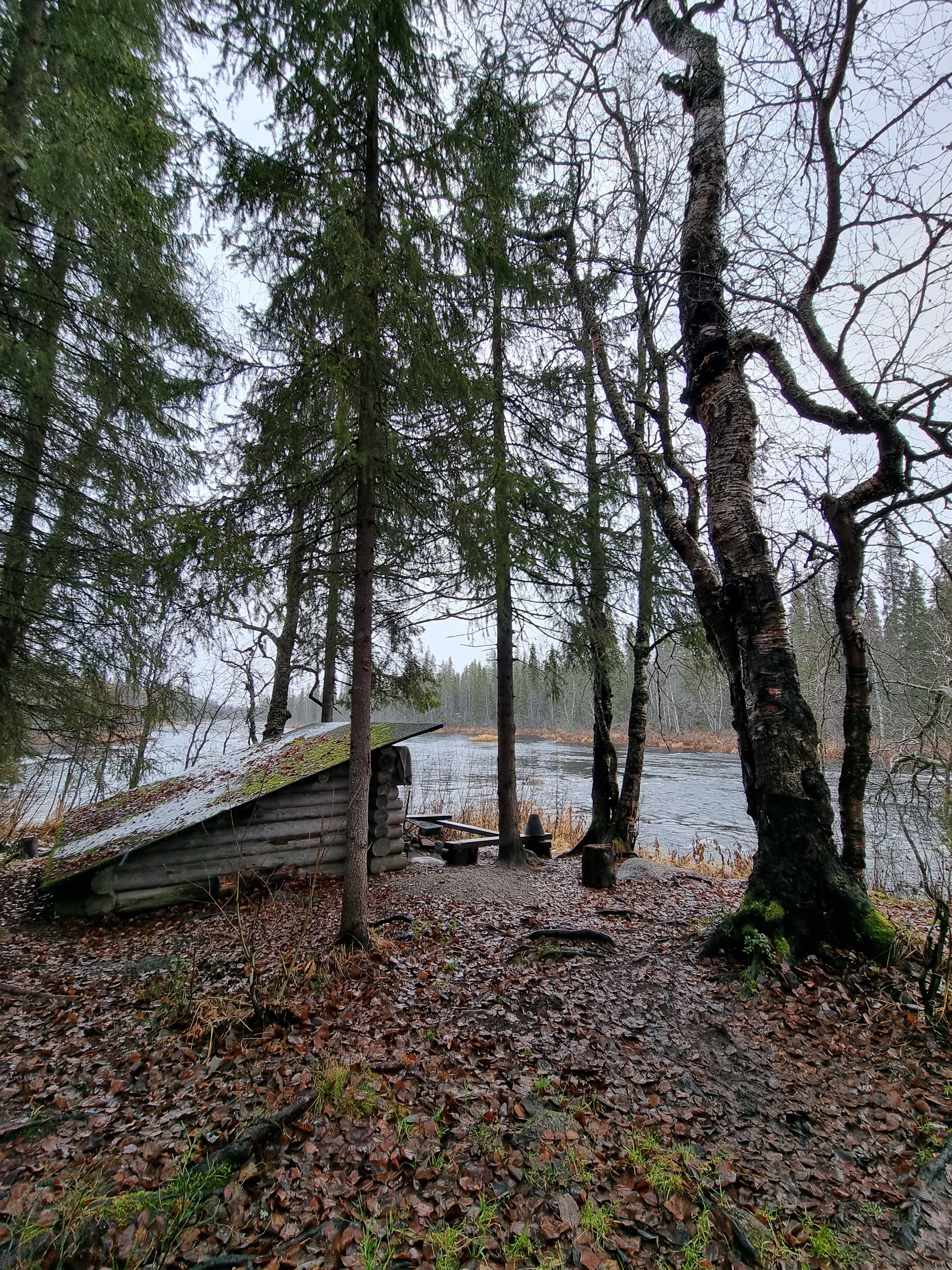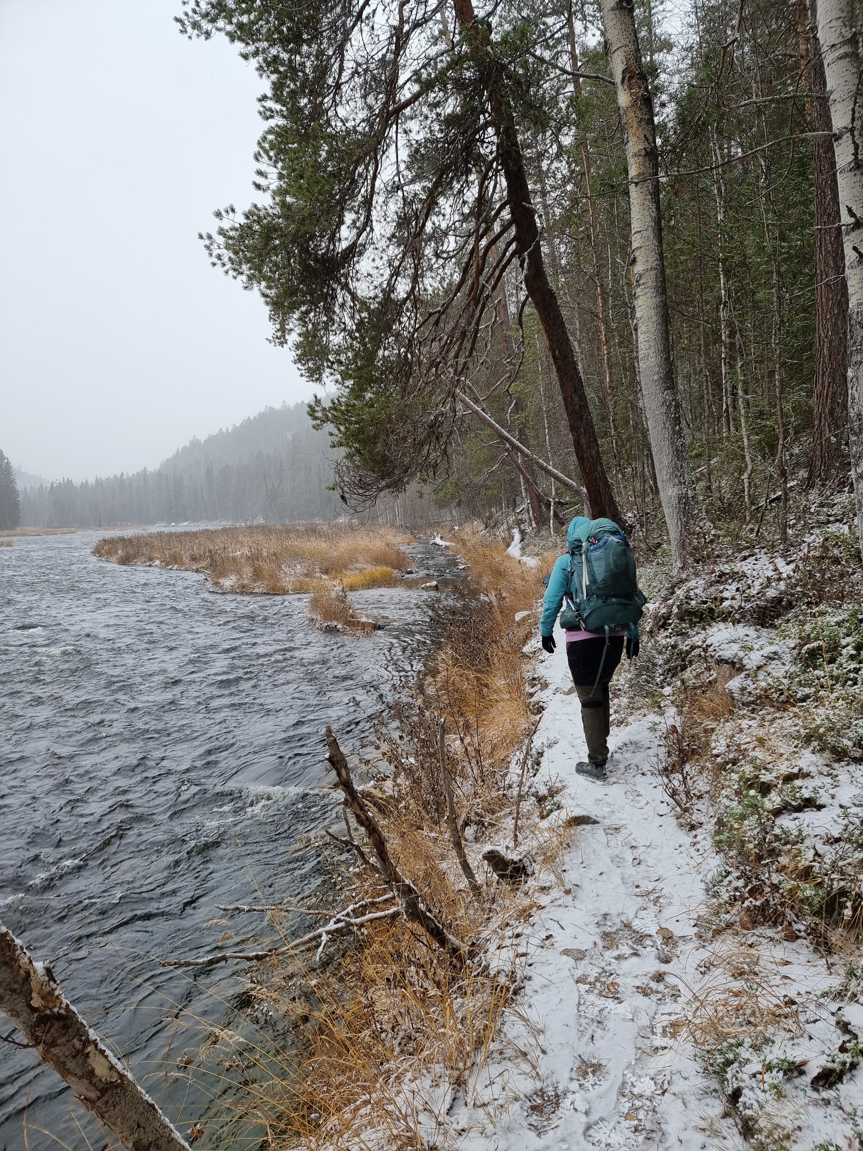 Oli nautinnollista lähteä lämpimästä tuvasta liikkeelle. Tuvan toinen yöpyjäseurue oli lämmittänyt tuvan vielä aamustakin mukavaksi, joten makuupussista nouseminen oli tällä kertaa helppoa. Maa oli mennyt yön aikana huurteeseen ja siihen oli paikoin satanut ohut kerros lunta. Sääennusteen mukaan sitä tulisi tänään reilusti lisää. Matkamme jatkuisi tänään noin 22 kilometrin verran Porontimajoelle. Toiveena on viettää seuraavakin yö tuvassa, sillä lumisateen jälkeen voi olla varustehuollolle tarvetta. Päivän tavoite on päästä mahdollisimman pitkälle kuivin varpain.