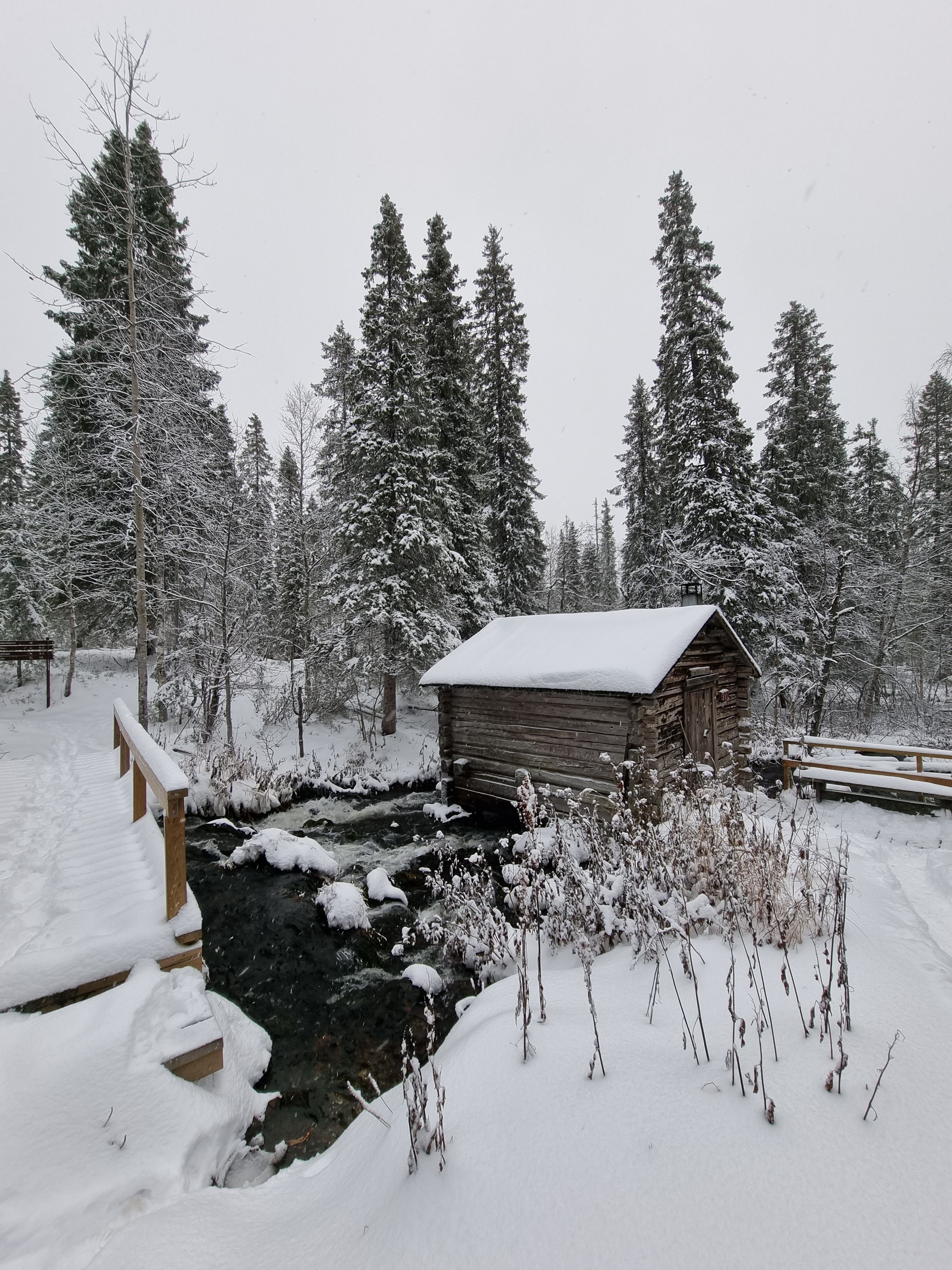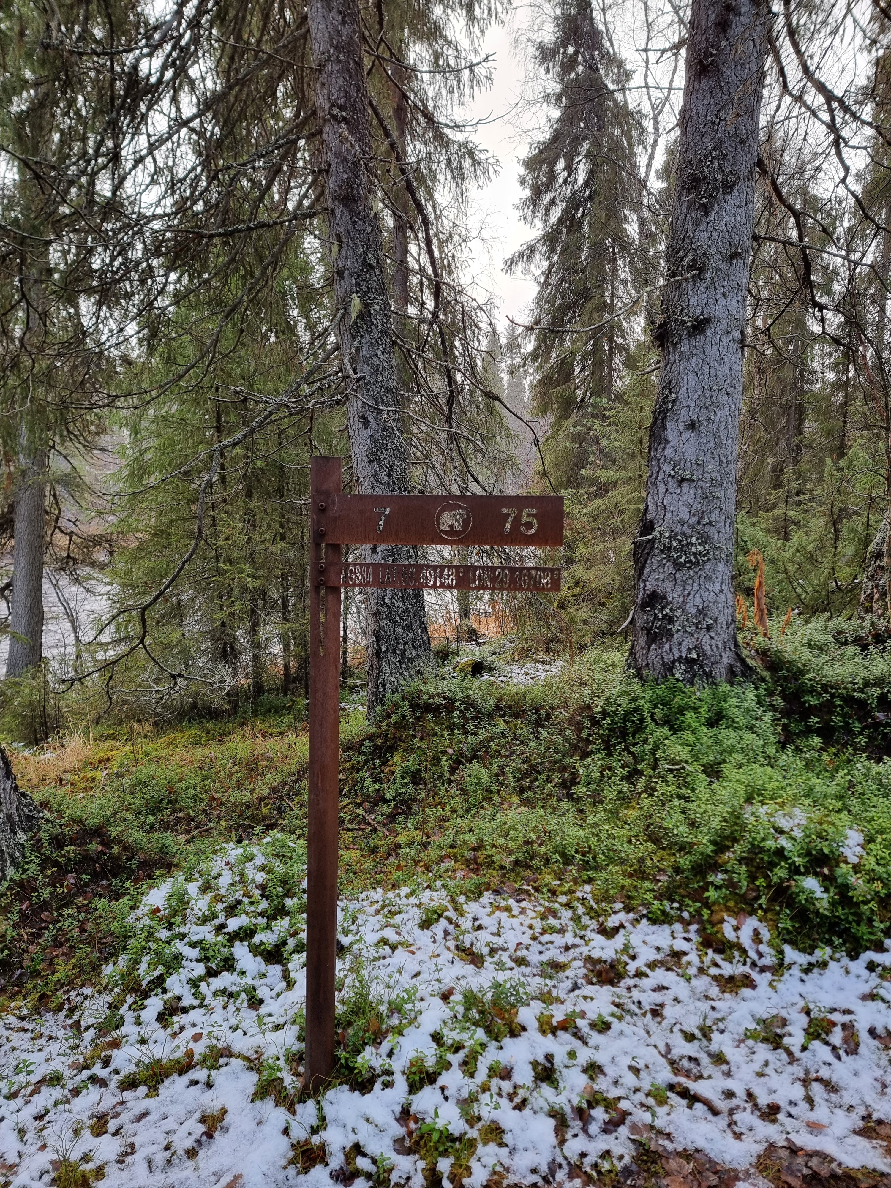Sukat kastuivat ensimmäisen tunnin aikana. Reissuun ostetut vedenpitävät sukat eivät kovin hyvin pitäneet, mutta ainakin jalat pysyivät lämpiminä, vaikka olivat litimärät. Lumisade teki hommasta rankempaa, kengät lipsuivat, polut luistivat juurakkoineen ja mäkisyys antoi hommaan oman lisäyksensä. Hetken aikaa kyseenalaistin omia valintojani, kun puuskutin märkänä lumisateessa, mutta lämmin, polun varrella odottava Porontimajoen tupa toi toivoa tarpomiseen. Onneksi upeat maisemat ilahdutti ja hetkittäin kurjuus ihan nauratti. Jonkin matkaa Karhunkierroks kulki Pientä Karhunkierroksta pitkin ja siinä tallustaessa en yhtään ihmetellyt, miksi myös se oli niin suosittu vaellusreitti.