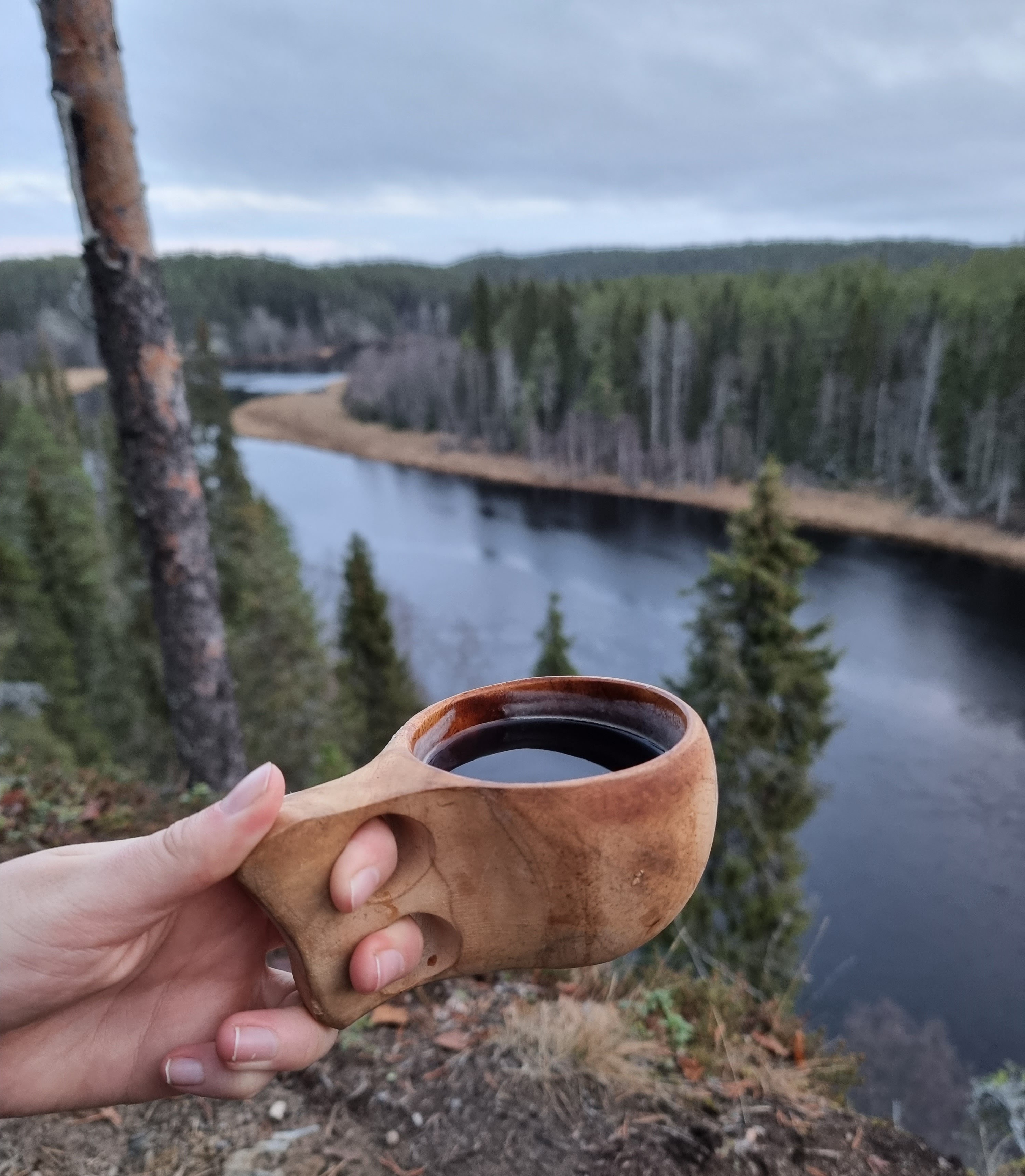 Kävelimme hyvälaatuisia polkuja pitkin kohti Taivalköngästä. Näimme matkalla joutsenia, Rupakiven, auringon pilkahduksen ja muita retkeilijöitä. Piipahdimme valmiiksi lämmitetyssä Savilammen päivätuvassa juomassa päiväkahvit. Kuivattelin kahvihetkellä vähän jalkojani, jotka olivat jo ehtineet kastua vedenpitävistä sukista huolimatta. Savilammen laavun jälkeen poikkesimme polulta oikealle, seurasimme maastoa pitkin luikertelevia polkuja ja kävimme ihastelemassa näyttävää Oulangan kanjonia.