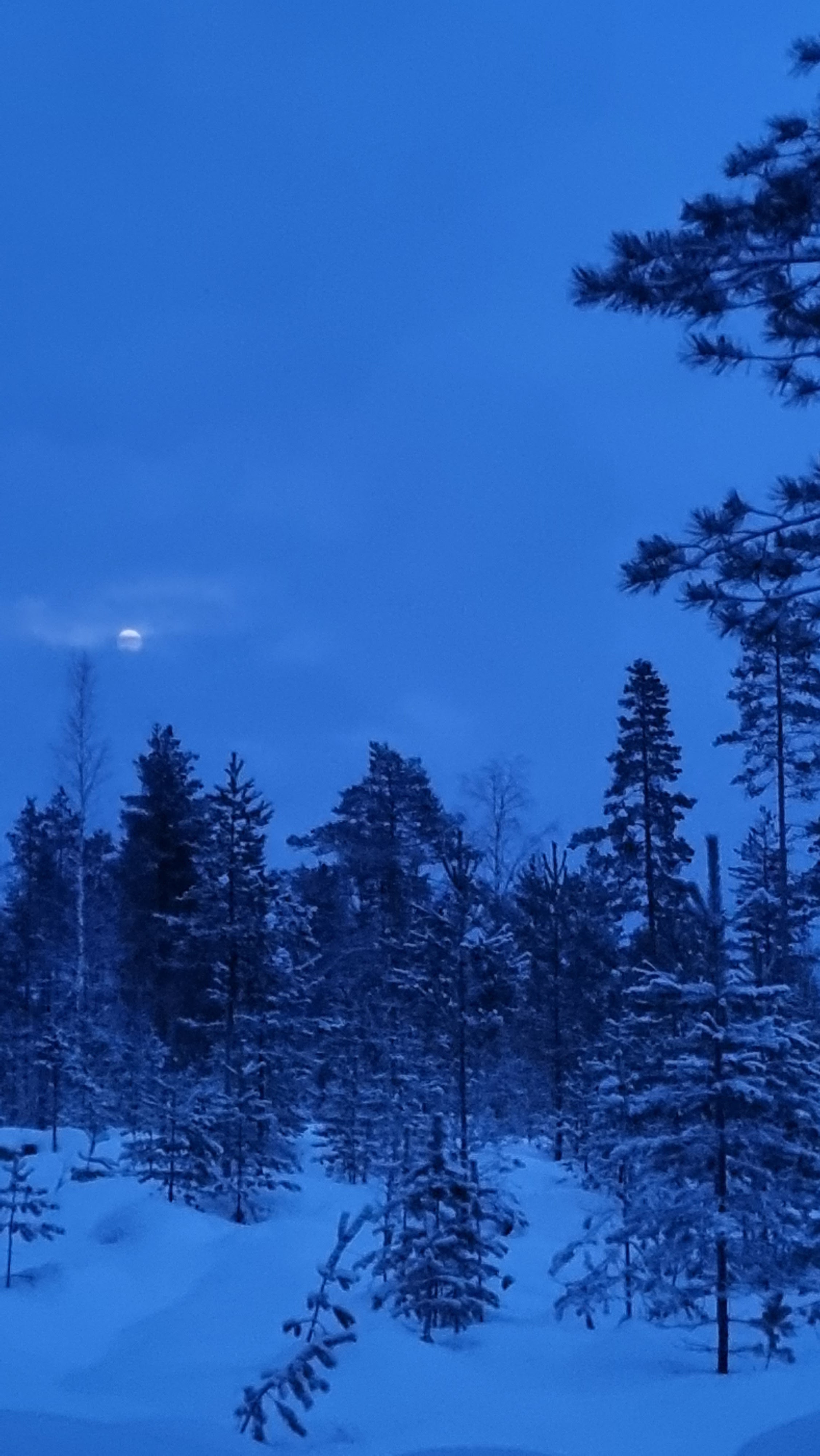 Tietenkin myös yöllä ryvettiin, eli se meni palellen. Ensimmäinen talviyö tauon jälkeen on aina totuttelua, vaikka paljon kylmemmässäkin on joskus nukuttu. Varpaat oli muutaman tunnin lepäilyn jälkeen niin kylmät, että tunto oli kadonnut kokonaan ja ne olivat väriltään vitivalkoiset. Kuumavesipulloa ei ollut mukana, tietenkään. Omilla käsillä lämmittäminen tai hankaus ei auttanut. Juoksin sitten keskellä yötä kuun valossa umpihangessa, että saisin vapaisiini lämmön ja tunnon takaisin. Hetken aikaa juoksenneltuani Tommi heräsi ja käski laittamaan varpaat rintaansa vasten makuupussin uumeniin. Se toimi! Tunto ja väri palasi ja pääsin jatkamaan uniani.