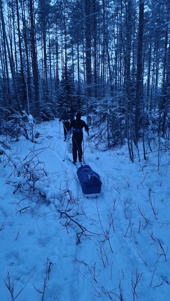 Alkoi hämärtää ja yhden retkikunnan jäsenen oli aika palata kotiin tuoreen jälkikasvun luo. Me muut jatkoimme matkaa. Hämärän tullen tulee helposti pientä moraalin laskua, niin hiukan nytkin. Lisäksi reitti oli aika mäkinen, porukka veti ahkioita hiki päässä. Risukkoisuus ja vähälumisuus tarjosi omat haasteensa.