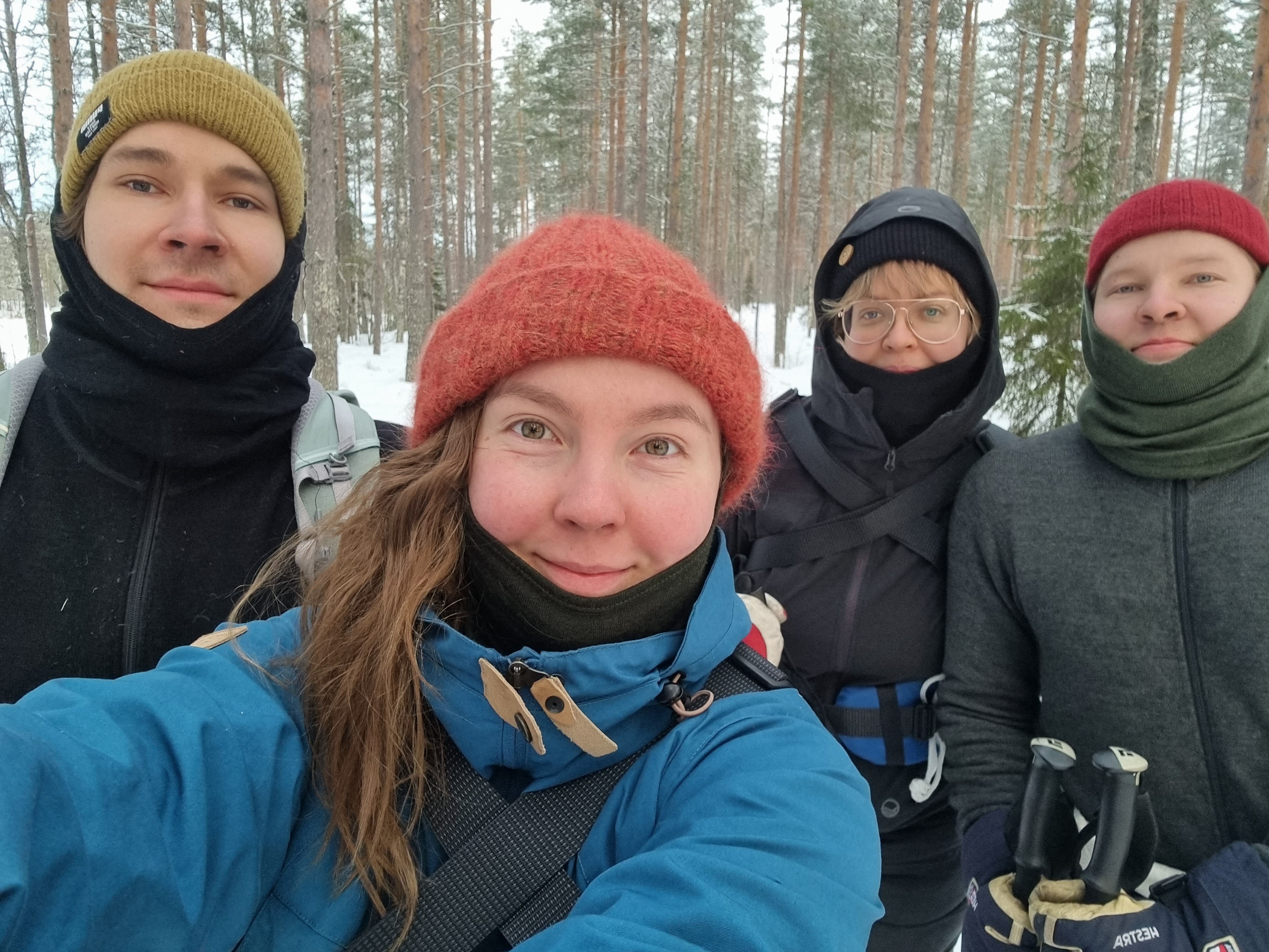 Iloiset ystävämme ottivat meidät vastaan ja sitten lähdettiin koko joukko hiihtämään Eetun suunnittelemaa seikkailureittiä pitkin kohti laavua. Reittimme kulki Pyhä-Häkin kansallispuiston lähettyvillä. Hiihdimme ensin merkattuja polkuja pitkin, mutta sitten lähdimme suunnistamaan omiamme. Ilmassa on mahtava jännityksensekainen seikkailufiilis eikä tiennyt yhtään, että mitä odottaa!