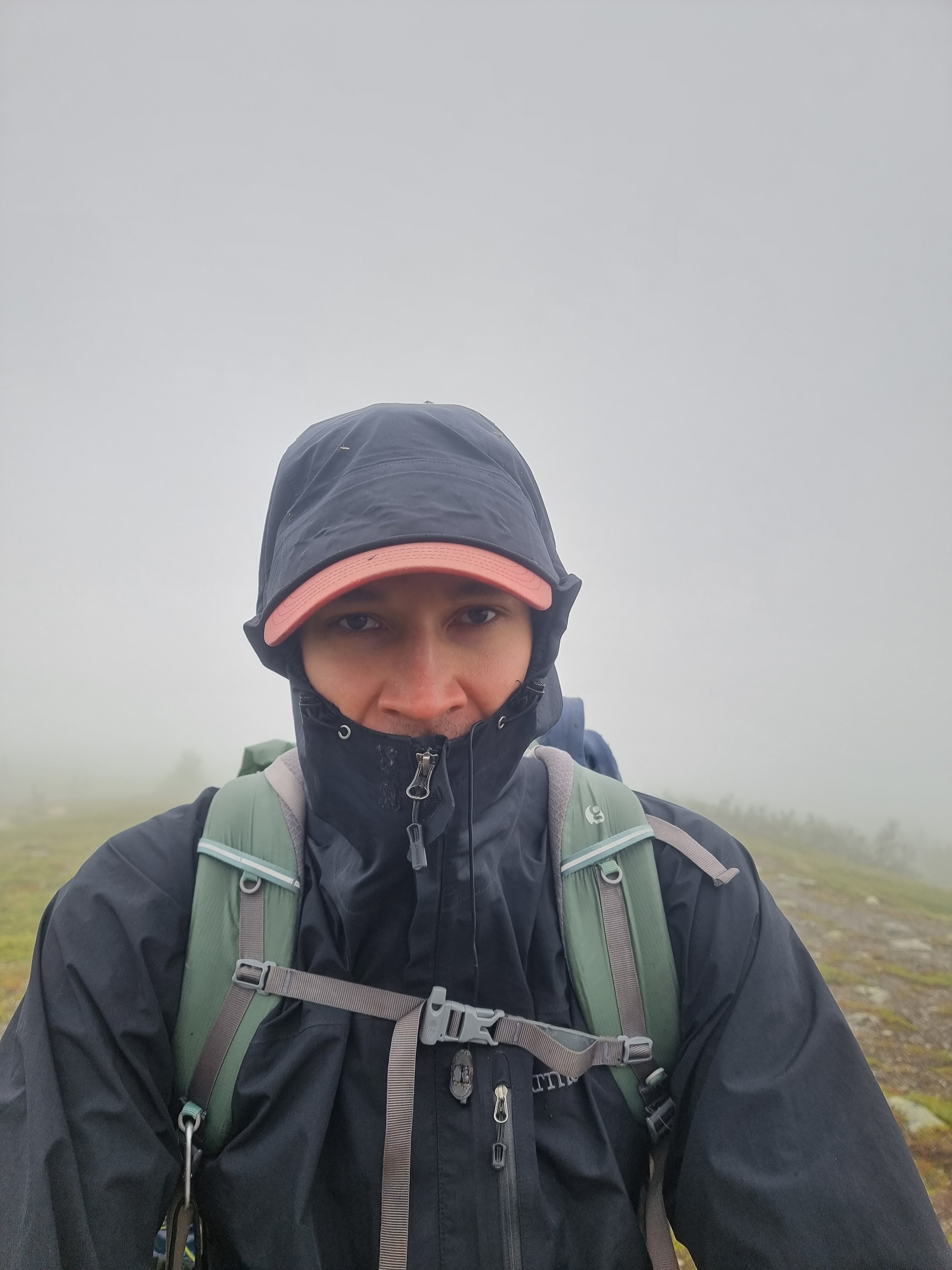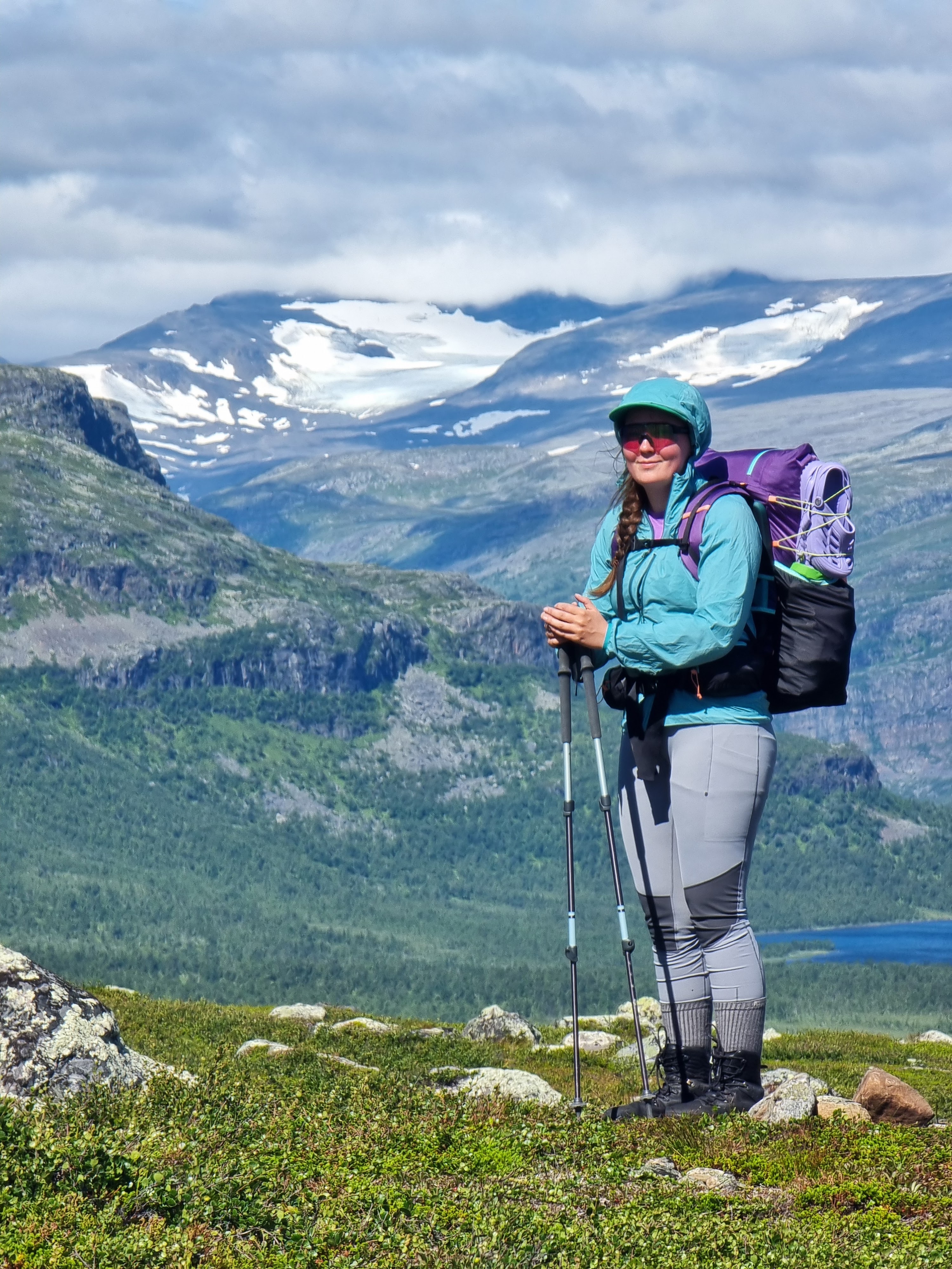 Pääsimme huipulle juuri kun sade alkoi ripsiä. Tuuli yltyi. Se viilensi ja vei sääsket mennessään, aivan kuten olin toivonut. Hihkuin innoissani Katrille ”Jess! Me tehtiin se!”. Hikoilun ja nousun tuoma adrenaliini sai olon voitokkaaksi ja takana siintävä maisema palkitsi. Ehdimme ennen sadetta, olimme perillä ja täällä oli upeaa!