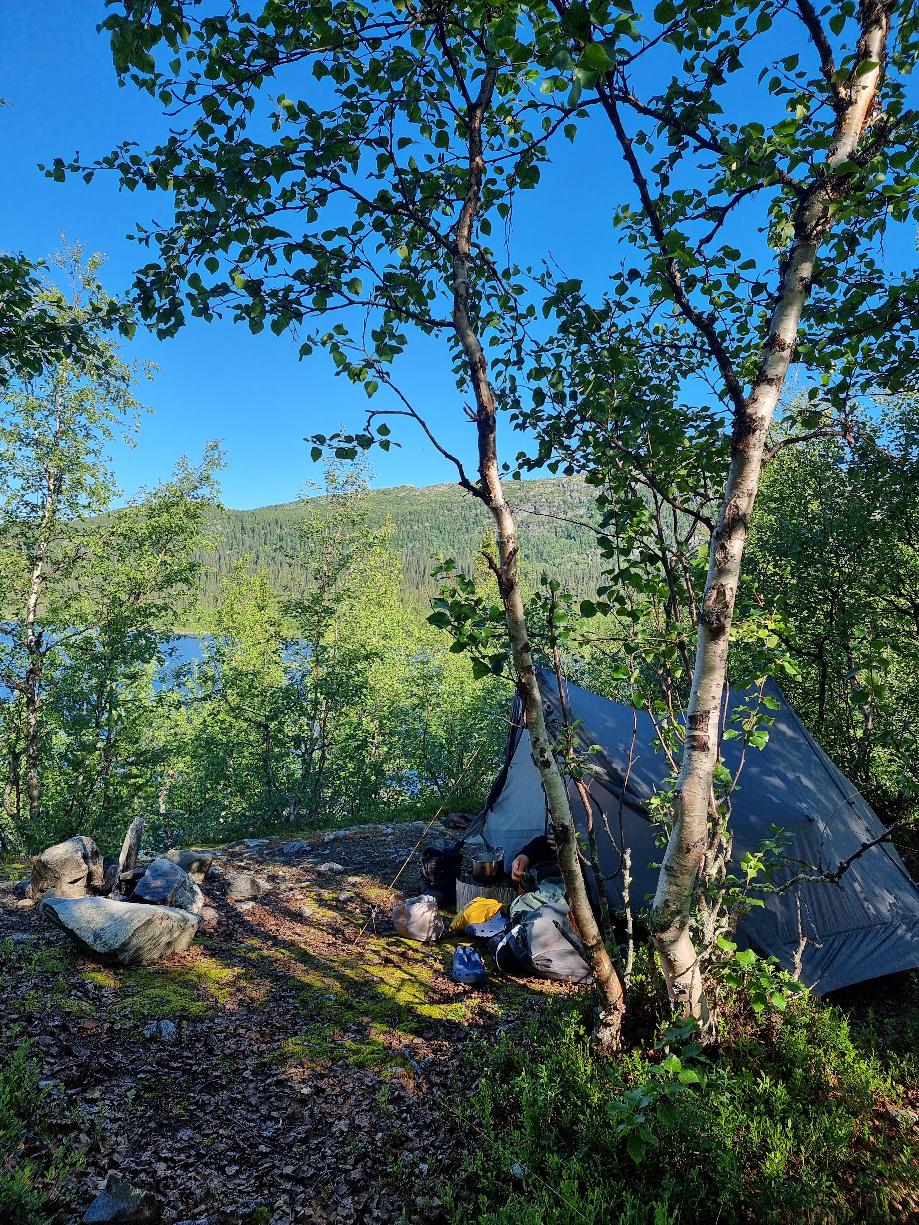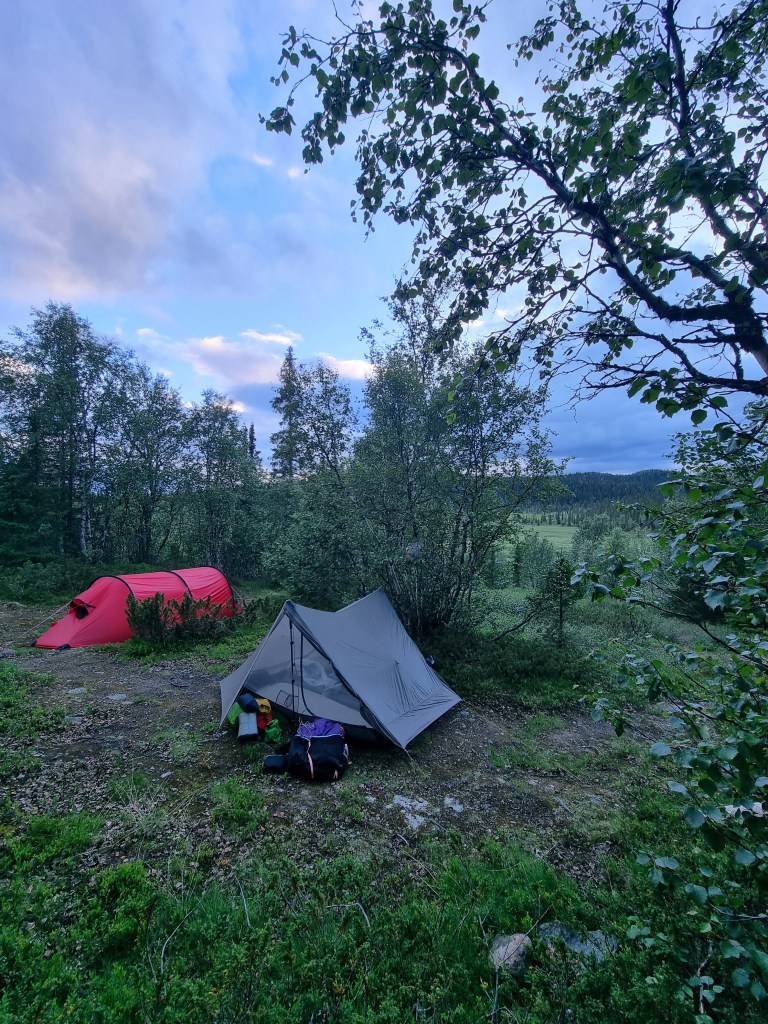 Kungsledenin varrella on suositeltavaa majoittua maastoon kuluneille leiripaikoille, joten läheltä pientä virtaavaa puroa löytyi asialliset paikat teltoille. Sääskien kanssa kamppailu jatkui siihen saakka, kun sai viimeisen kerran teltan ovet kiinni ja läpsyteltyä kaikki sisälle tulleet hyttyset kuoliaiksi. Oli taivaallista riisua hyttysverkot naamalta ja vaihtaa hikiset kuorivaatteet viileämpään varustukseen.