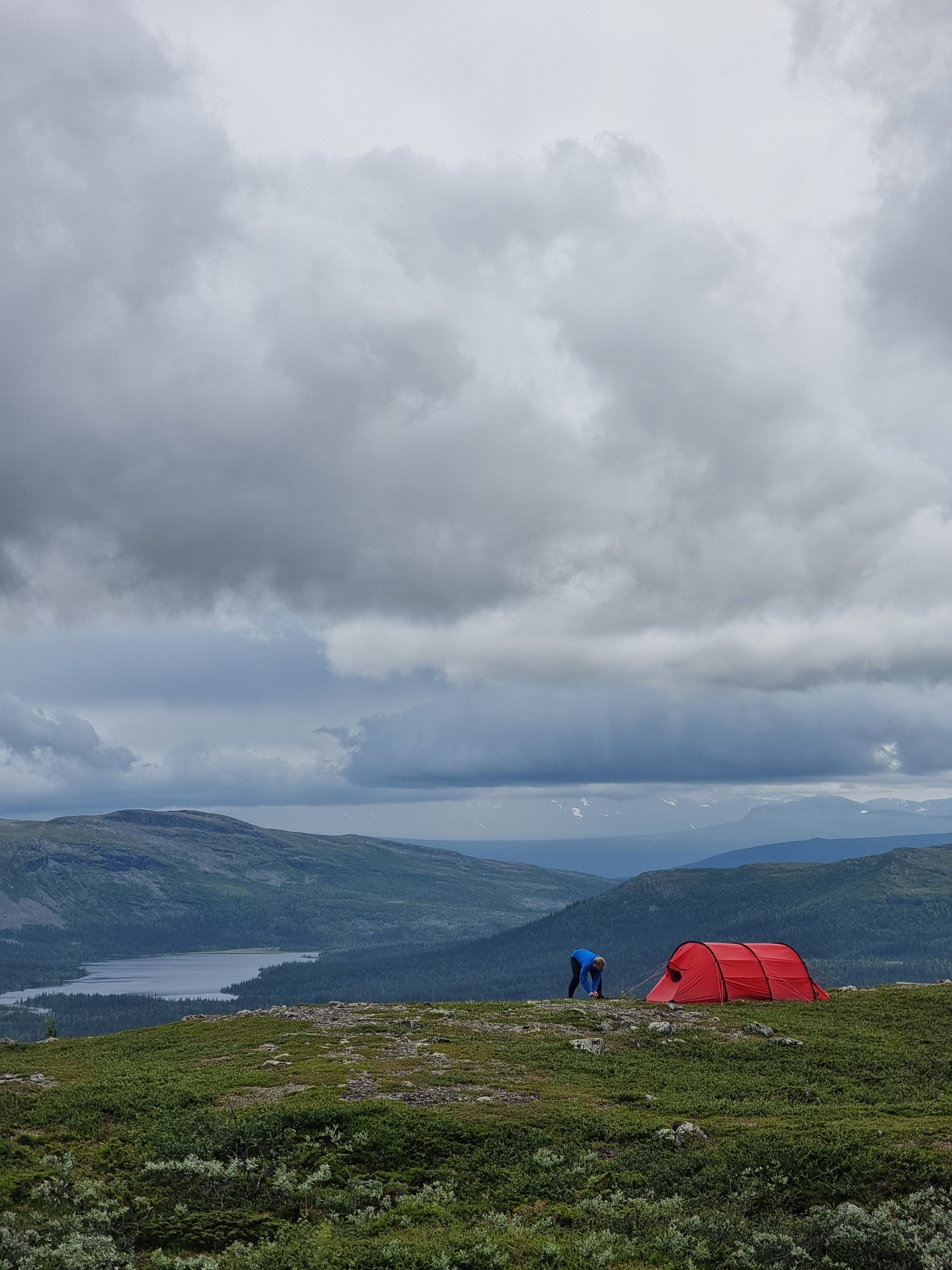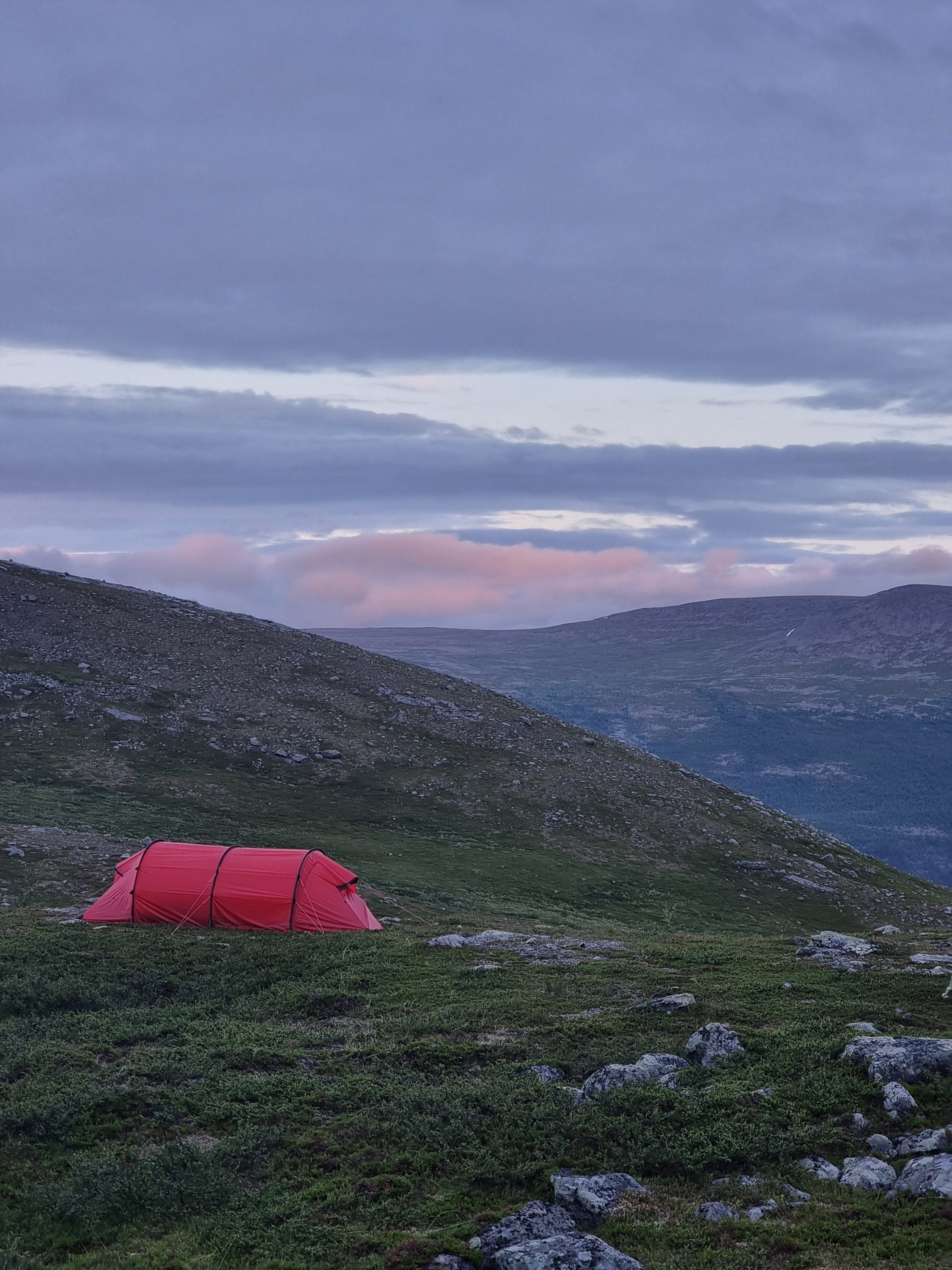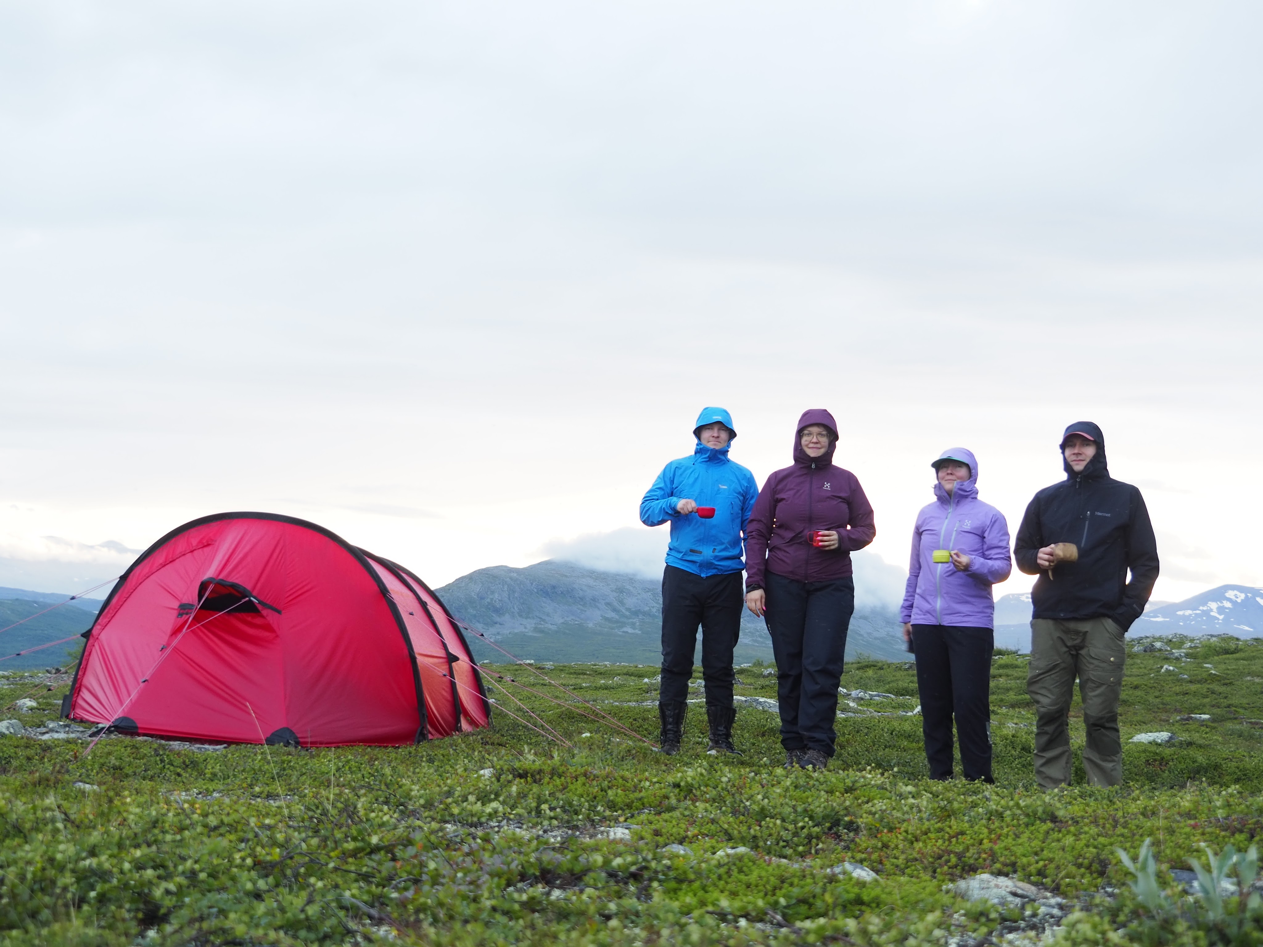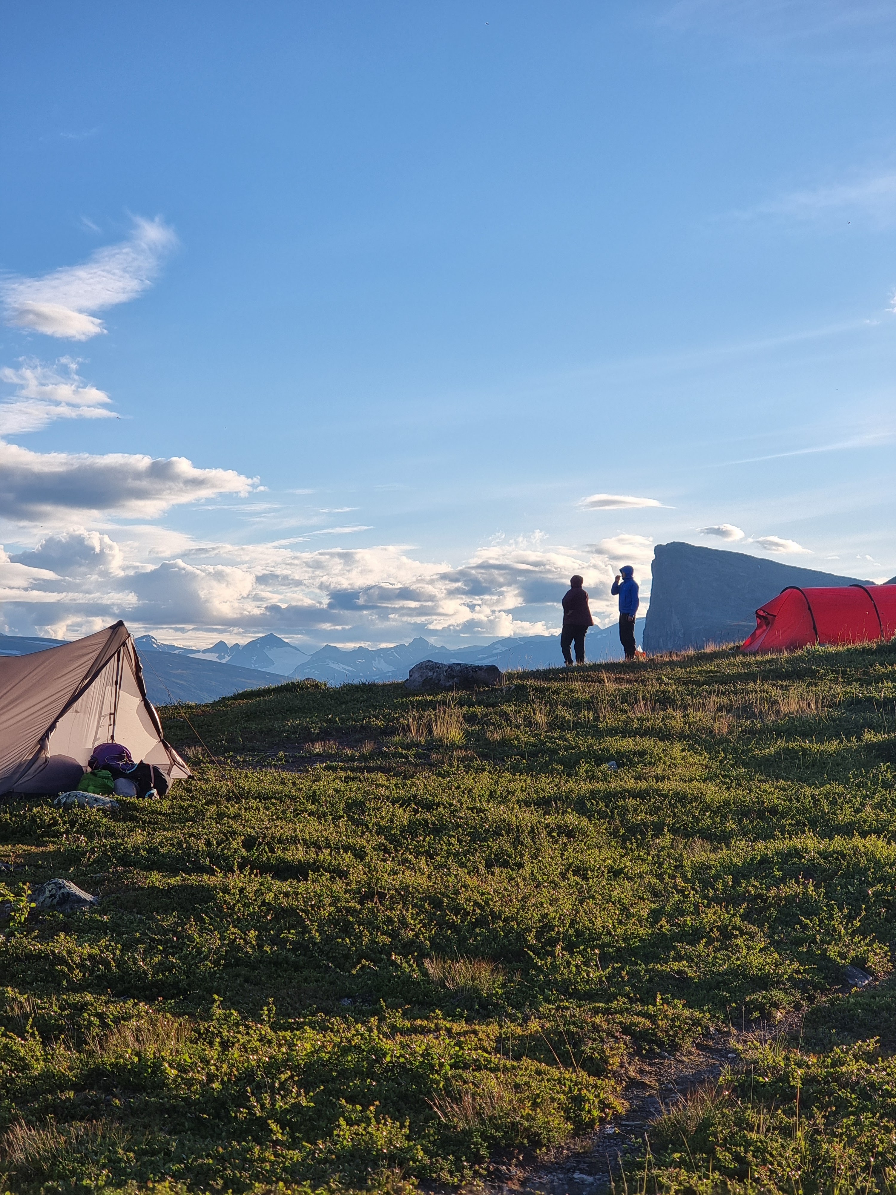 Reissulle oli luvattu vain lempeitä tuulia, joten olimme päätyneet ottamaan meidän kevytretkeilyteltan Gossamer Gear The Twon. Halusimme testata sen toimivuutta vuorilla. Huono kelin sattuessa voisimme kaikki majoittua Eetun ja Katrin Hillebergiin, joka varmasti kestäisi kaiken. Komea punainen Hilleberg Kaitum 3gt näytti upealta tunturimaisemaa vasten ja piti todella maltillista ääntä tuulessa, ihan kateeksi kävi. Samalla harmittelin, että olimme Tommin kanssa toistamiseen unohtaneet korvatulpat kotiin. Kevytretkeilyteltan räpätys häiritsi vähän aamuyön unia.