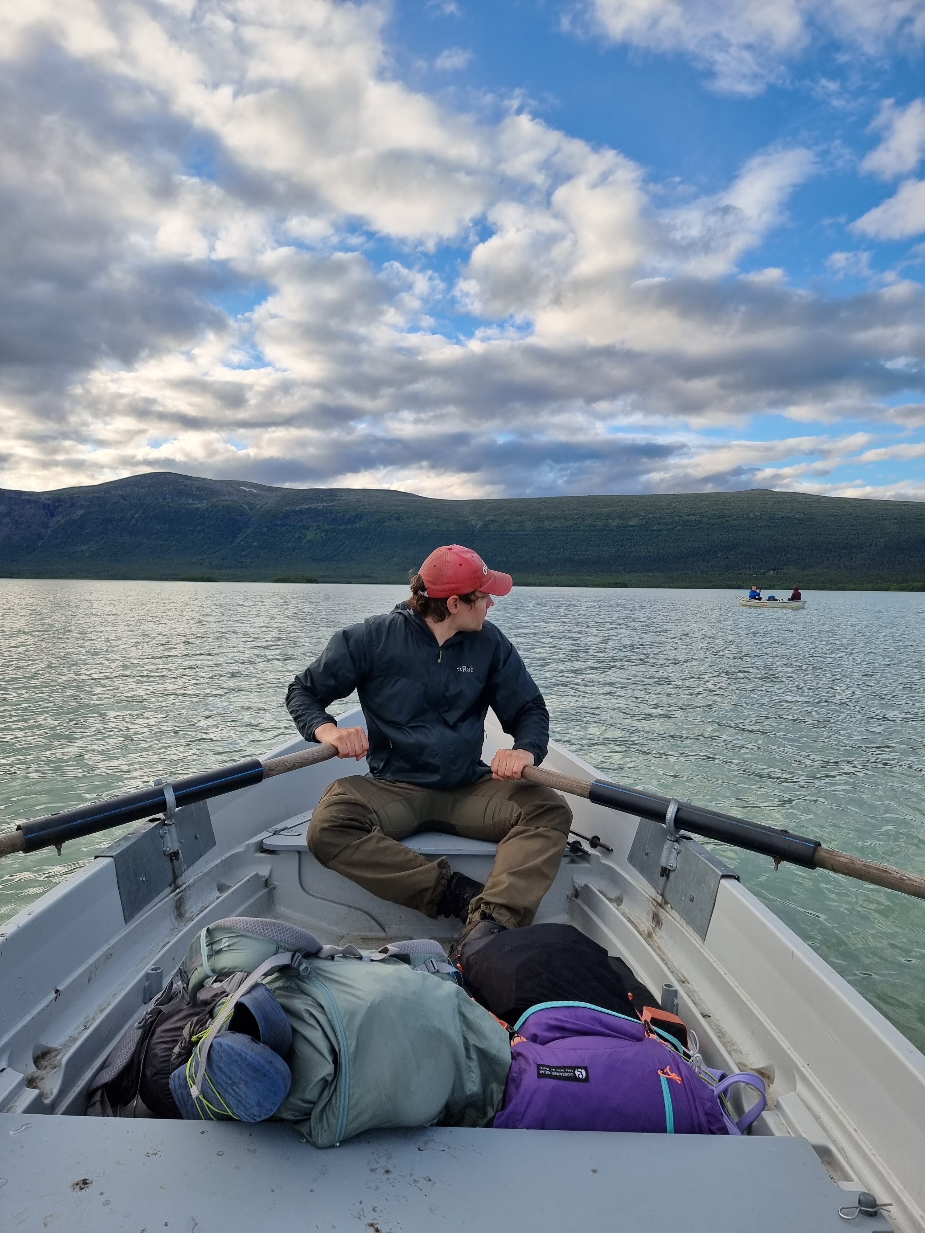 Tällä kertaa onni ei ollut myötä ja Aktsen puolella järveä oli vain yksi vene. Se tarkoitti matkan soutamista kolmeen kertaan. Olimme jo sateen ja sumun takia odotelleet koko päivän ja järven ylitys kolmeen otteeseen toisi vielä enemmän viivästystä paluureissuun. Onneksi rinkat kuitenkin kevenivät koko ajan, joka taas puolestaan vauhdittaisi menoa. Haaveilin jo hetken aikaa moottoriveneen kyydistä, joka liikennöi samaa soudettavaa ylitystä, mutta emme olleet ottaneet siihen käteistä mukaan. Nyt oli turha perääntyä ja muutenkin tuon venekyydin hinta tuntui hiukan suolaiselta.