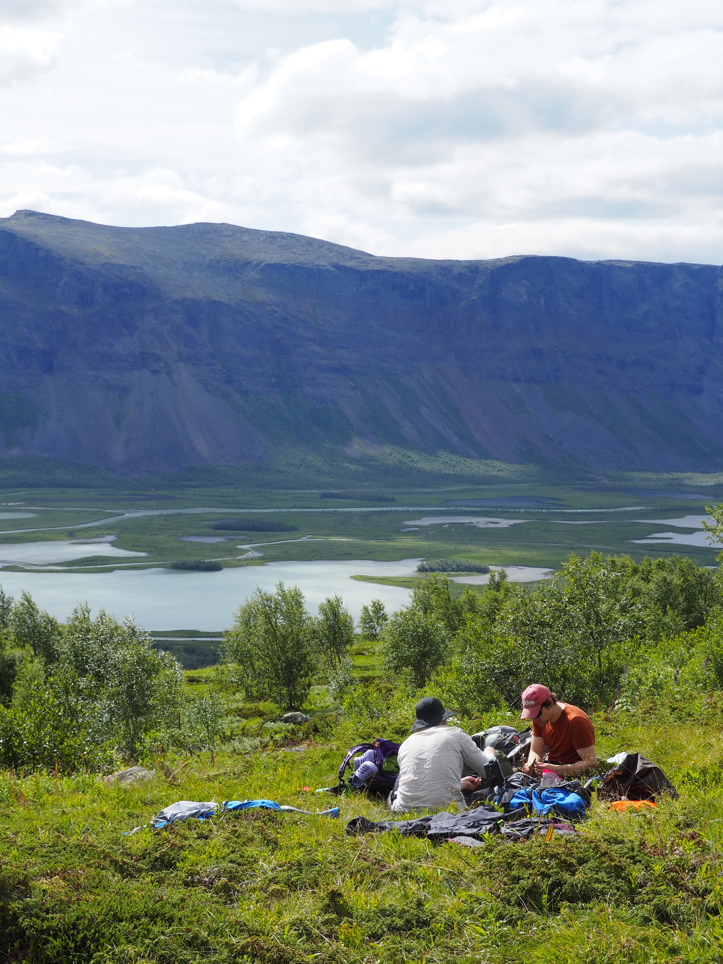 Pidimme pienen evästauon ennen laaksoon sukeltamista ja katselimme korkeuksista minne reittimme veisi illan päätteeksi. Päivän aikana olisi tarkoitus soutaa osa matkasta, noin kolmen kilometrin mittainen Lájtávrren ylitys. Katselimme suoraan edessä häämöttävää Tjahkelij-vuorta ja mietimme, että tuo on kyllä kaukana. Rupesin tihrustamaan karttaa ja huomasin, että illan päämäärä olisi itse asiassa vielä kauempana, kyseisen vuoren toisella puolella ja pieni jännitys hiipi sisuksiin. Matka näytti mahdottoman pitkältä ja alas laaksoon laskeutuminen ei houkuttanut lämpimän sään ja sääskien vuoksi tippaakaan.