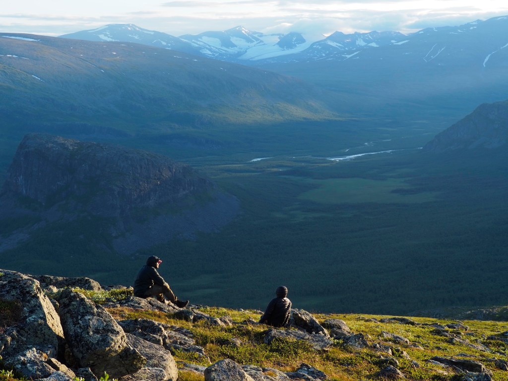 Ilta oli upea. Kävimme pienellä iltakävelyllä ja katselimme tuntikausia Sarekin sydämeen avautuvia maisemia. Kaikkialla oli kivikkoista avotunturia, jokilaaksoja, lumihuippuisia vuoria ja koskematonta erämaata. Silmänkantamattomiin vapautta. Sydämeni oli täynnä onnea ja mietin, ettei tässä maailmassa ei ole olemassa sellaista surua, jota tämä maisema ei edes pikkuriikkisen laimentaisi.