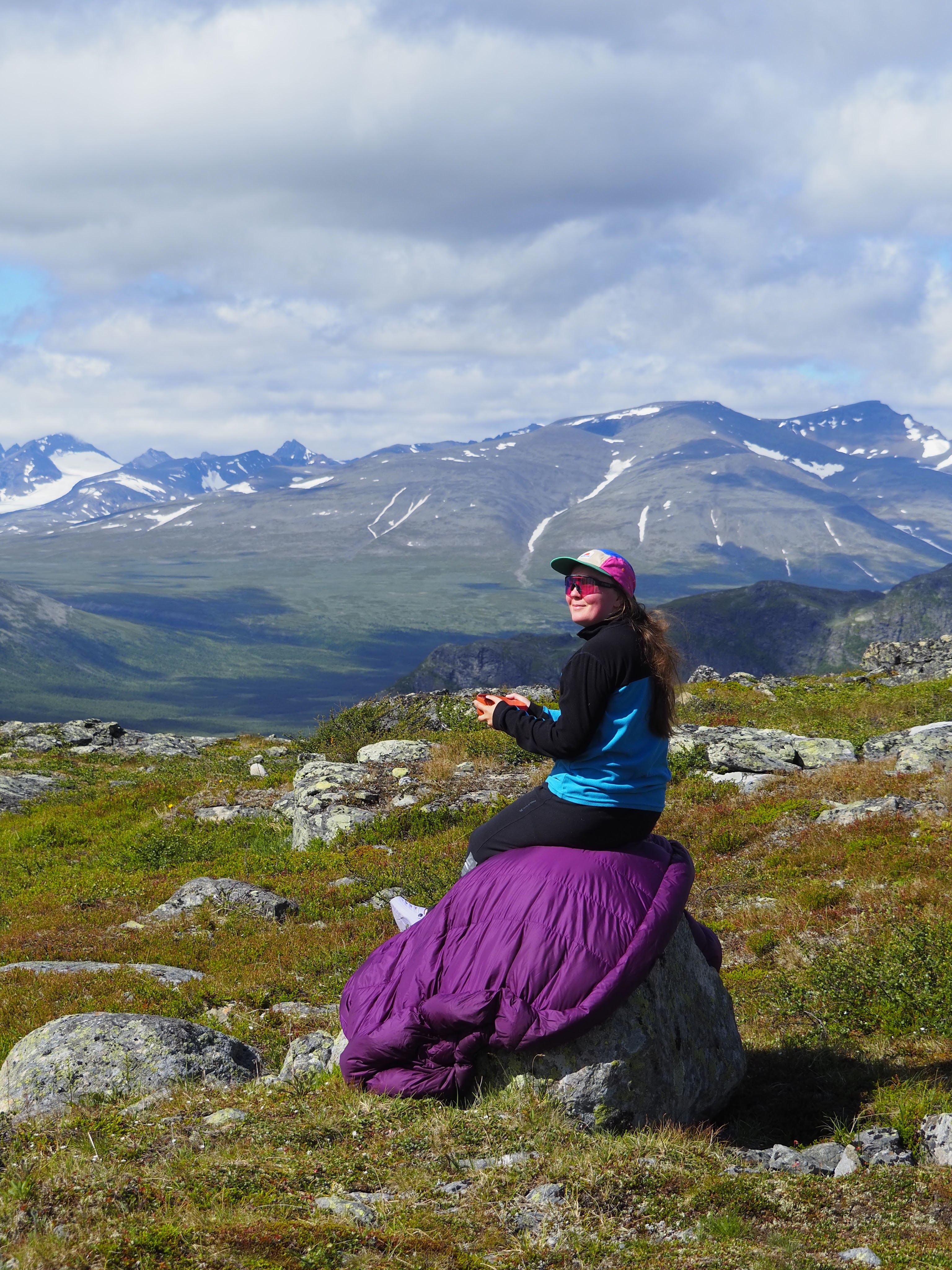 Ensimmäiset kilometrit pääsimme kävelemään helppokulkuista maastoa avotunturissa. Aurinko paistoi, mutta rinteillä puhaltava tuuli piti olon mukavana. Kaikki etukäteen katsotut sääennusteet olivat menneet pieleen. Lämpöä oli reilusti enemmän, mitä päiviksi ja öiksi oli luvattu. Kolmen vuodenajan makuupussi -9 asteen comfort -arvolla oli aivan liian kuuma ja päädyinkin nukkumaan se peiton tapaisesti aukinaisena melkein koko reissun. Olen aina aikaisemmilla Lapinreissuilla palellut samalla pussilla, vaikka sääennusteet ovat olleet lämpimämmät. Nyt haaveilin joka ilta quilt-tyylisestä makuupussista.