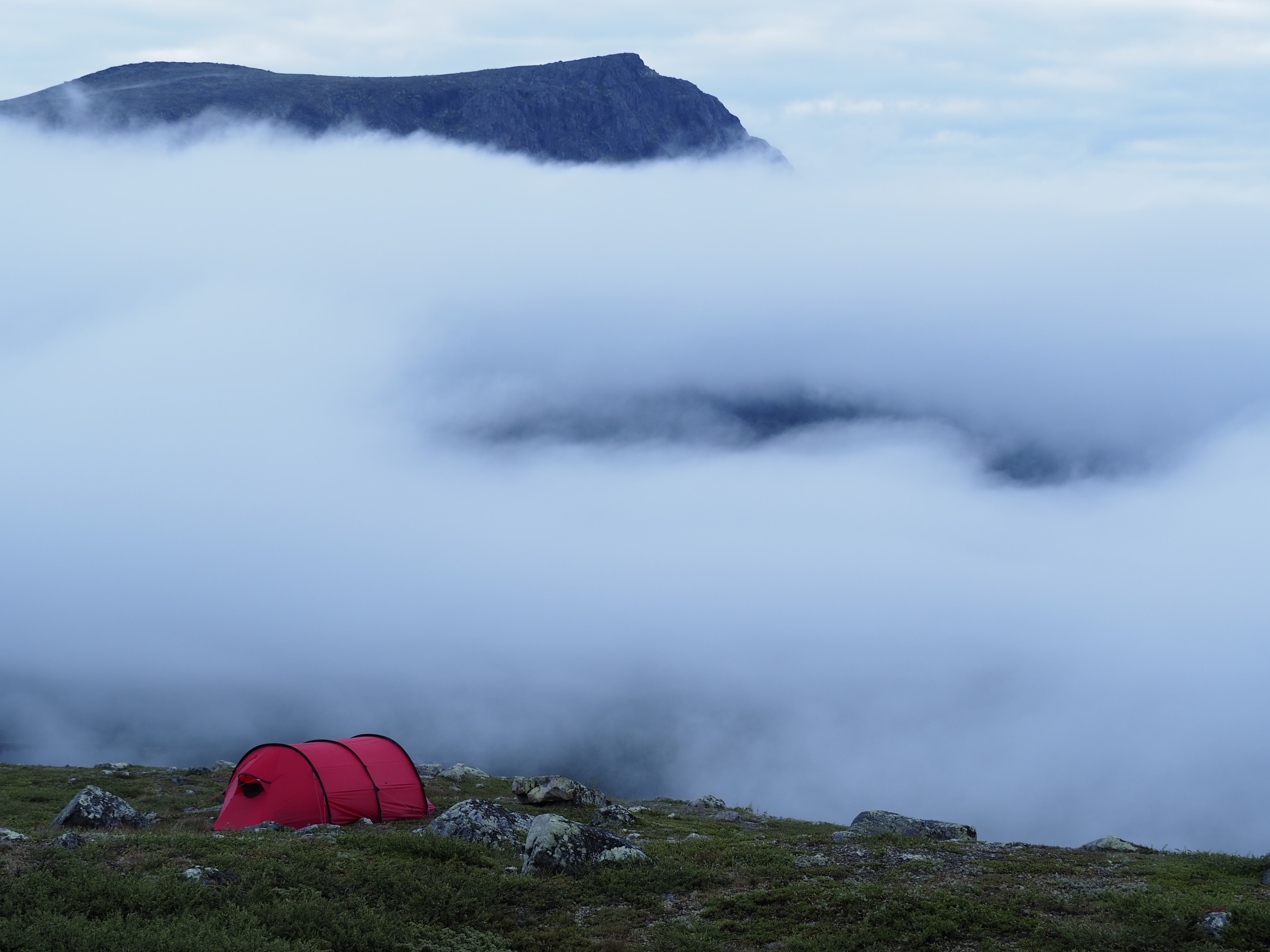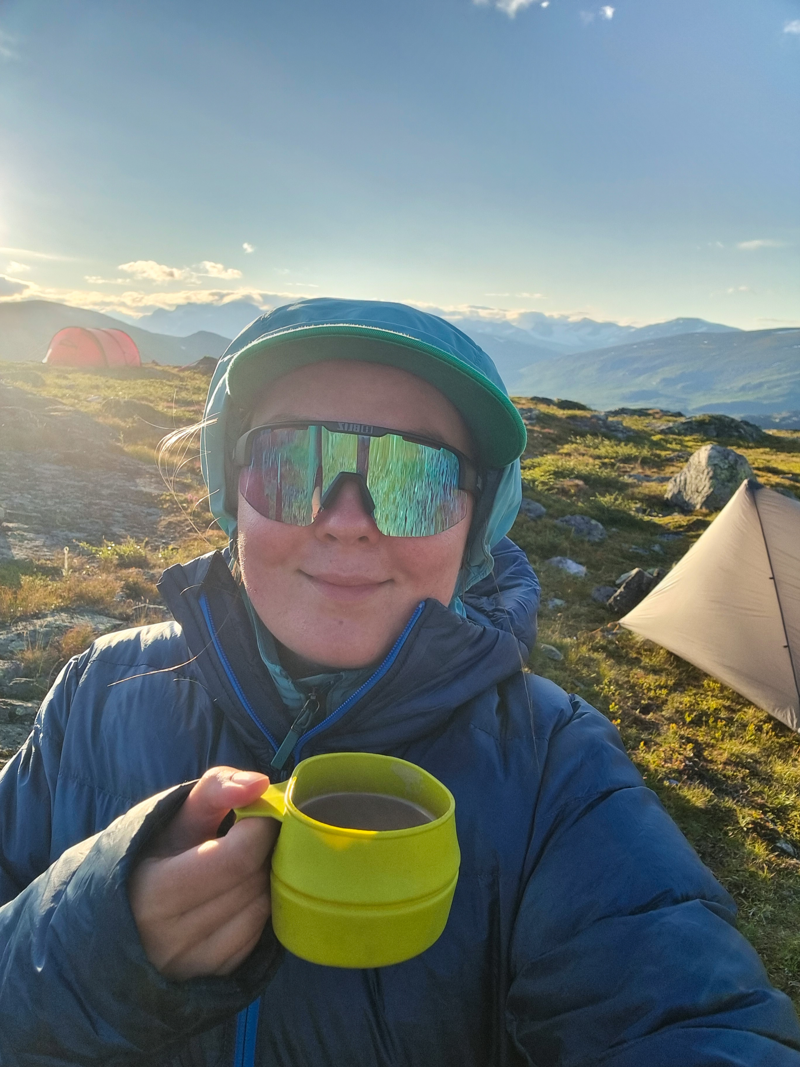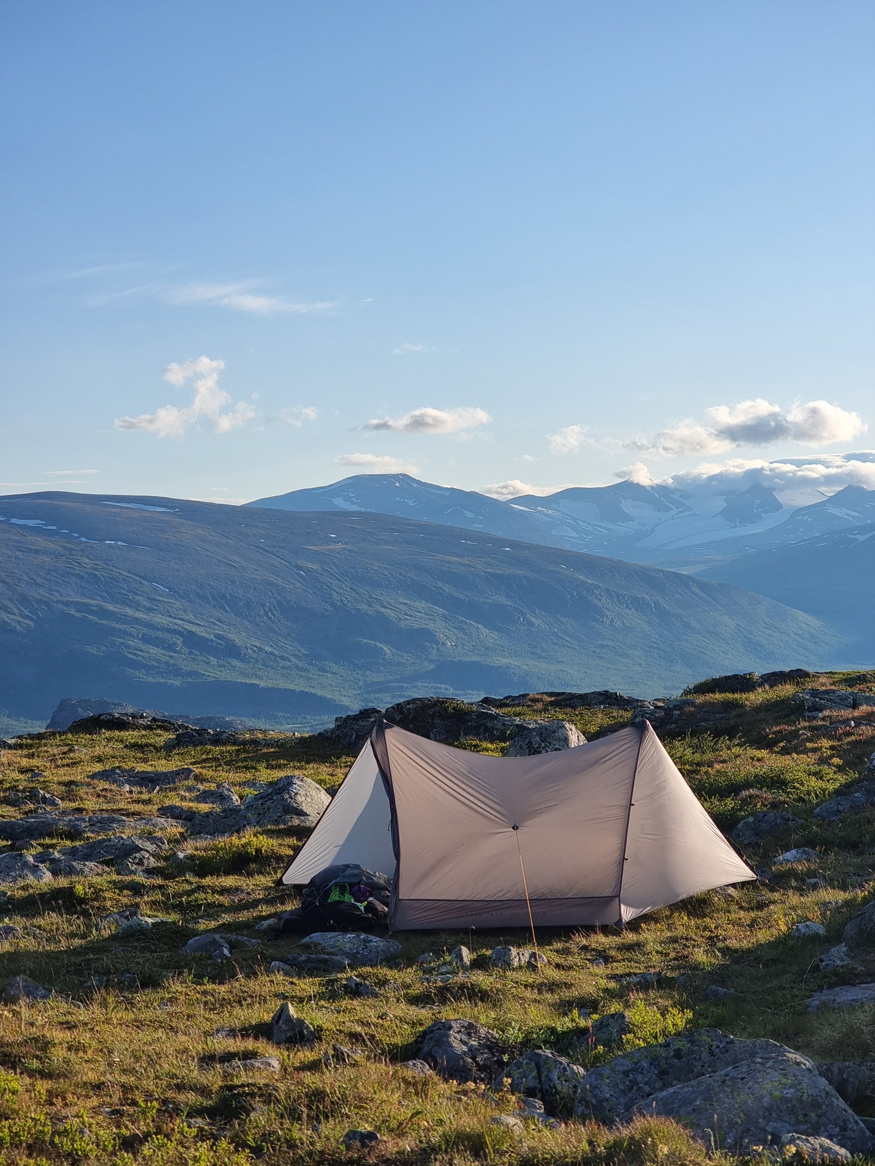 Aurinko lämmitti telttaa. Tommi oli jo herännyt ja kuivatteli sadepäivän kastelemia varusteita ulkona. Oli lämmintä, mutta vuorenrinteellä tuuli sen verran, että kaikki sääsket pysyttelivät poissa. Avasin teltan hyttysverkon, kaadoin Nalgene-pullosta vettä titaanikattilaan, kääsin kaasun päälle ja naksautin keittimeen liekin. Kaasukeittimen tuttu pöhinä yhtyi tuulessa lepattavaan telttaan ja sai mielen levolliseksi. Katsoin ympärilläni kohoavia suuria vuoria. Vasemmalla kaukaisuudessa siinsi korkeat lumihuippuiset vuoret ja suoraan edessäni matalamman ja tylppäpäisen Tjahkelij-vuoren seinämä. Näkymän edessä seisoi ystäviemme räiskyvän punainen teltta, joka tuntui tarkoitetun juuri näihin maisemiin.