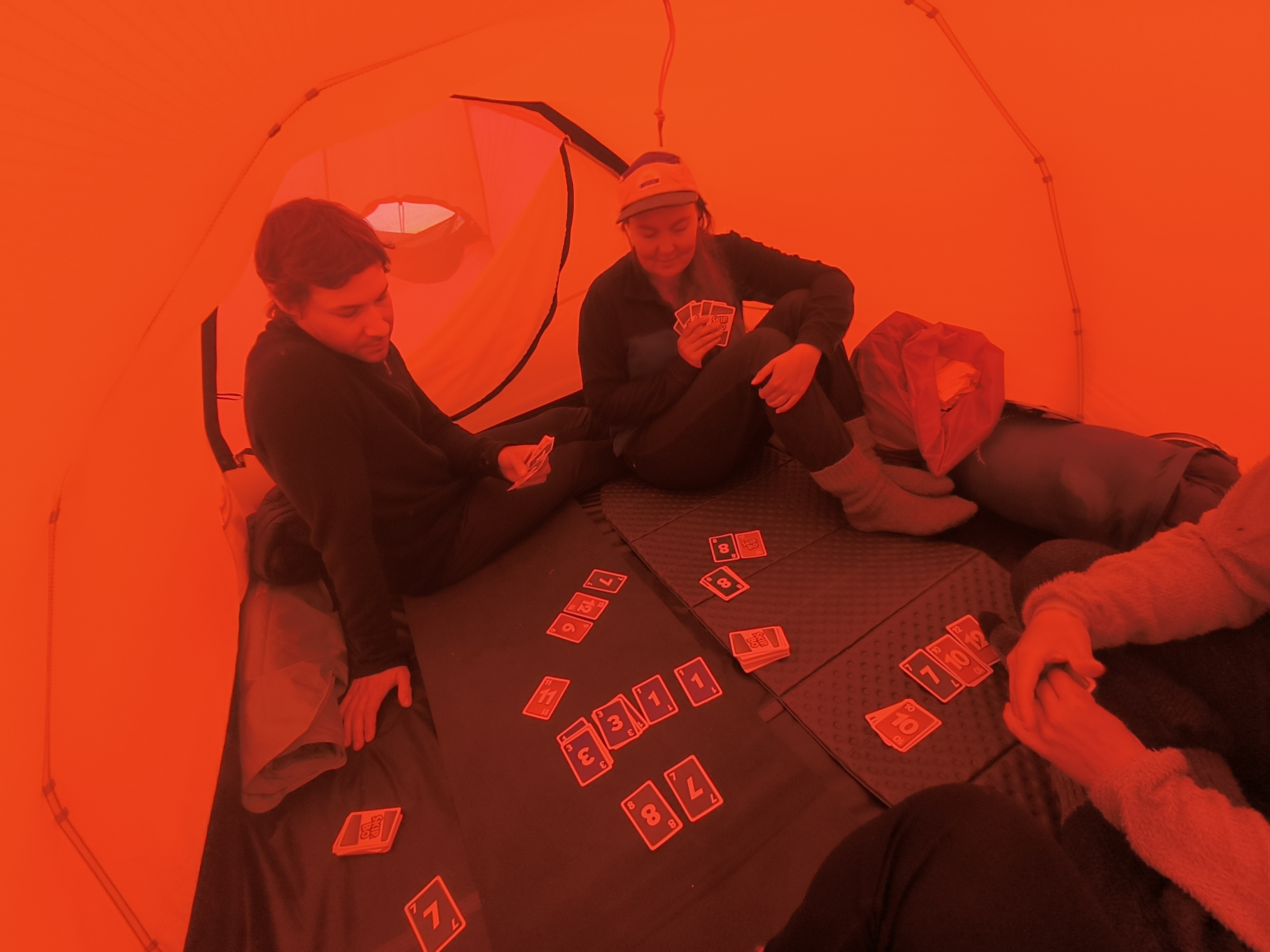 Kun aamulla kuulin sateen ropinan telttakankaassa käänsin onnellisena kylkeä. Tänään ei olisi kiire mihinkään. Nousimme hitaasti ylös vasta aamupäivän puolella. Kaikkialla oli märkää ja sumuista. Otin lekottelusta kaiken irti. Söimme rauhassa aamiaista sisällä tilavassa Hillebergissä, pidimme sadetta pelaamalla korttia. Lepääminen oli ihanaa, mutta jossain takaraivossani tykytti, että jos nyt lepäämme, joudumme loppumatkan juoksemaan.