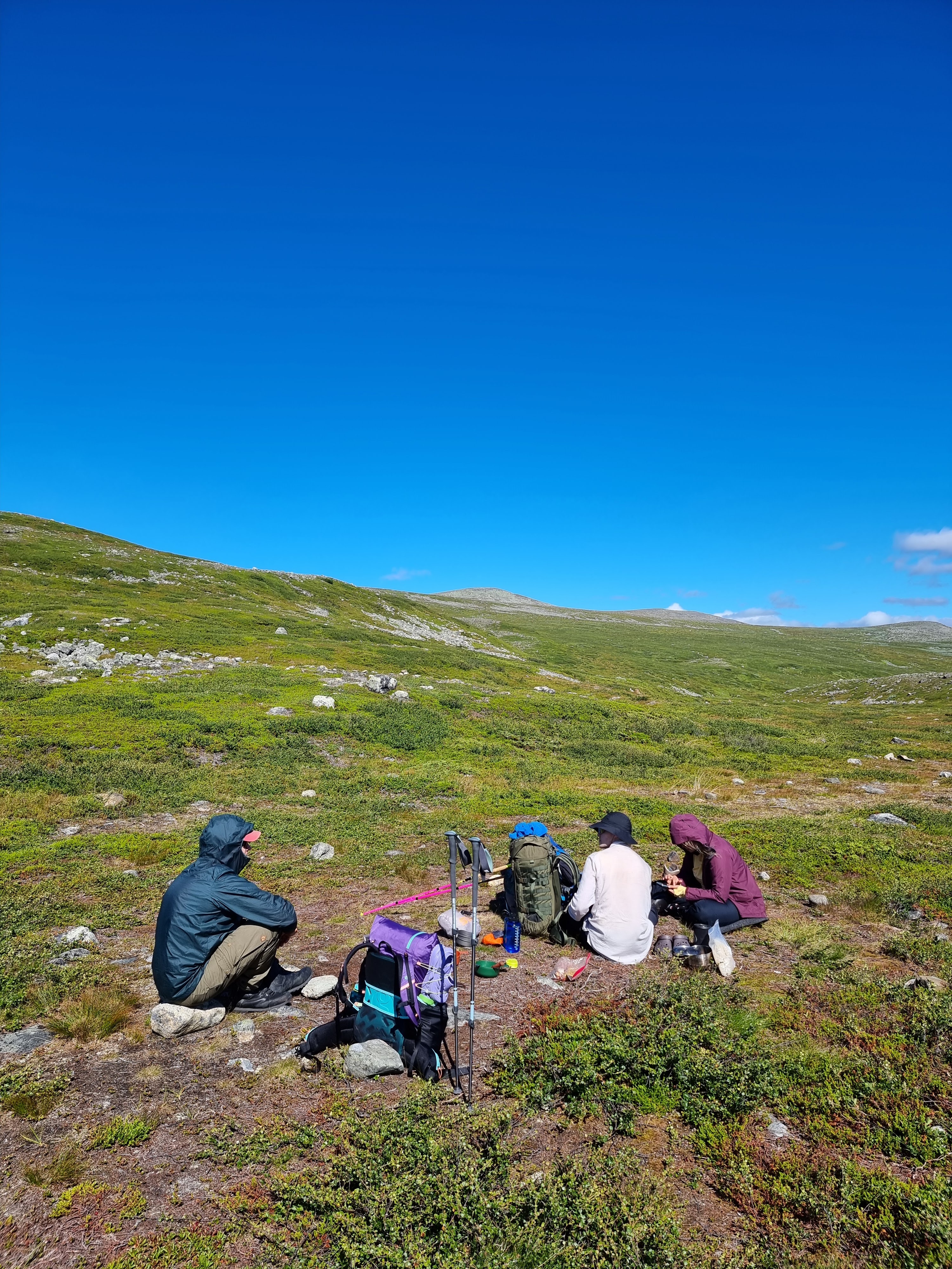 Heti kun pääsimme hiukan korkeammalle ja paikkaan, johon tuuli edes vähäsen, pysähdyimme pitämään lounastaukoa. Mäkäräiset parveilivat ympärillä, mutta tuuli puhalteli niitä välillä loitommas. Itse puin heti pitkähihaisen ohuen tuulitakin päälleni mäkäräisten vuoksi, mutta Tommi pärjäsin hyvin merinovillaisella t-paidalla.
