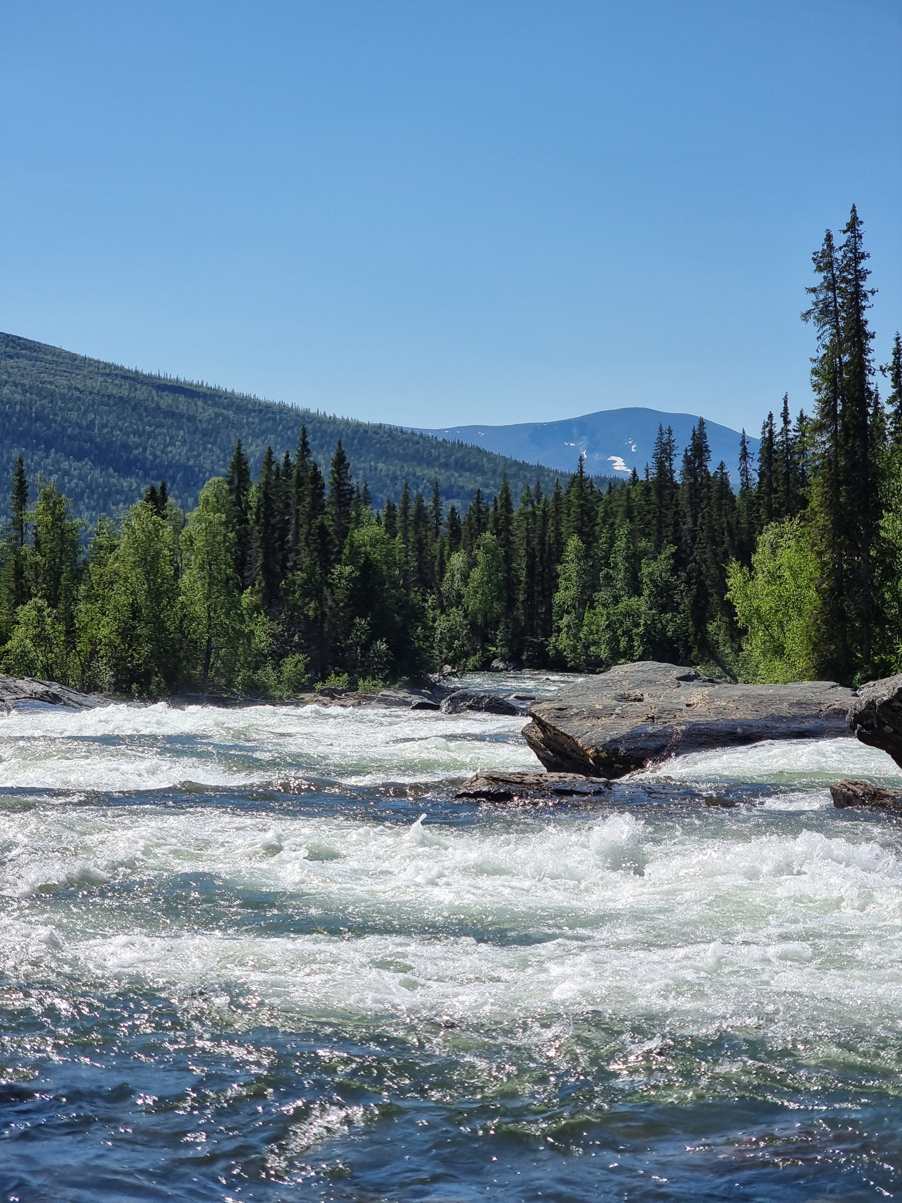 Linnuntietä seitsemän kilometrin pituinen ja alaspäin viettävä reitti laaksossa meni yllättävän nopeasti ja oli helppoa kuljettavaa. Silti se puudutti. Vasemmalla tönöttävä Tjahkelij antoi koko ajan osviittaa, kuinka paljon matkaa oli jäljellä. Pysähdyimme pätkän viimeiselle sillalle huilaamaan ja täydentämään vesivarantoja. Vaikka olimme kiirehtineet koko päivän ja maasto oli helppokulkuista, painavat rinkat, helle, hyttyset ja kuorivaatteissa hikoilu oli hidastanut matkantekoa. Saavuimme ylitysveneille turkoosin veden äärelle vasta illalla yhdeksän jälkeen.