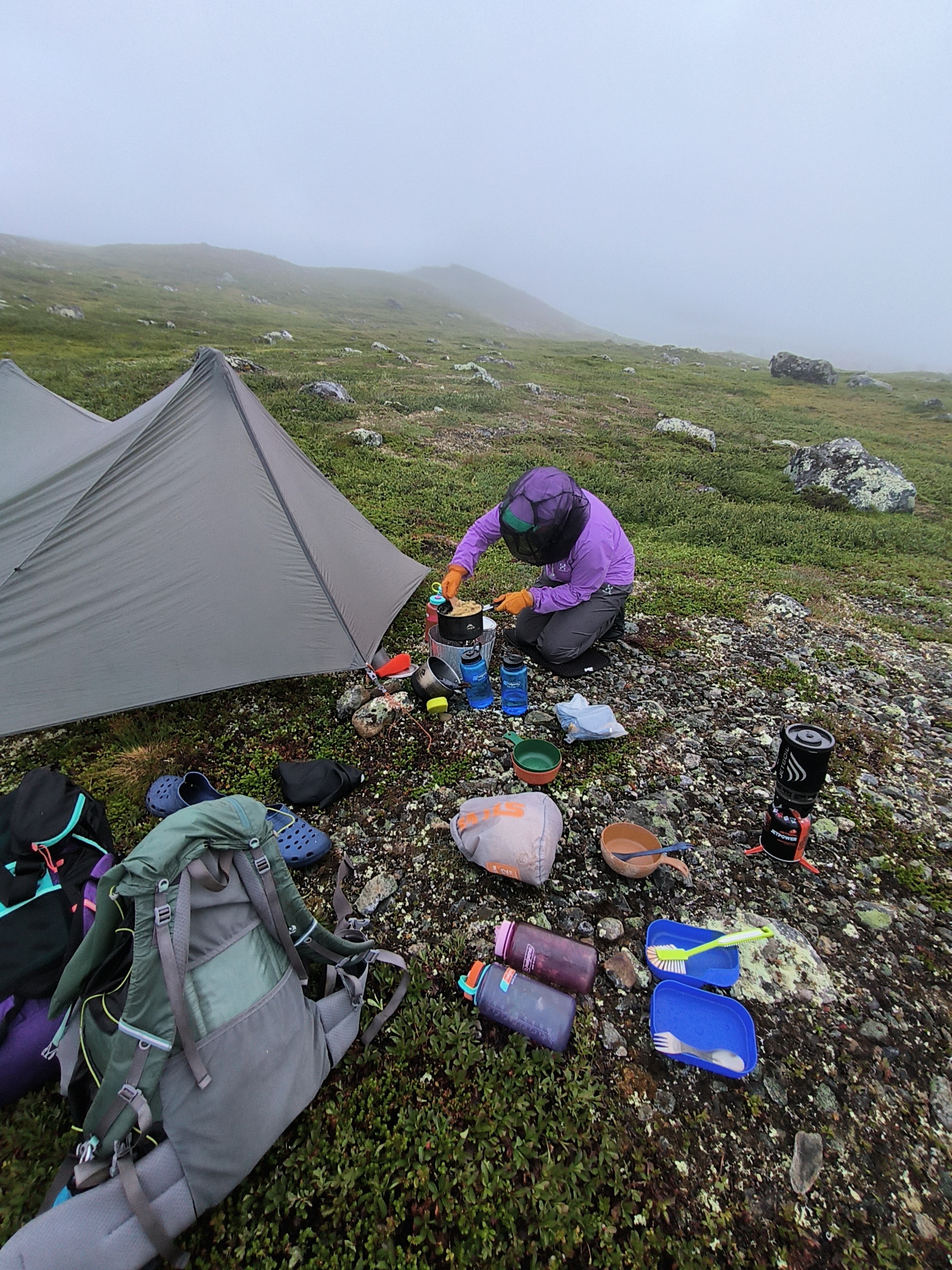 Matka puudutti ja jalat olivat muussia, mutta äkkiä sitä oltiin taas korkeuksissa. Klo 23 olimme kokkaamassa iltapalaa. Sumu oli vienyt hyttyset mennessään, mutta mäkäräiset parveilivat niin, että hyttysverkkoa oli pidettävä päässä. Taas meni puolille öin, mutta mikäs siinä. Pääsimme kuitenkin illan päämäärään!