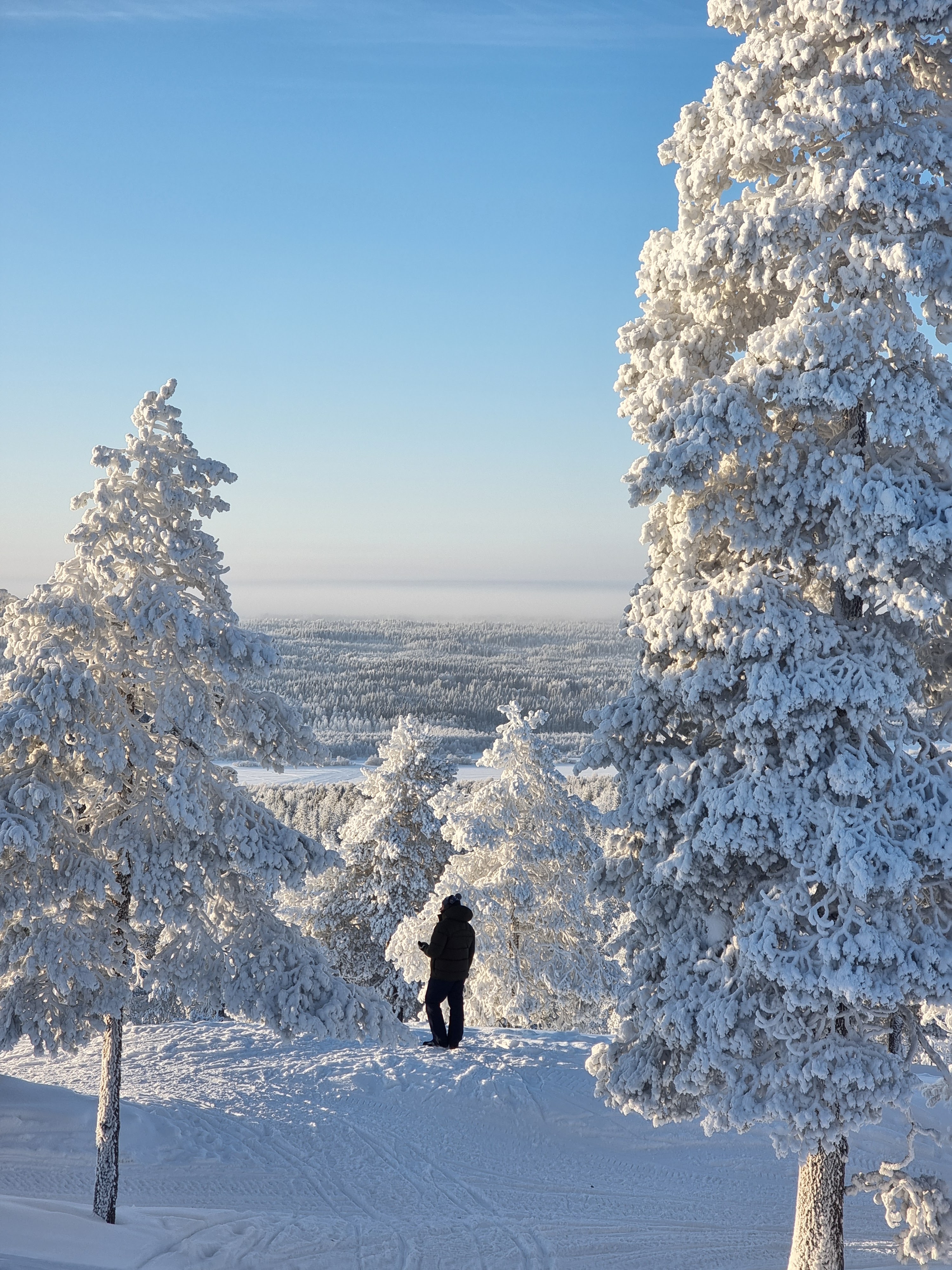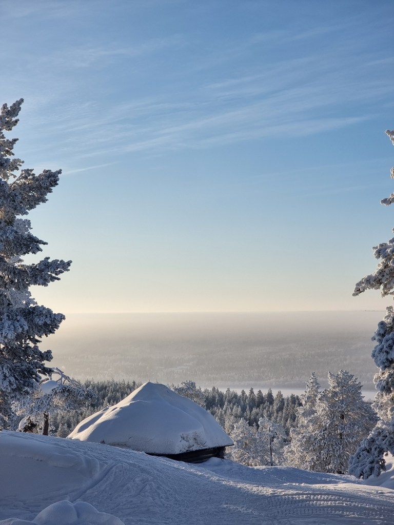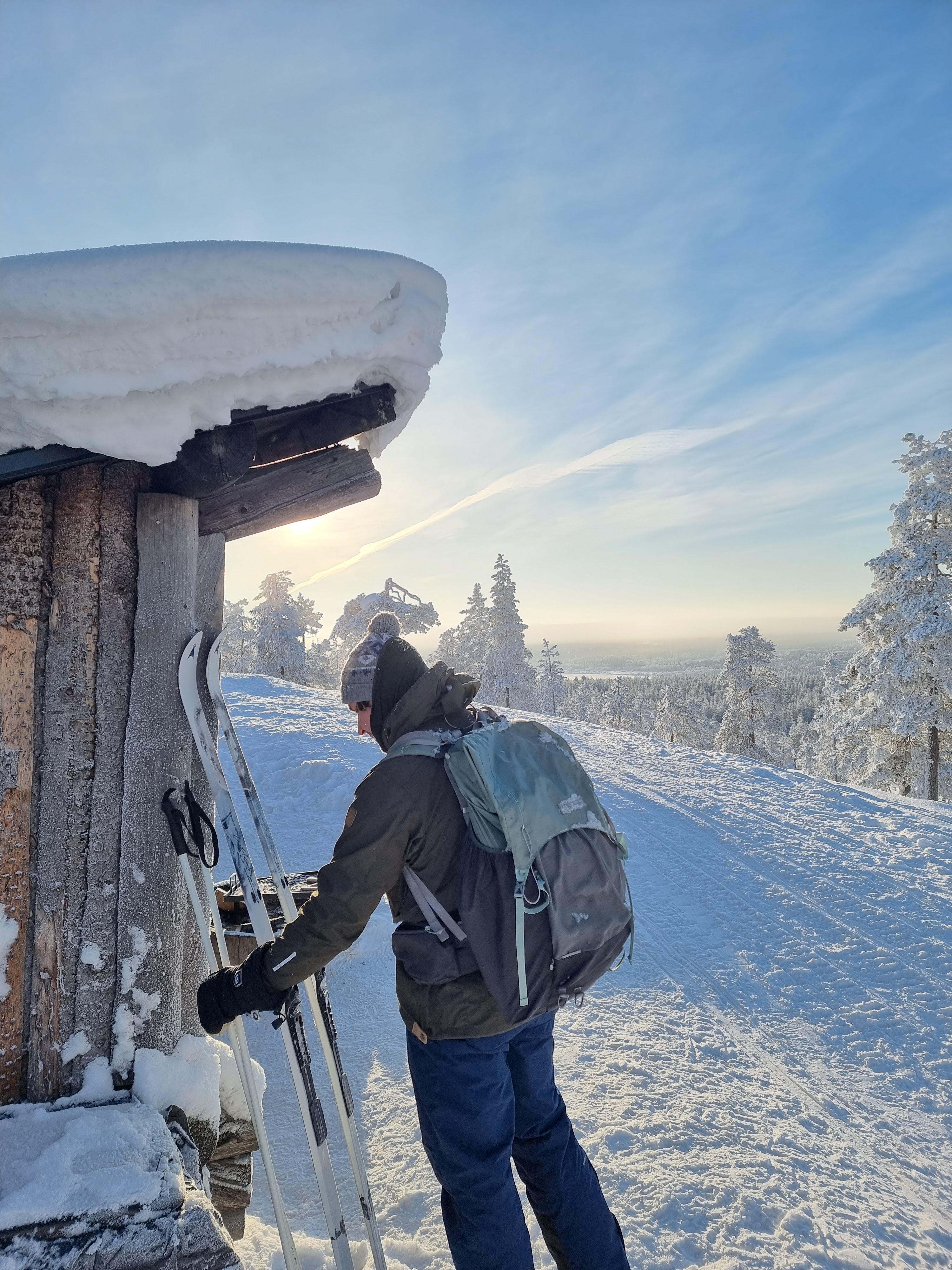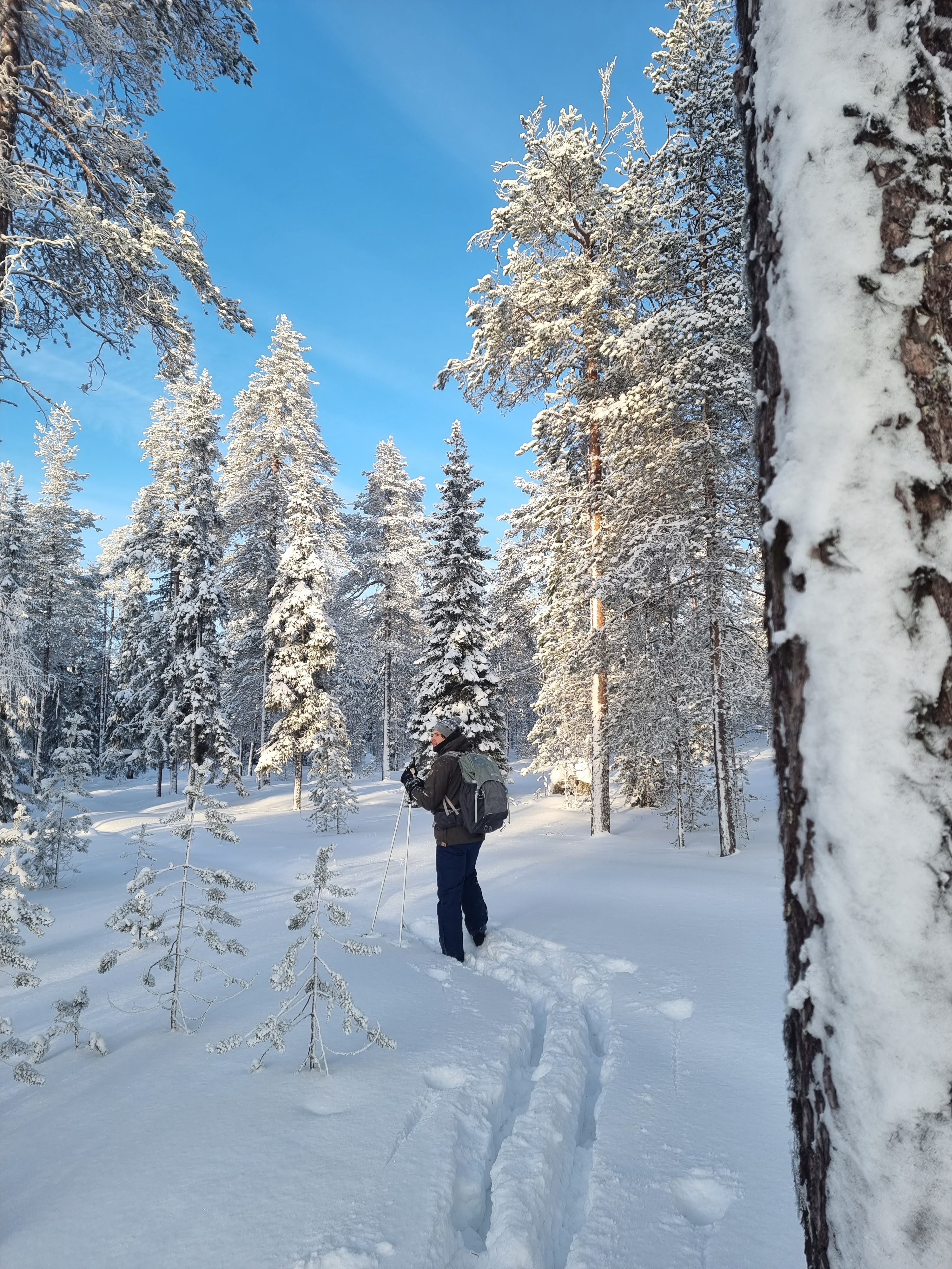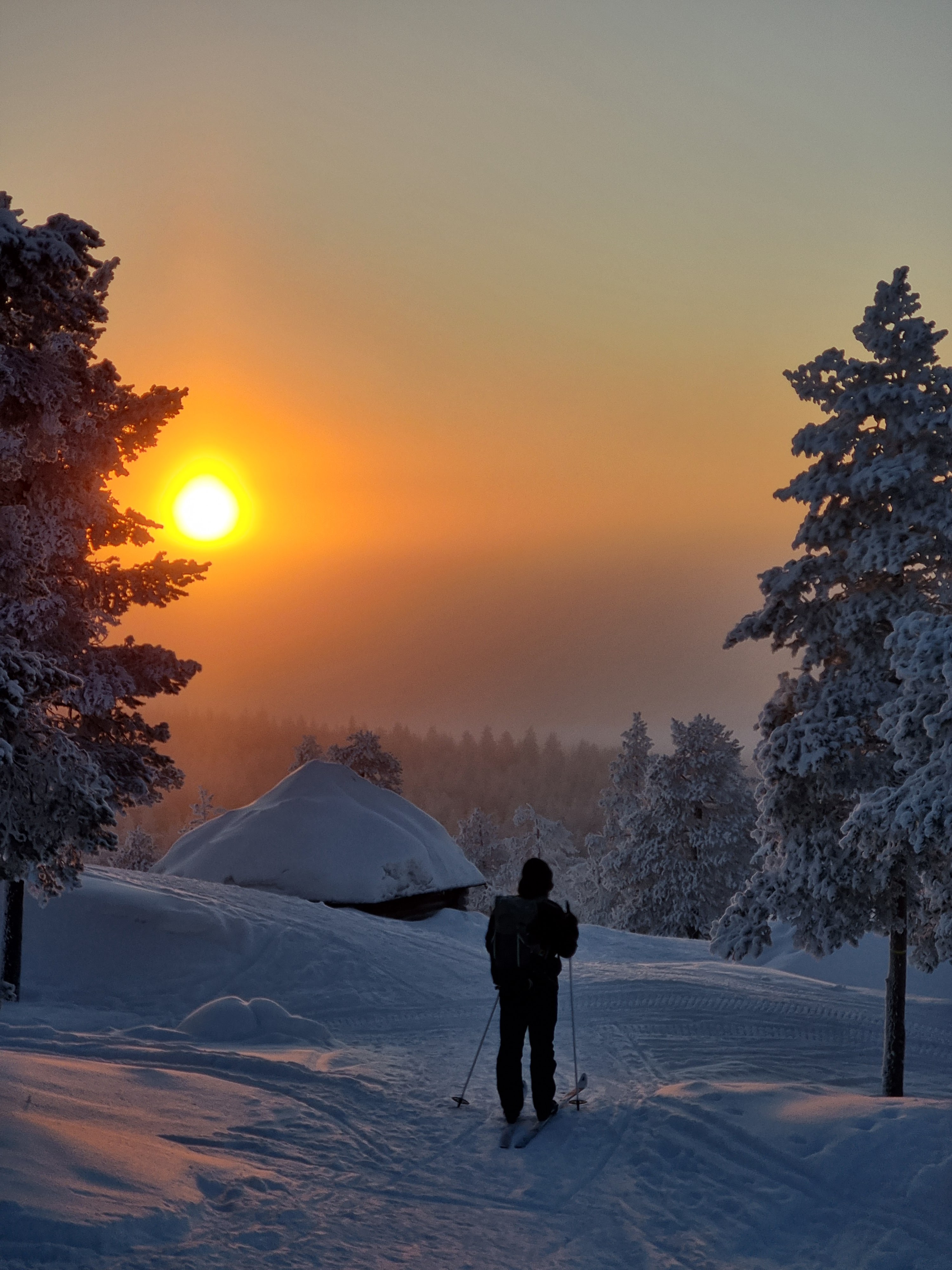 Niinpä hiihdimme hiljakseen pitkin lumisia hankia auringon maalaillessa maisemia kauniilla sävyillään. Kaikkialla kimmelsi ja pakkaslumi narisi suksen alla. Hymyilytti ja olin kiitollinen, että pääsimme kokemaan näin mahtavan talvipäivän uudessa kotikaupungissamme Rovaniemellä. Tällaisen reissun jälkeen, kun saa uuteen elinympäristöön joitain tuttuja elementtejä, tunsi olonsa taas hiukan kotoisammaksi kuin aikaisemmin.