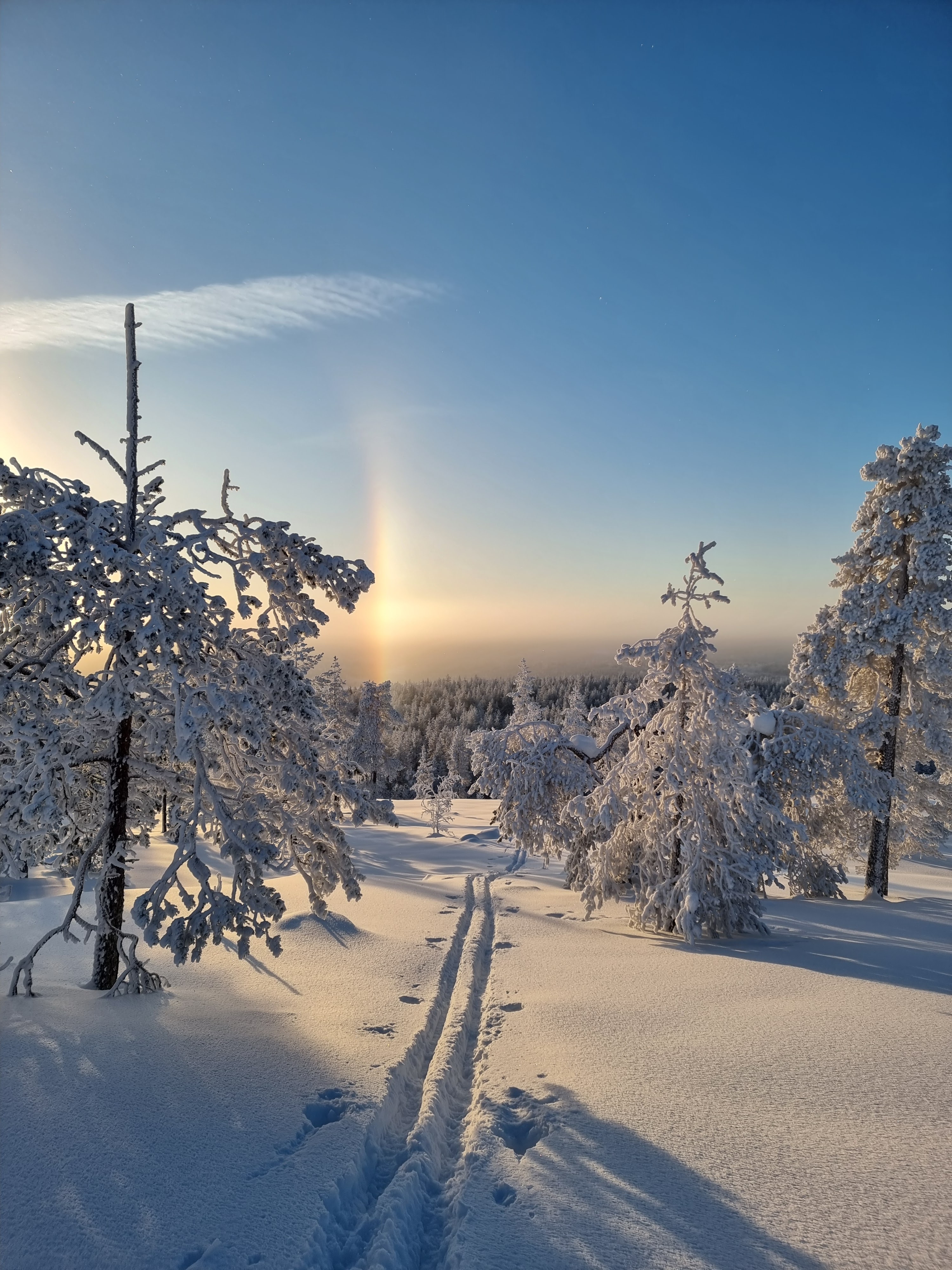 Katselimme, kuinka aurinko alkoi värjätä maisemaa tummemmilla oranssin sävyillä ja jääkiteiseen ilmaan muodoistui sateenkaarta muistuttava halo. Meillä oli otsalamput mukana, mutta päätimme lähteä takaisin siten, että olisi vielä hetki valoisaa aikaa hiihtämiseen, sillä meillä alkoi olla jo nälkä. Kylmän kestäminen vei hurjan määrän energiaa, eikä meillä ollut mukana tarpeeksi eväitä.