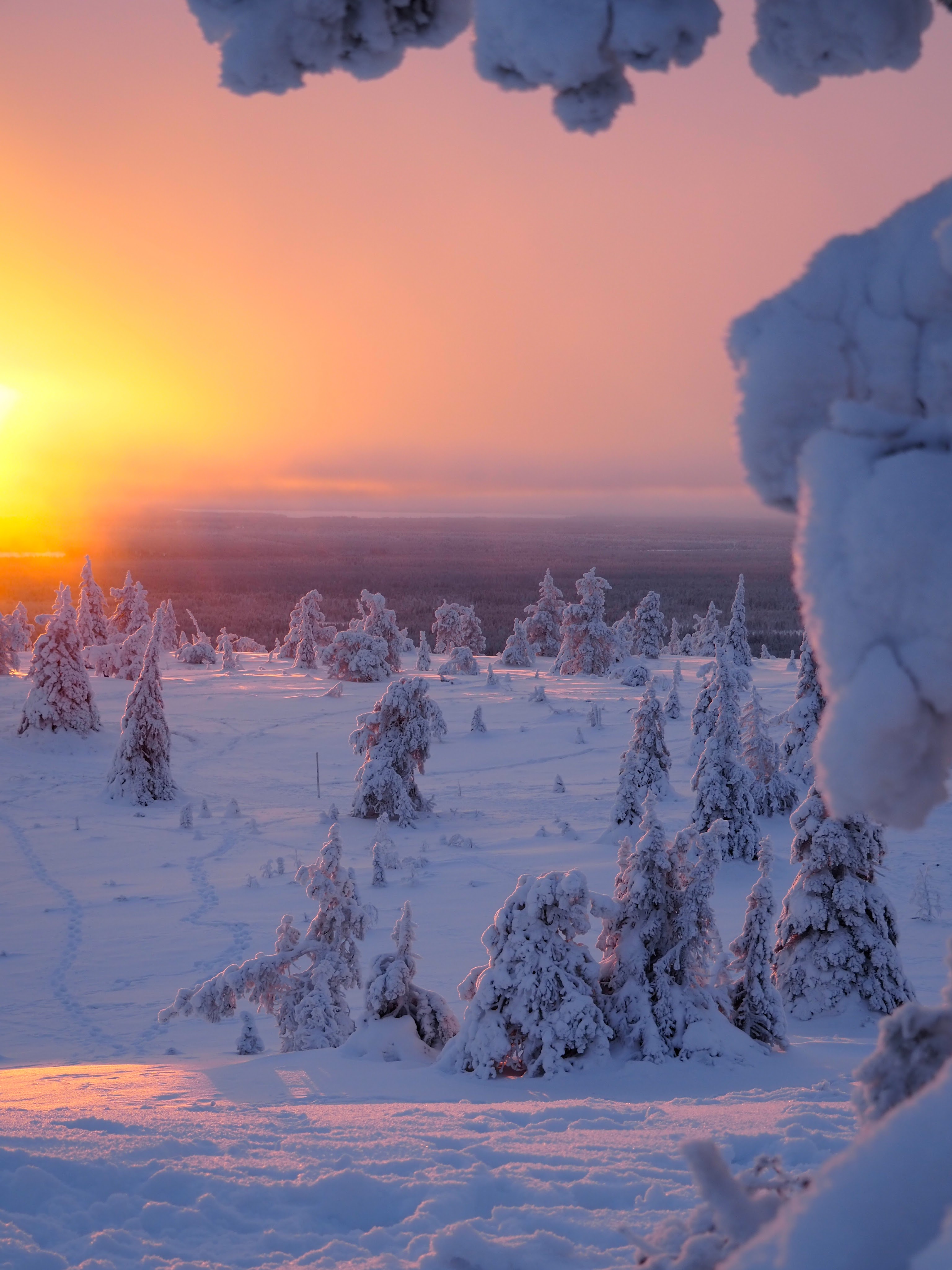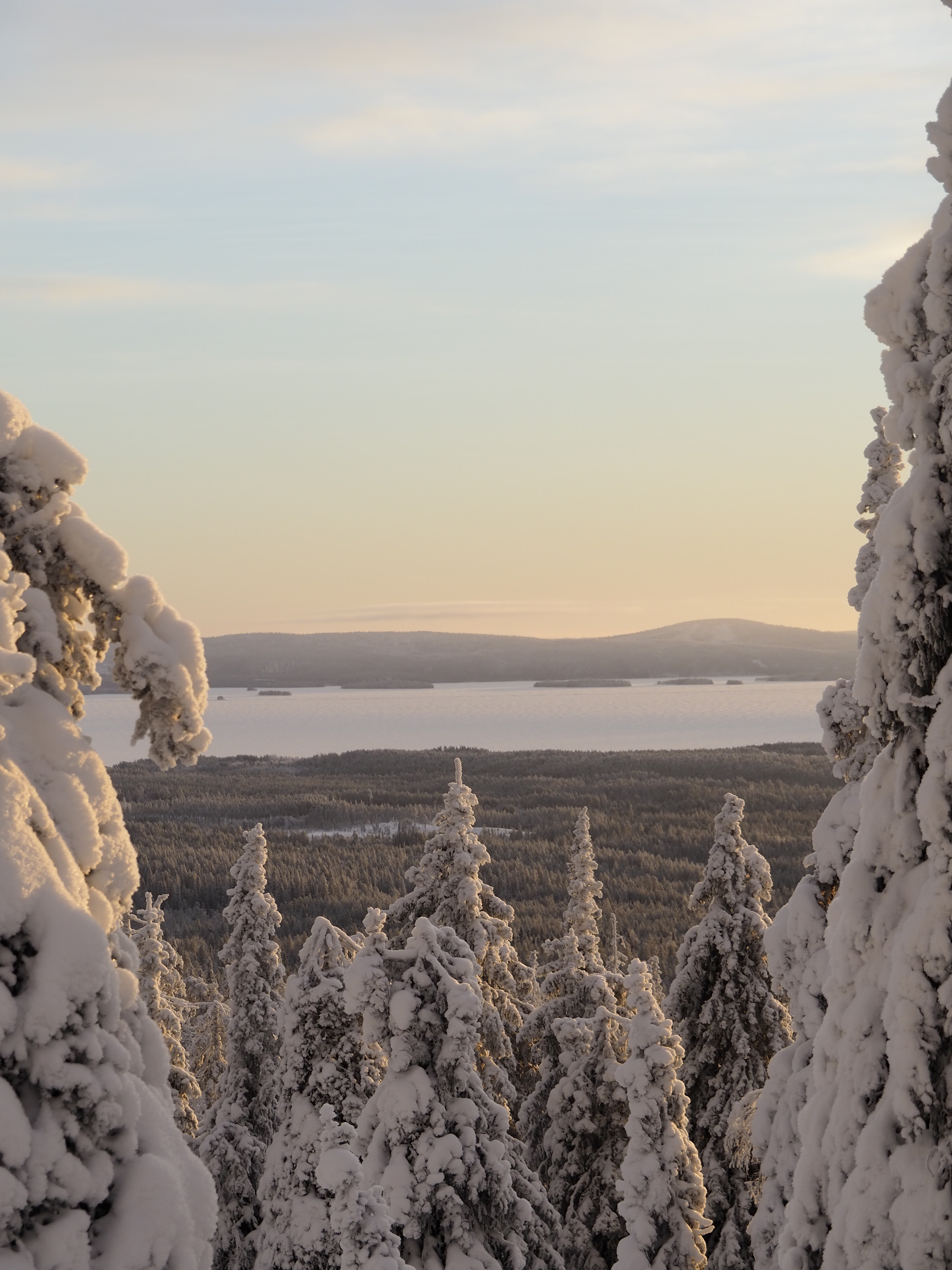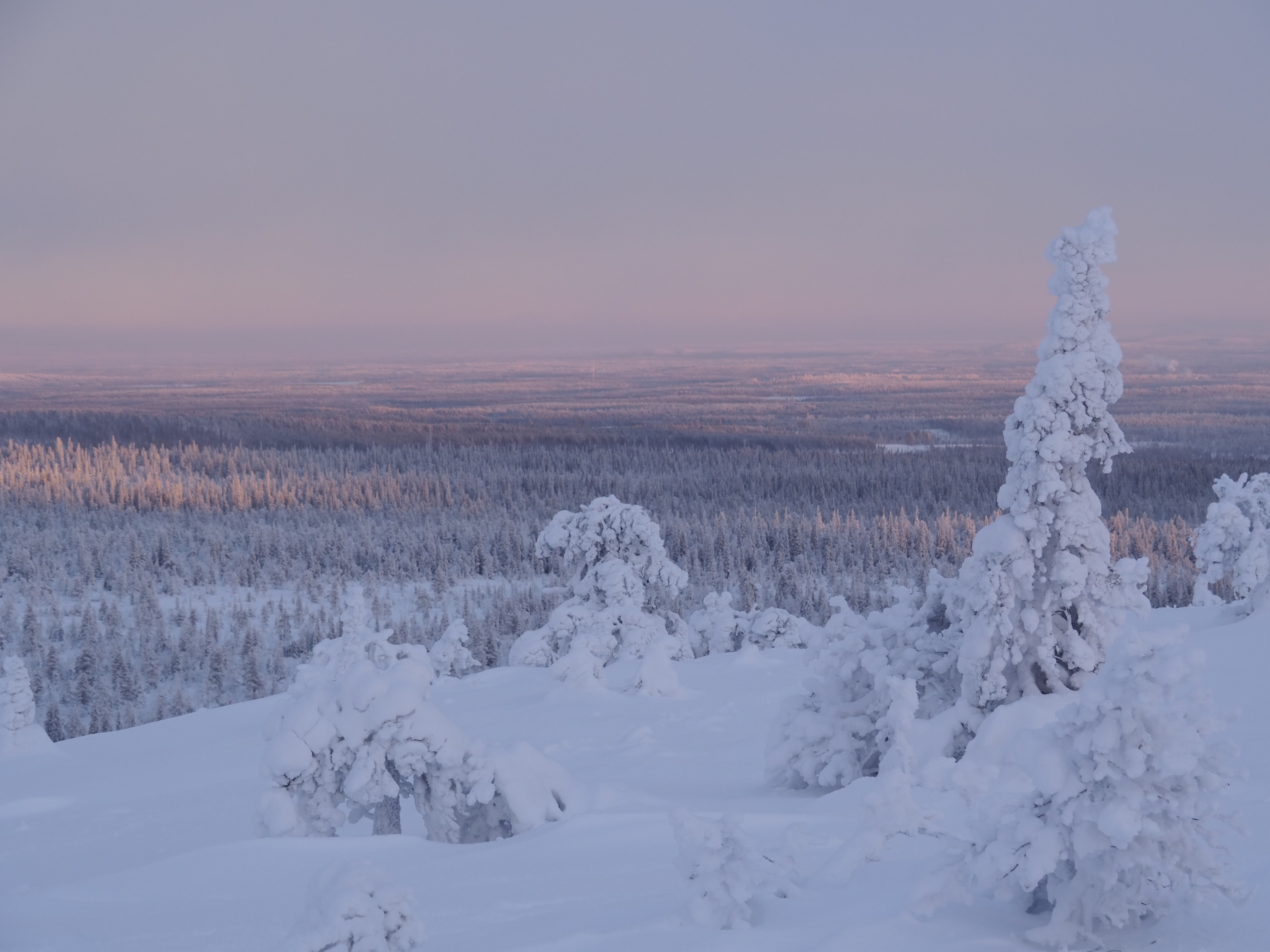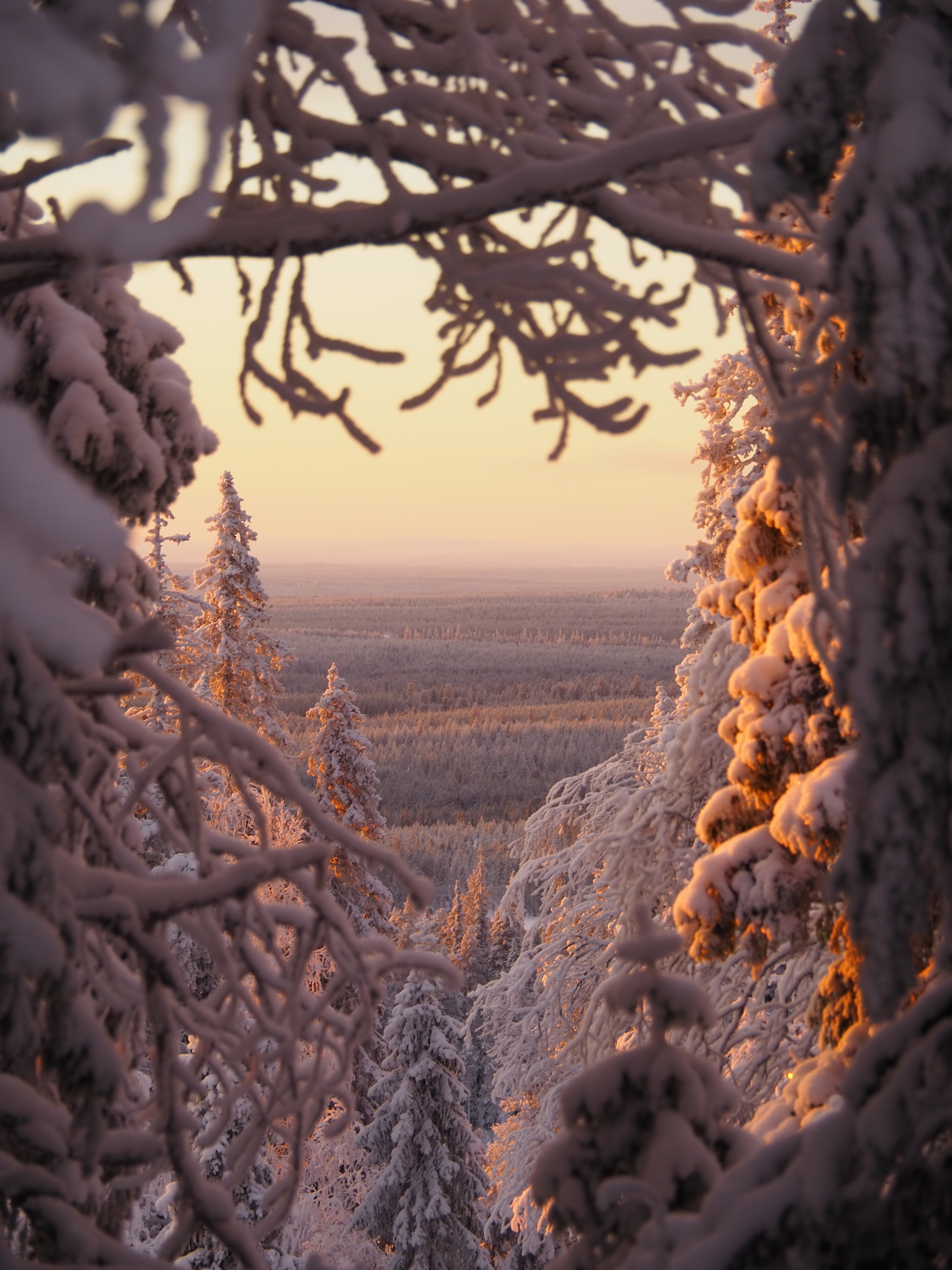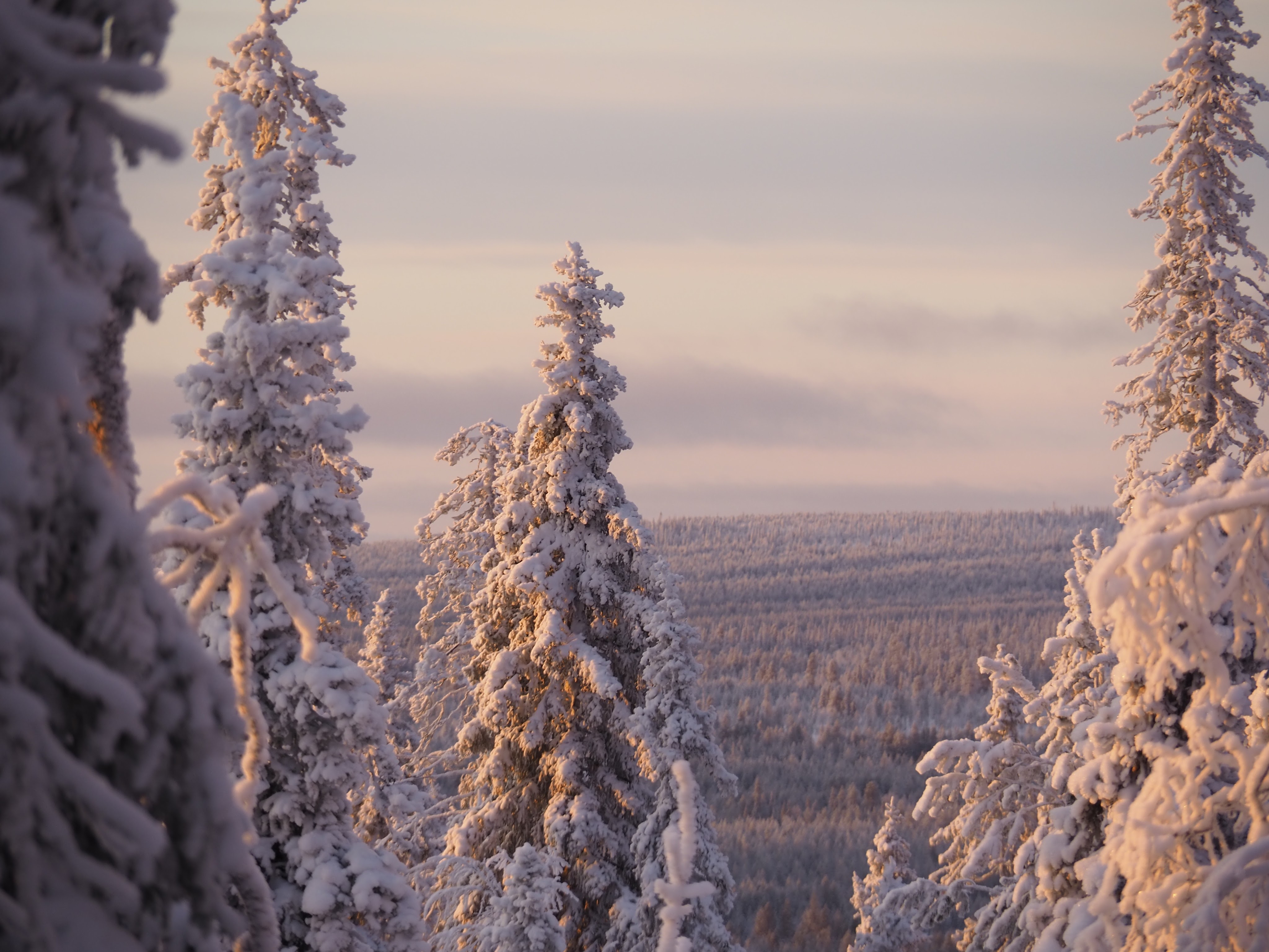 Heti polun esimmäisten metrien kohdalla sukelsimme syvälle metsään. Ympäröivä lumi sulki meidät hiljaiseen utopistiseen talvimaailmaan. Taivas oli upea, hentoja pastellisävyjä täynnä. Pakkasilma pisteli poskilla ja hengitys höyrysi. Tykkypuiden latvoja alkoi värittää oranssi aamuinen aurinko. Tommi meni edeltä ja minä perässä. Sain kuljettua aina muutaman metrin kerrallaan, mutta sitten oli pysähdyttävä hihkumaan käsittämättömän kaunista maisemaa. Sydämeni oli pakahtua. Tämä oli juuri sitä mitä kaipasin.