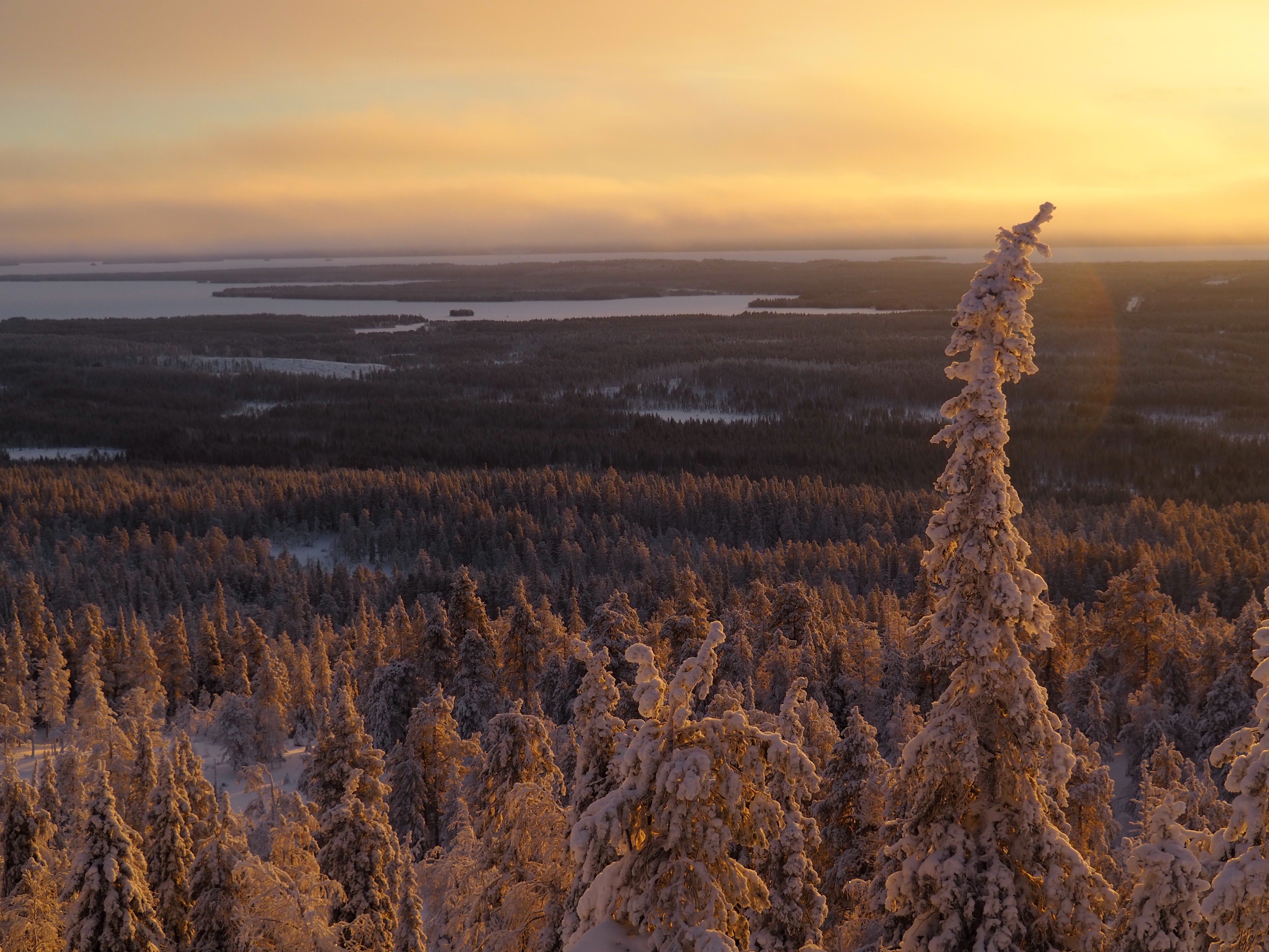 Ohitsemme pyyhälsi joku metsäsuksilla. Kuului naurua, kameroiden räpsymistä ja droonin pärinää. Lakikuusikoiden välissä puikkelehti ihmisiä, kaikkialla risteili polkuja. Jokainen kuvasi, droonilla, GoProlla, Insta360-kepillä, järjestelmäkameralla tai puhelimella. Ihmiset etsivät täydellisen kuvan paikkaa, muutama poseerasi. Monet seisoivat paikoillaan kamera suunnattuna parhaaseen auringon värjäämään maisemaan. Ihan jokainen tänne tullut ihminen halusi ikuistaa Riisitunturin, ja niin minäkin.
